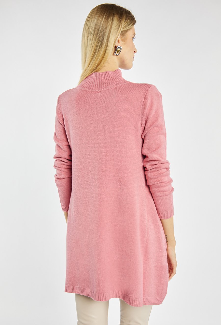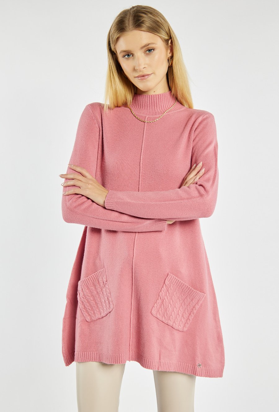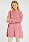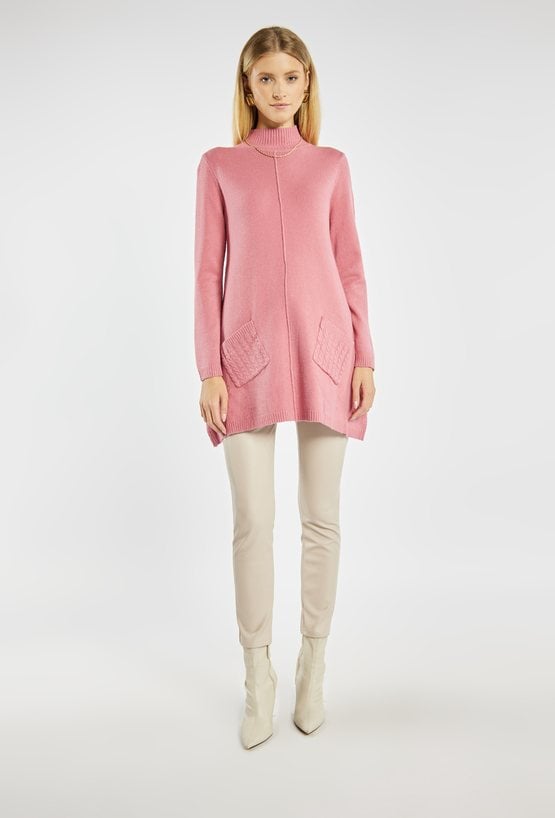Długi sweter z ozdobnym przeszyciem z przodu i praktycznymi kieszeniami. Sweter idealny na chłodniejsze dni. Luźny krój zapewnia wygodę, a subtelne detale dodają mu eleganckiego charakteru. Modelka na zdjęciu ma 177 cm wzrostu i prezentuje rozmiar S/M.