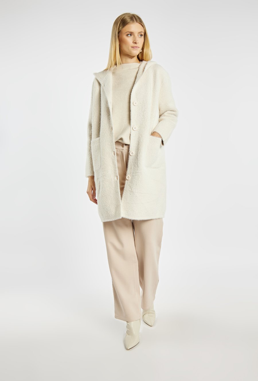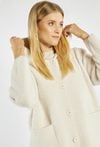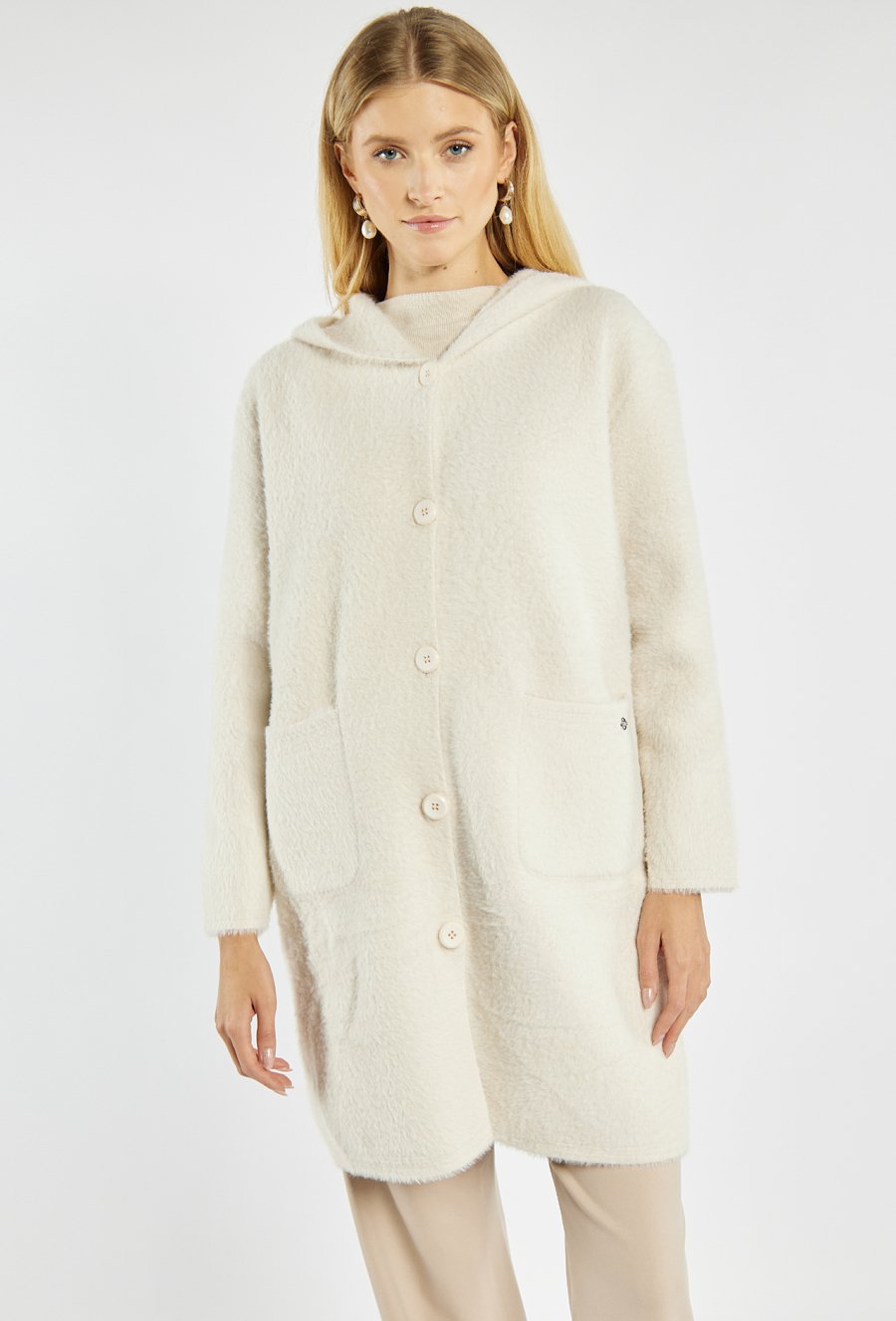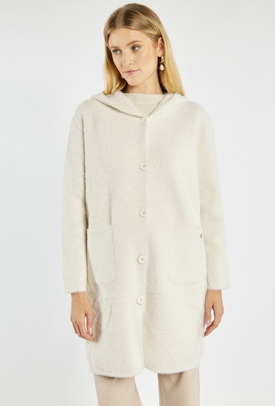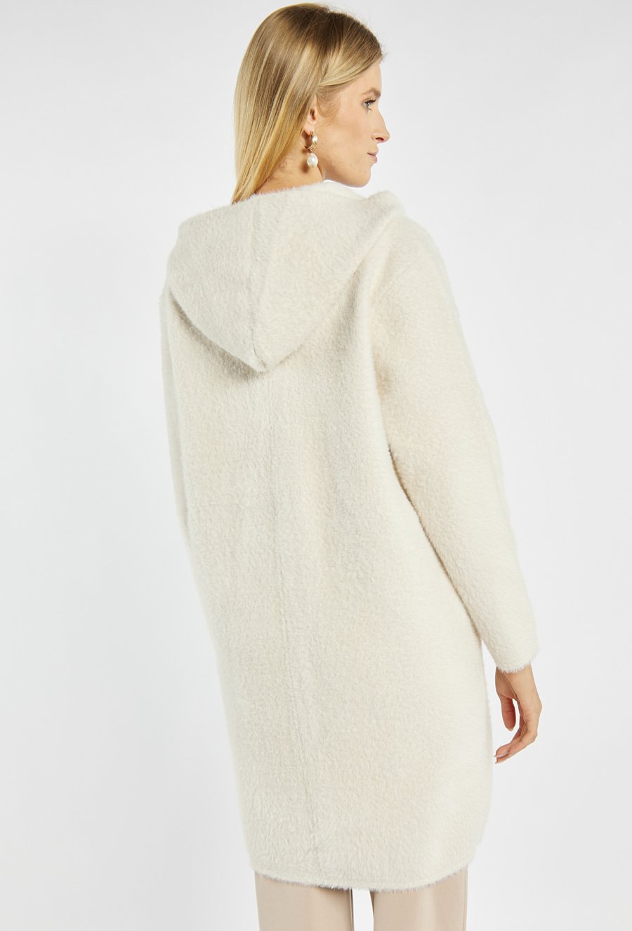 Miękki, długi sweter z kapturem zapinany na guziki. Sweter z wygodnymi kieszeniami po bokach. Idealny na chłodniejsze dni, sprawdzi się zarówno w casualowych, jak i bardziej eleganckich stylizacjach. Modelka na zdjęciu ma 177 cm wzrostu i prezentuje rozmiar S/M.
