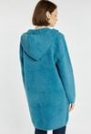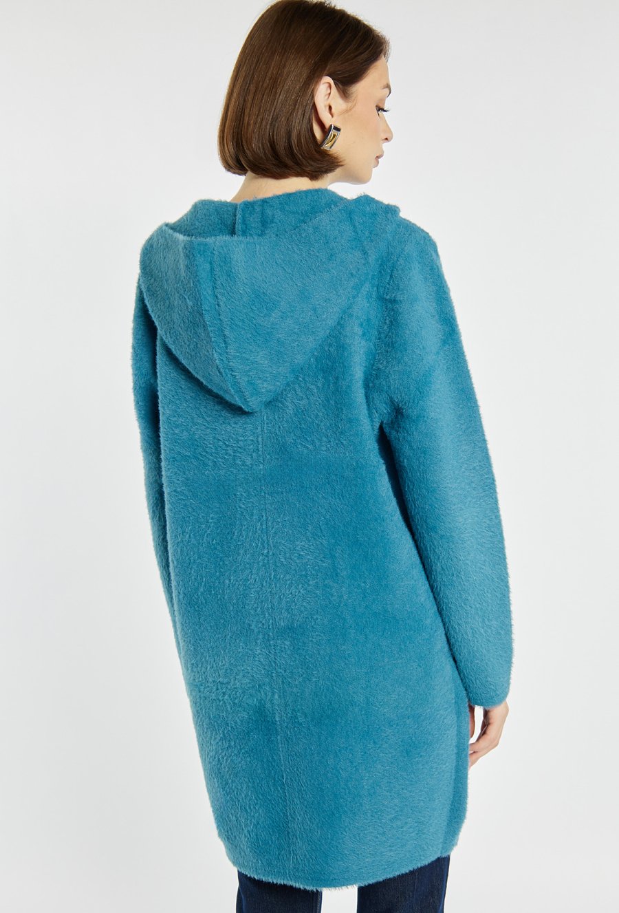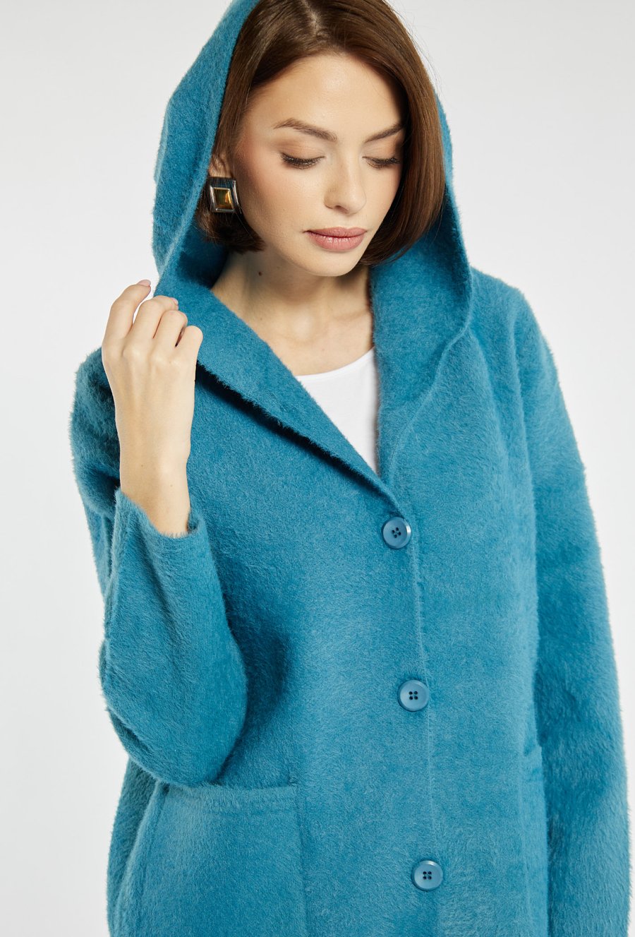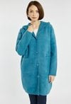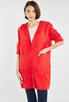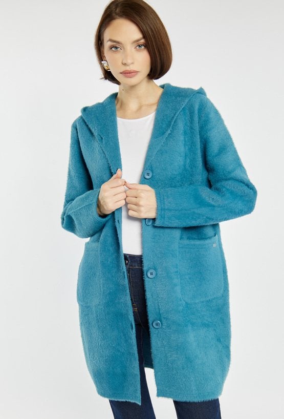 Miękki, długi sweter z kapturem zapinany na guziki. Sweter z wygodnymi kieszeniami po bokach. Idealny na chłodniejsze dni, sprawdzi się zarówno w casualowych, jak i bardziej eleganckich stylizacjach. Modelka na zdjęciu ma 177 cm wzrostu i prezentuje rozmiar S/M.