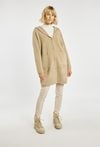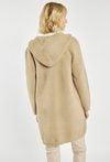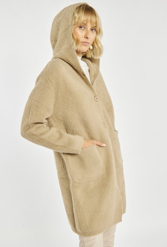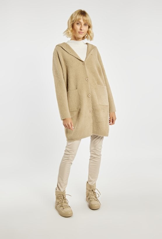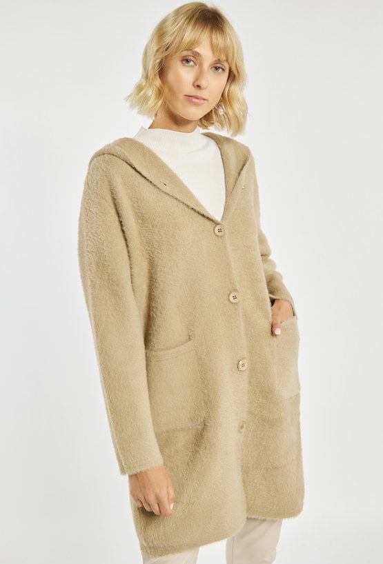 Miękki, długi sweter z kapturem zapinany na guziki. Sweter z wygodnymi kieszeniami po bokach. Idealny na chłodniejsze dni, sprawdzi się zarówno w casualowych, jak i bardziej eleganckich stylizacjach. Modelka na zdjęciu ma 177 cm wzrostu i prezentuje rozmiar S/M.