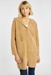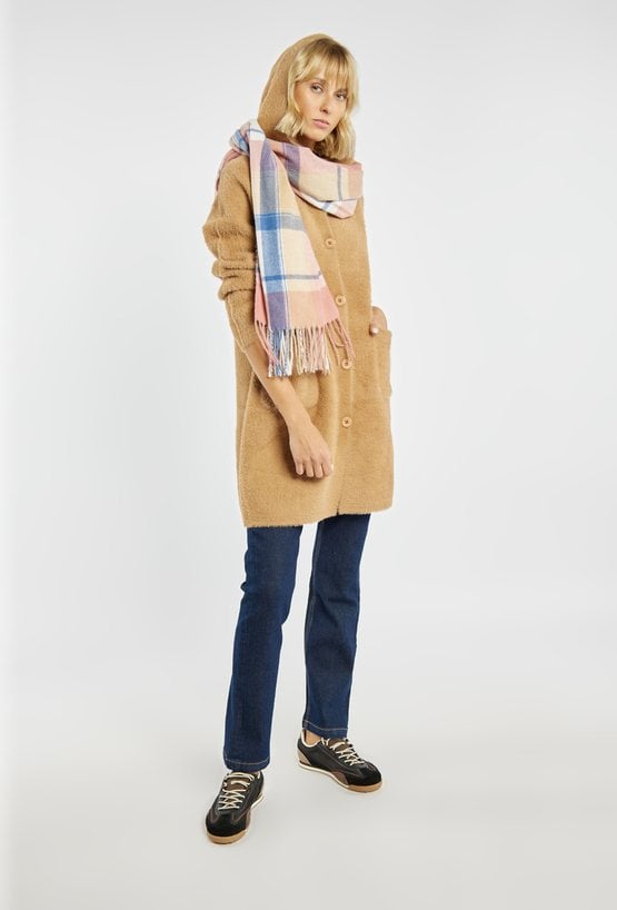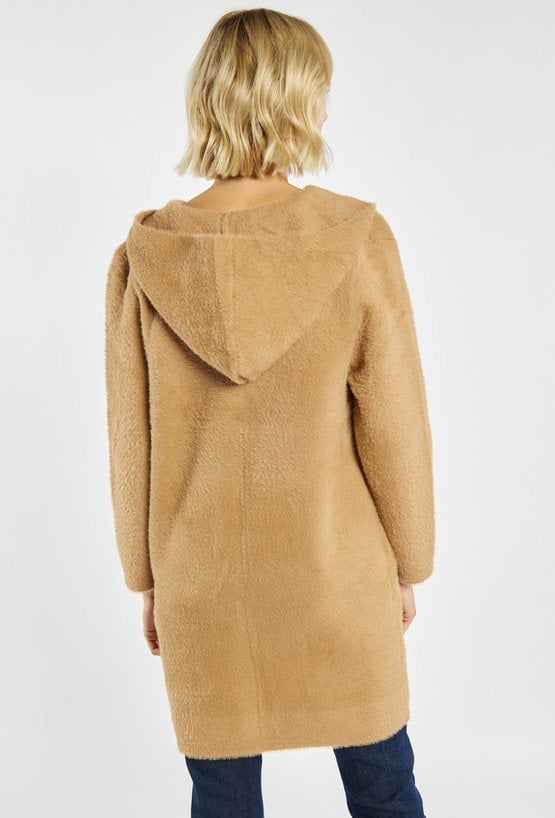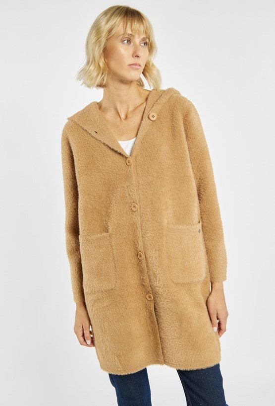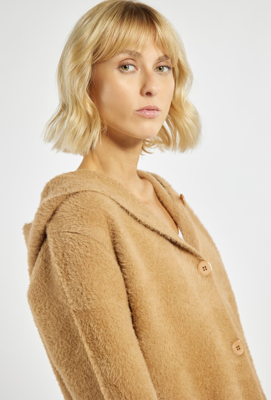 Miękki, długi sweter z kapturem zapinany na guziki. Sweter z wygodnymi kieszeniami po bokach. Idealny na chłodniejsze dni, sprawdzi się zarówno w casualowych, jak i bardziej eleganckich stylizacjach. Modelka na zdjęciu ma 177 cm wzrostu i prezentuje rozmiar S/M.