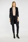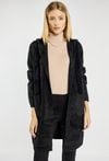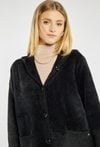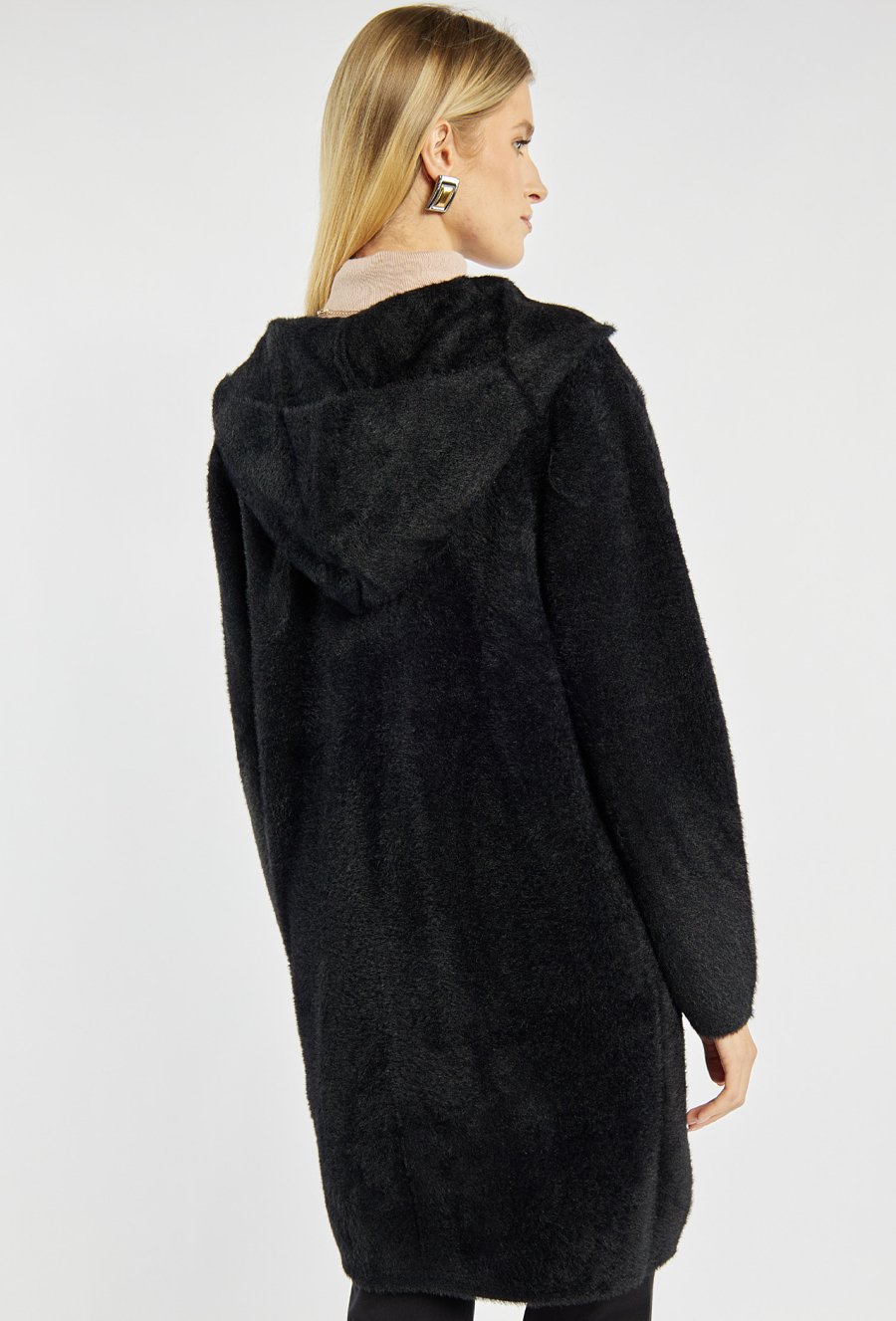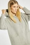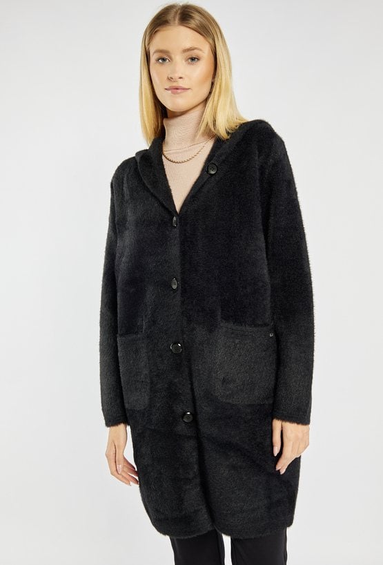 Miękki, długi sweter z kapturem zapinany na guziki. Sweter z wygodnymi kieszeniami po bokach. Idealny na chłodniejsze dni, sprawdzi się zarówno w casualowych, jak i bardziej eleganckich stylizacjach. Modelka na zdjęciu ma 177 cm wzrostu i prezentuje rozmiar S/M.