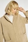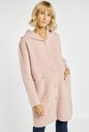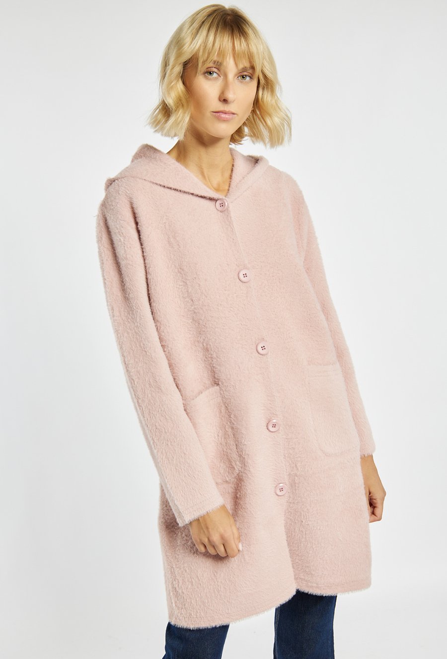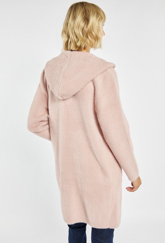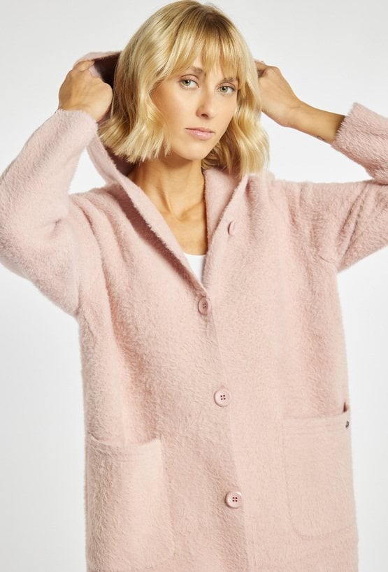 Miękki, długi sweter z kapturem zapinany na guziki. Sweter z wygodnymi kieszeniami po bokach. Idealny na chłodniejsze dni, sprawdzi się zarówno w casualowych, jak i bardziej eleganckich stylizacjach. Modelka na zdjęciu ma 177 cm wzrostu i prezentuje rozmiar S/M.