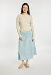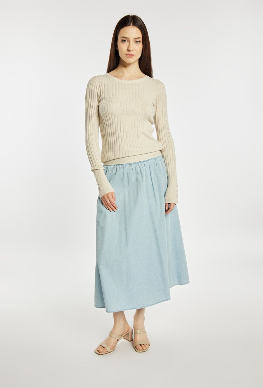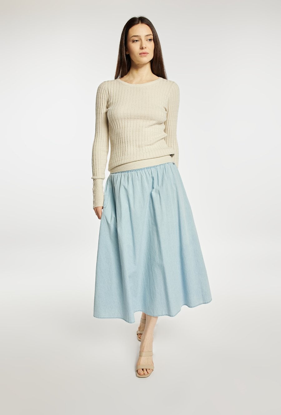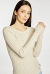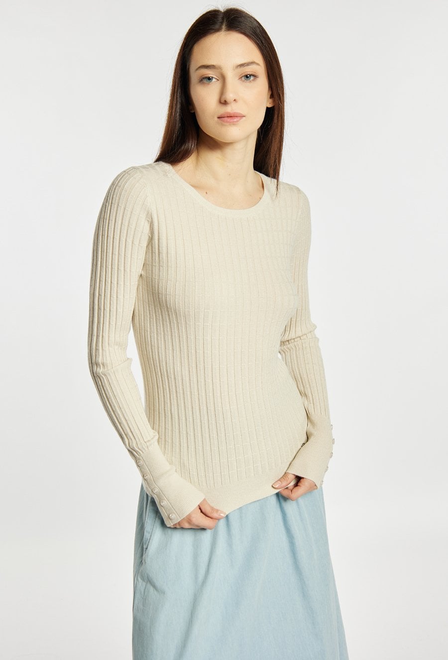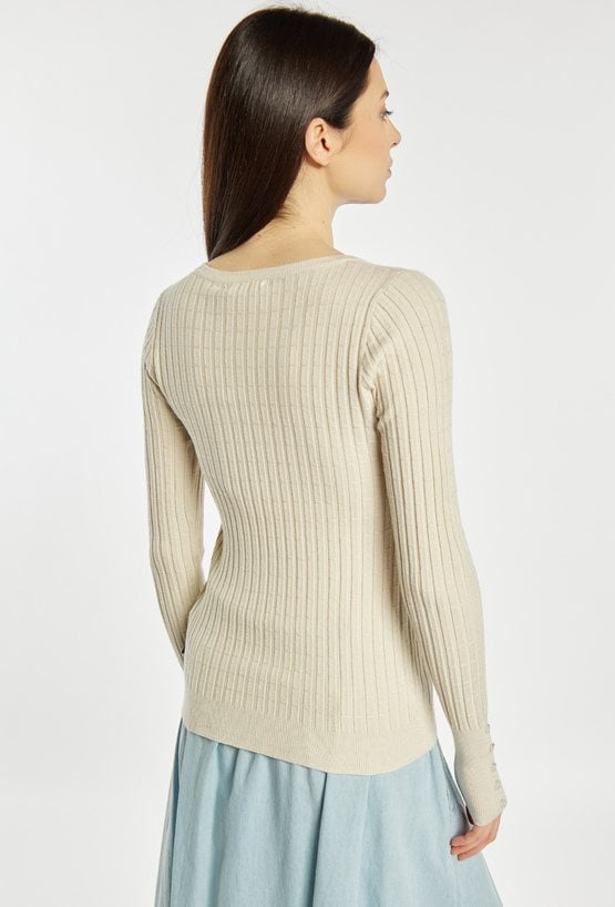 Sweter damski o dopasowanym kroju z długim rękawem. Model z klasycznym, półokrągłym dekoltem, który nadaje całości uniwersalnego charakteru. Długie rękawy wykończone subtelnymi detalami przy mankietach dodają całości elegancji. Idealny do codziennych stylizacji. Modelka na zdjęciu ma 177 cm wzrostu i prezentuje rozmiar S/M.