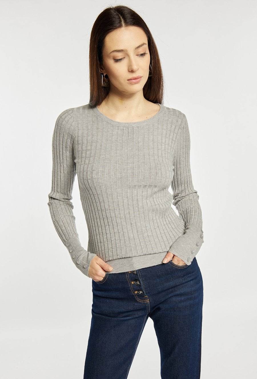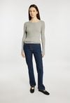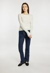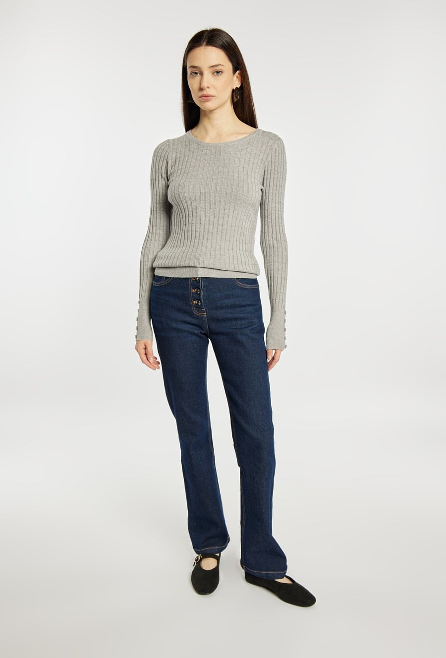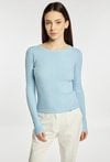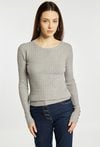 Sweter damski o dopasowanym kroju z długim rękawem. Model z klasycznym, półokrągłym dekoltem, który nadaje całości uniwersalnego charakteru. Długie rękawy wykończone subtelnymi detalami przy mankietach dodają całości elegancji. Idealny do codziennych stylizacji. Modelka na zdjęciu ma 177 cm wzrostu i prezentuje rozmiar S/M.