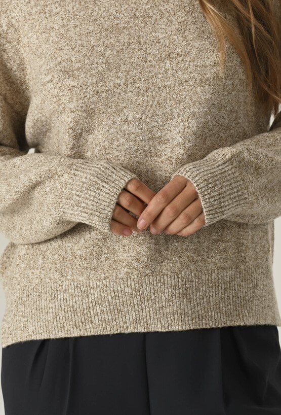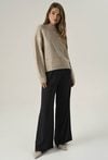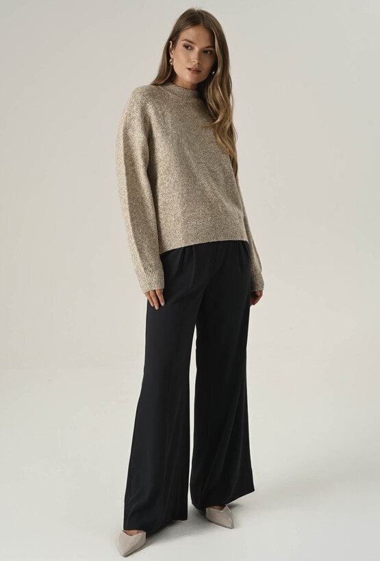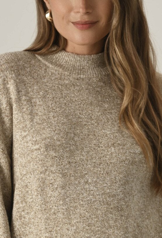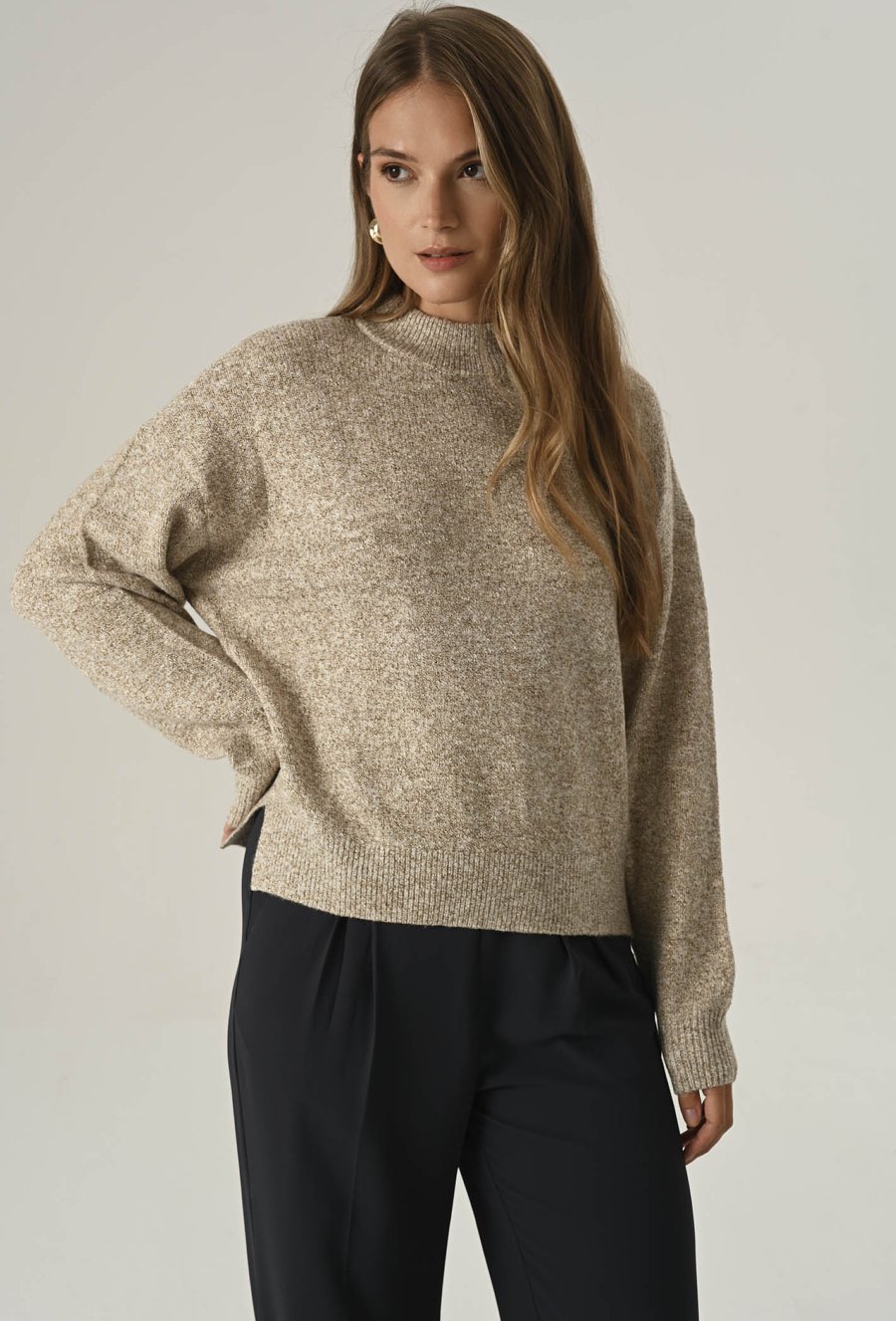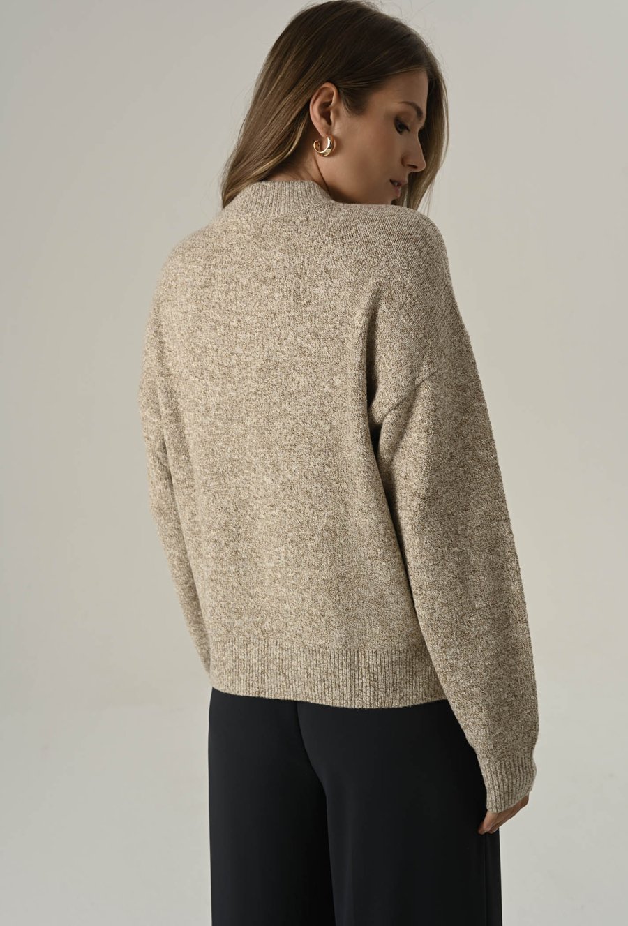 Minimalistyczny sweter o klasycznym kroju, wykonany z miękkiej przędzy z delikatną nicią metalizowaną. Subtelny połysk dodaje elegancji, zachowując przy tym uniwersalny, basicowy charakter. Idealny jako baza codziennych i bardziej wyjściowych stylizacji – świetnie wygląda solo lub pod marynarką. Modelka na zdjęciu ma 177 cm wzrostu i prezentuje rozmiar 36/S.