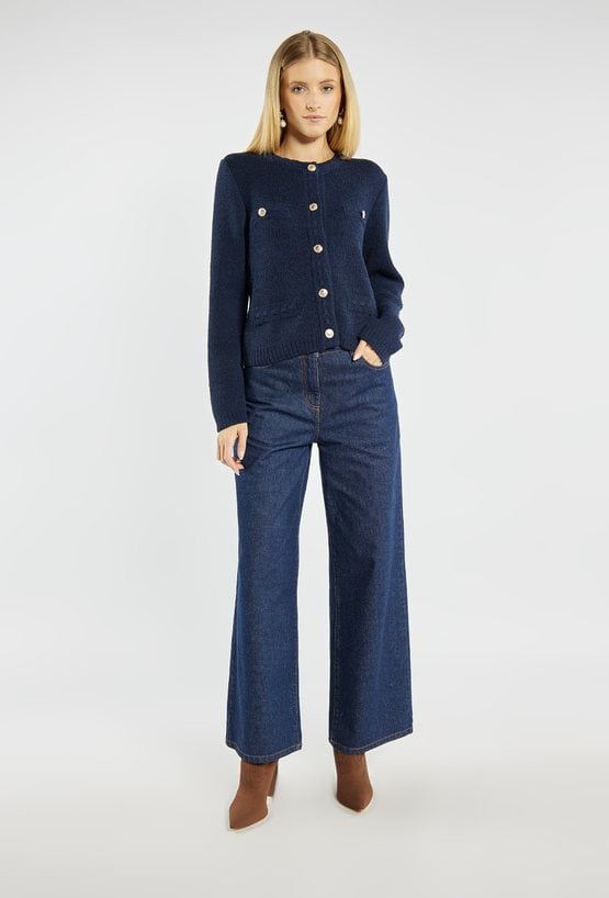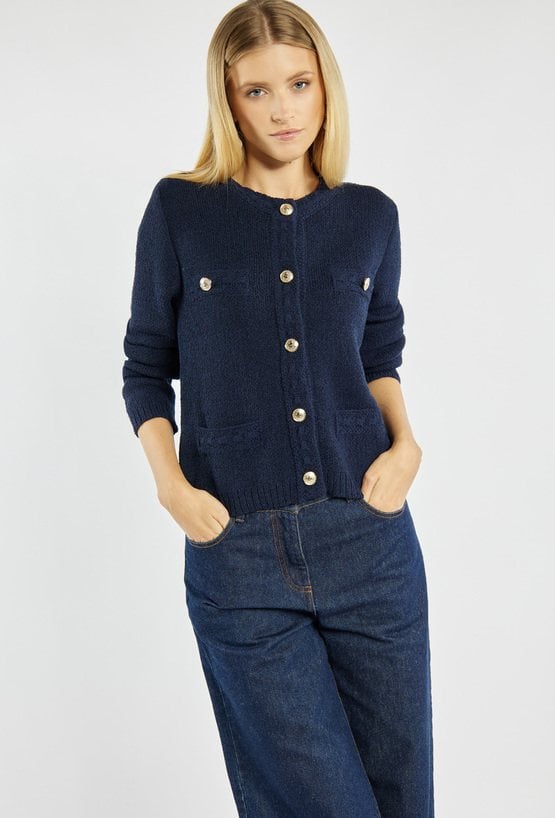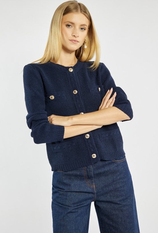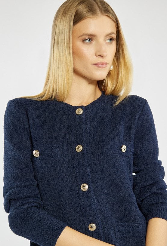 Elegancki sweter o klasycznym kroju, zapinany na ozdobne guziki. Model z okrągłym dekoltem i dwiema kieszonkami z przodu. Doskonały wybór do stylizacji zarówno codziennych, jak i bardziej formalnych- nadaje szyku i kobiecej elegancji. Modelka na zdjęciu ma 177 cm wzrostu i prezentuje rozmiar S.