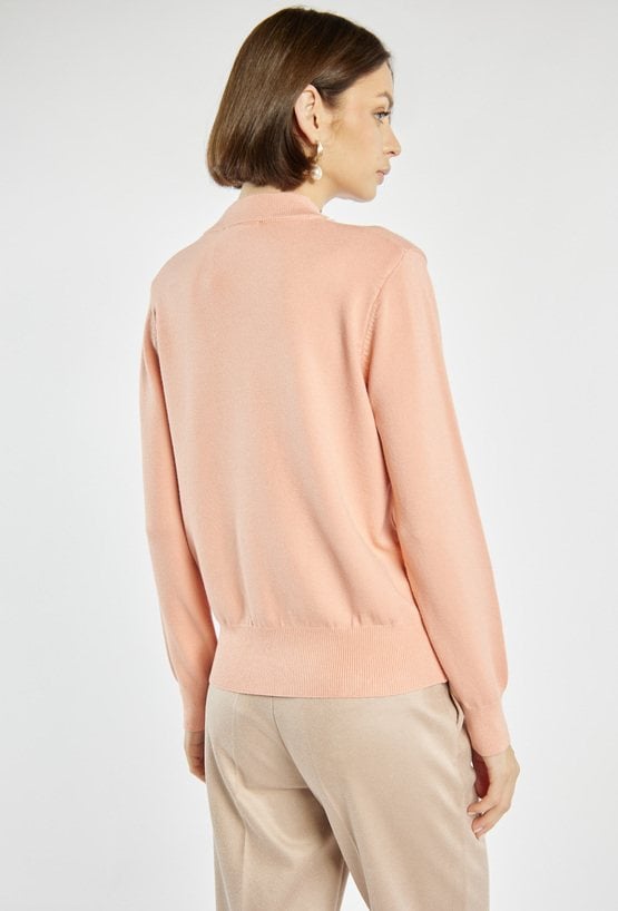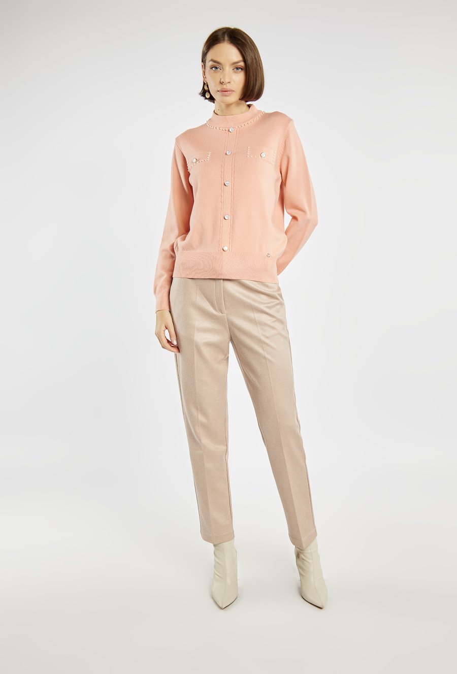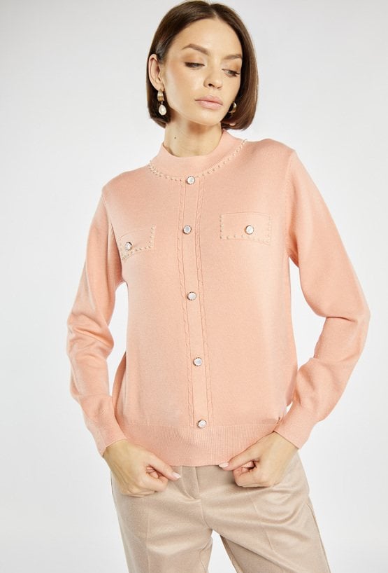 Elegancki sweter zapinany na ozdobne guziki, z delikatnym zdobieniem przy kieszonkach i dekolcie. Prosty, klasyczny fason sprawia, że będzie doskonałym uzupełnieniem zarówno codziennych, jak i bardziej formalnych stylizacji. Model występuję w kilku wariantach kolorystycznych. Modelka na zdjęciu ma 177 cm wzrostu i prezentuje rozmiar S/M.