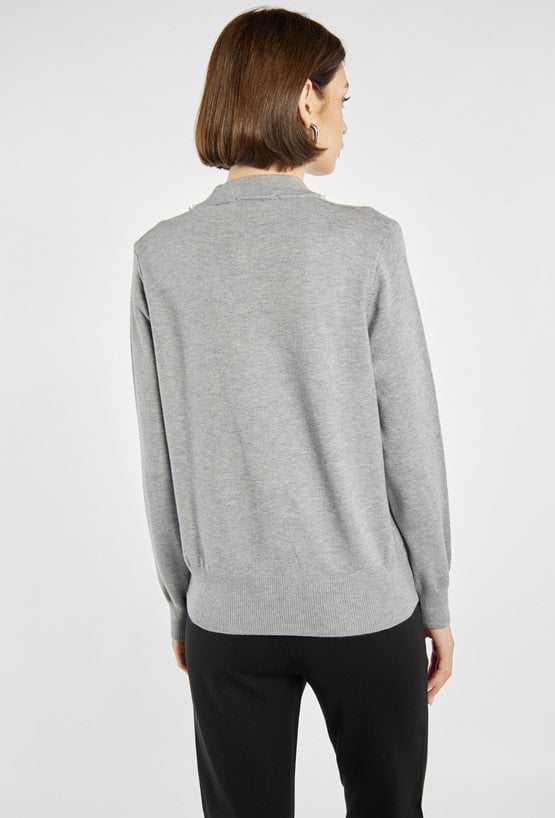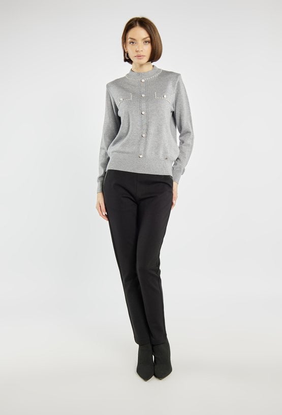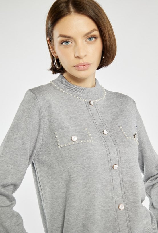 Elegancki sweter zapinany na ozdobne guziki, z delikatnym zdobieniem przy kieszonkach i dekolcie. Prosty, klasyczny fason sprawia, że będzie doskonałym uzupełnieniem zarówno codziennych, jak i bardziej formalnych stylizacji. Model występuję w kilku wariantach kolorystycznych. Modelka na zdjęciu ma 177 cm wzrostu i prezentuje rozmiar S/M.