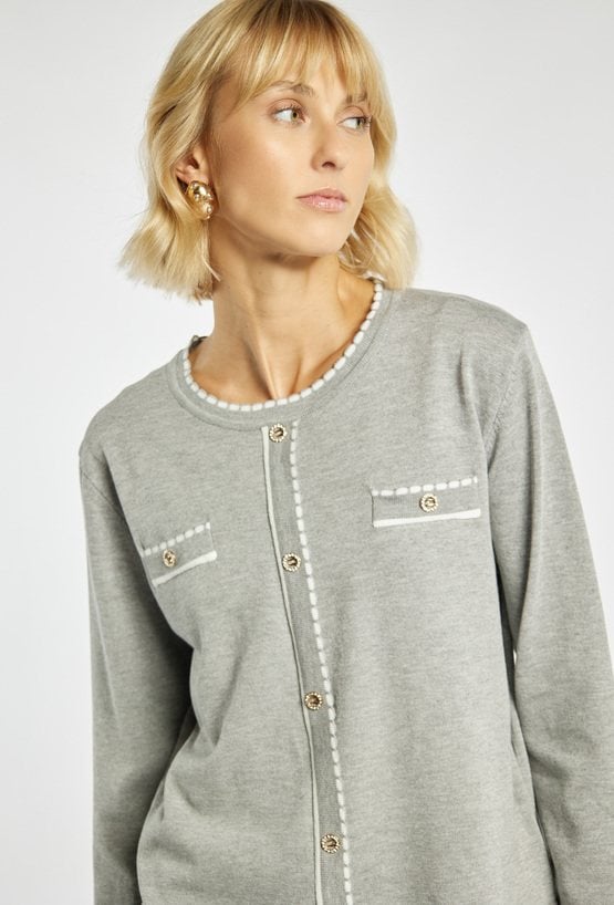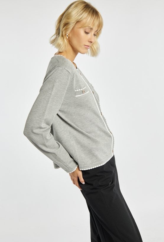 Sweter damski o eleganckim kroju, ozdobiony kontrastowymi, białymi lamówkami. Model z długim rękawem i imitacją kieszeni z przodu, idealnie wpisuje się w styl smart casual. Świetnie komponuje się zarówno z eleganckimi spodniami, jak i spódnicą. Modelka na zdjęciu ma 177 cm wzrostu i prezentuje rozmiar S/M.