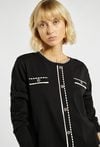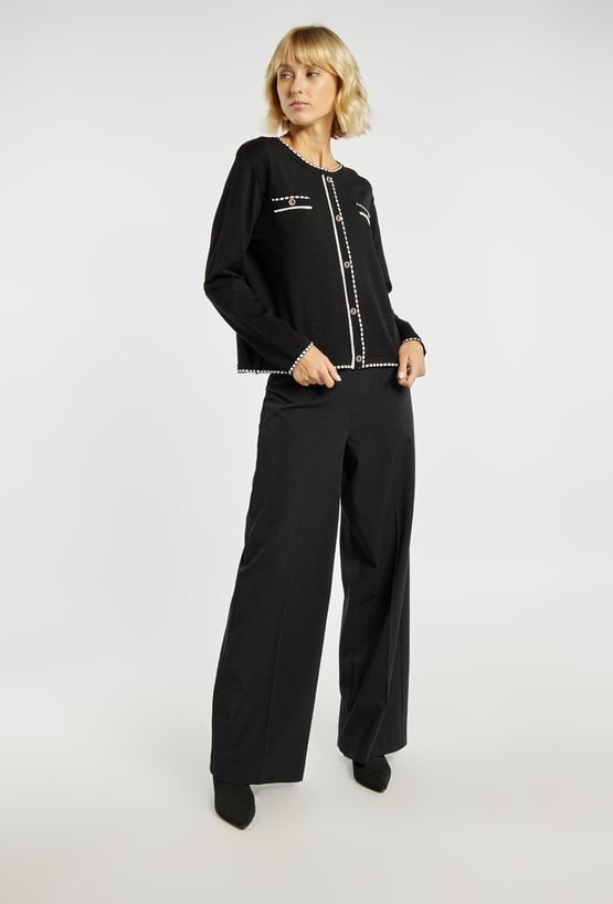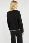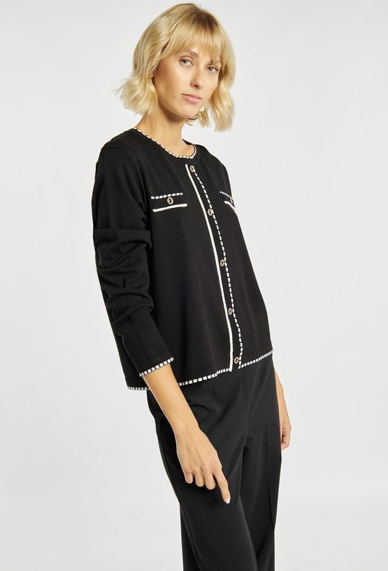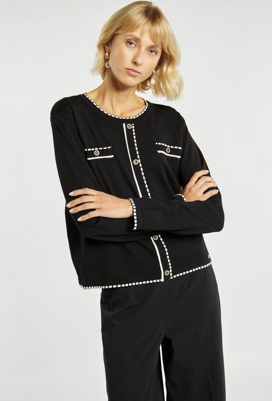 Sweter damski o eleganckim kroju, ozdobiony kontrastowymi, białymi lamówkami. Model z długim rękawem i imitacją kieszeni z przodu, idealnie wpisuje się w styl smart casual. Świetnie komponuje się zarówno z eleganckimi spodniami, jak i spódnicą. Modelka na zdjęciu ma 177 cm wzrostu i prezentuje rozmiar S/M.