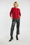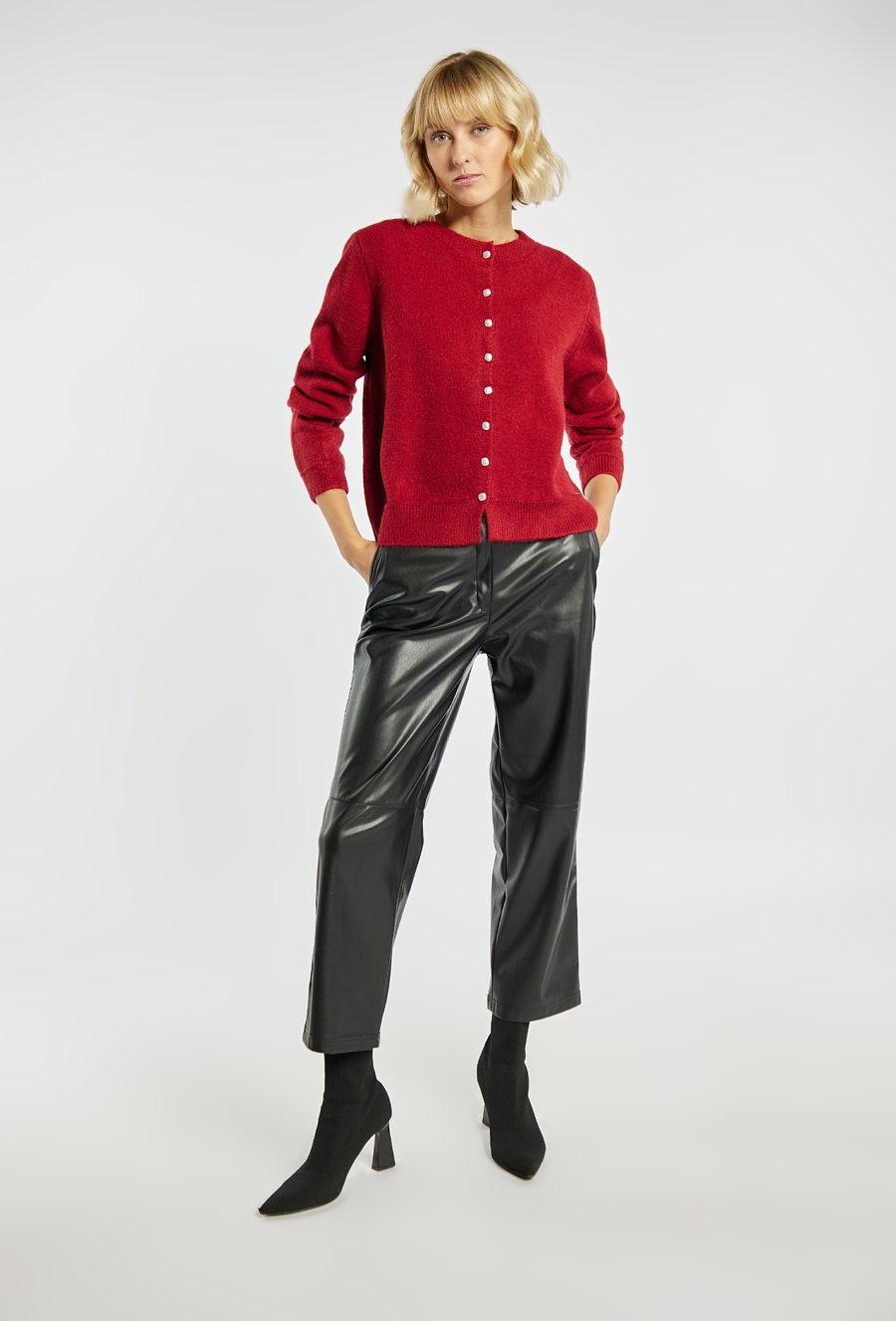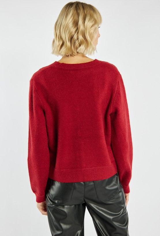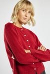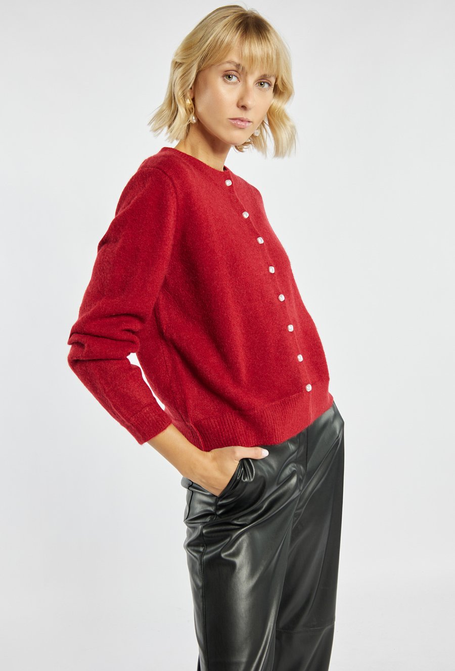 Elegancki sweter zapinany na guziki, o prostym i klasycznym kroju. Subtelne guziki dodają mu kobiecego charakteru, czyniąc go idealnym elementem zarówno codziennych, jak i bardziej eleganckich stylizacji. Modelka na zdjęciu ma 177 cm wzrostu i prezentuje rozmiar S/M.