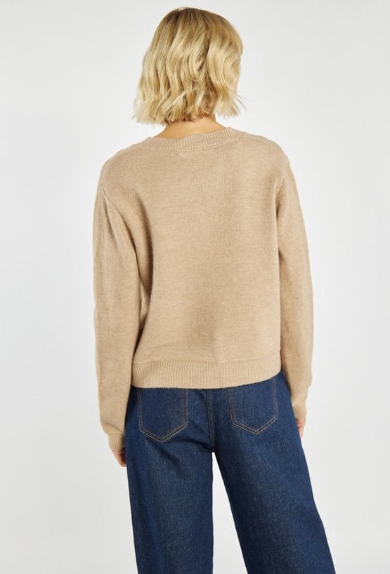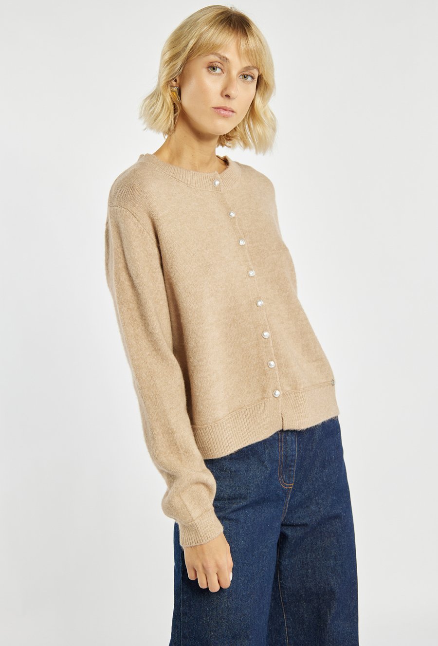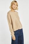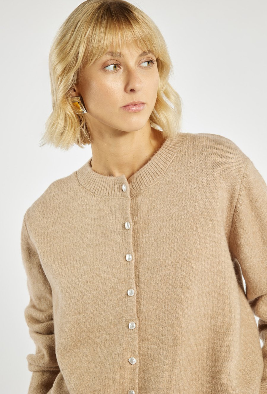 Elegancki sweter zapinany na guziki, o prostym i klasycznym kroju. Subtelne guziki dodają mu kobiecego charakteru, czyniąc go idealnym elementem zarówno codziennych, jak i bardziej eleganckich stylizacji. Modelka na zdjęciu ma 177 cm wzrostu i prezentuje rozmiar S/M.