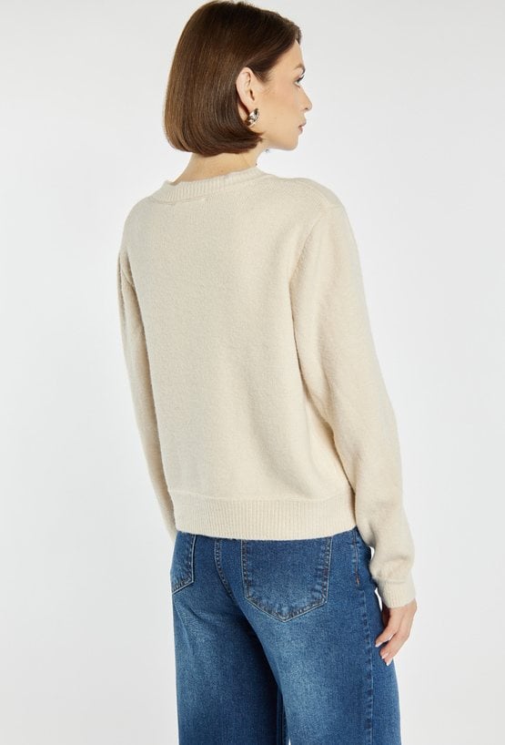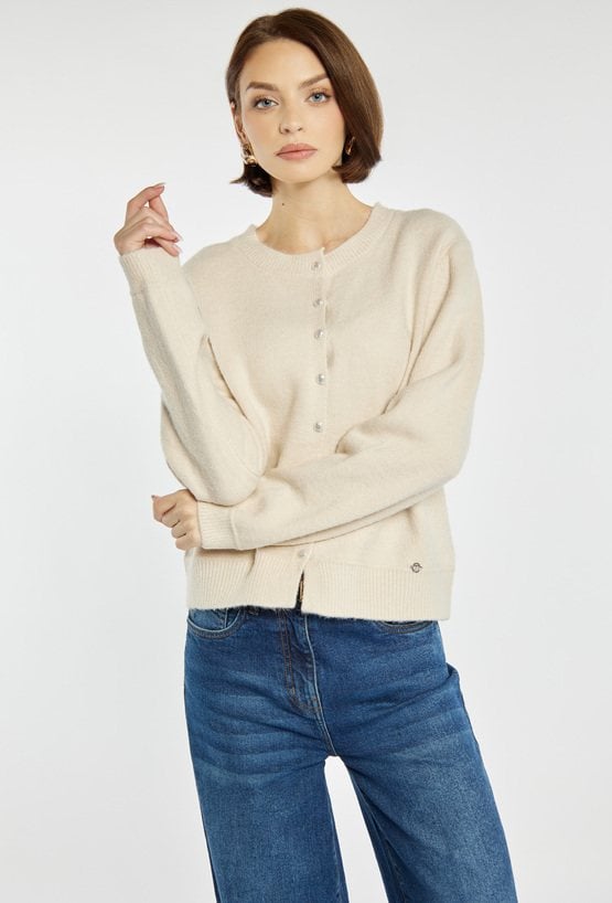 Elegancki sweter zapinany na guziki, o prostym i klasycznym kroju. Subtelne guziki dodają mu kobiecego charakteru, czyniąc go idealnym elementem zarówno codziennych, jak i bardziej eleganckich stylizacji. Modelka na zdjęciu ma 177 cm wzrostu i prezentuje rozmiar S/M.