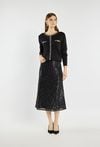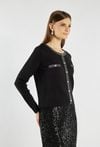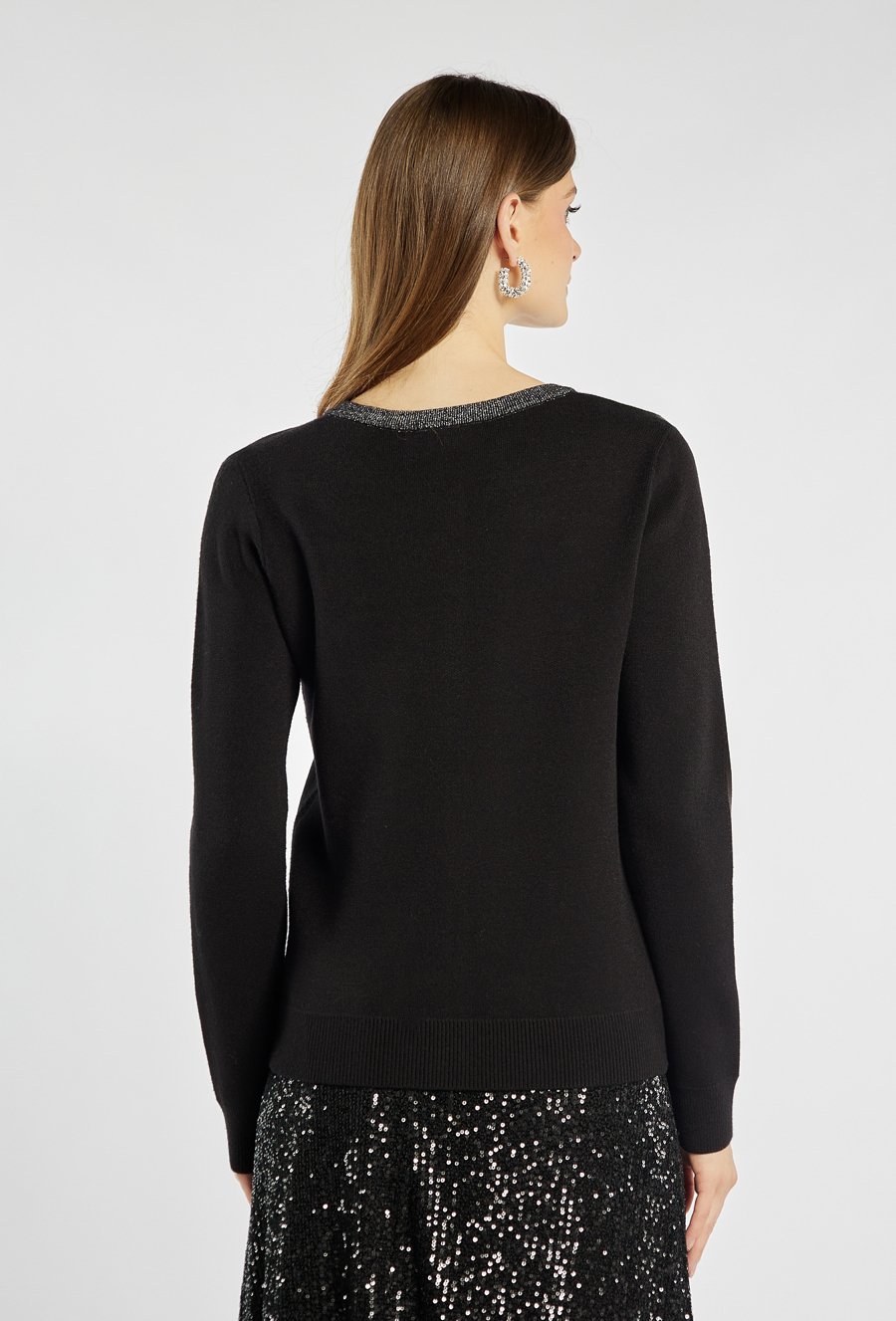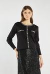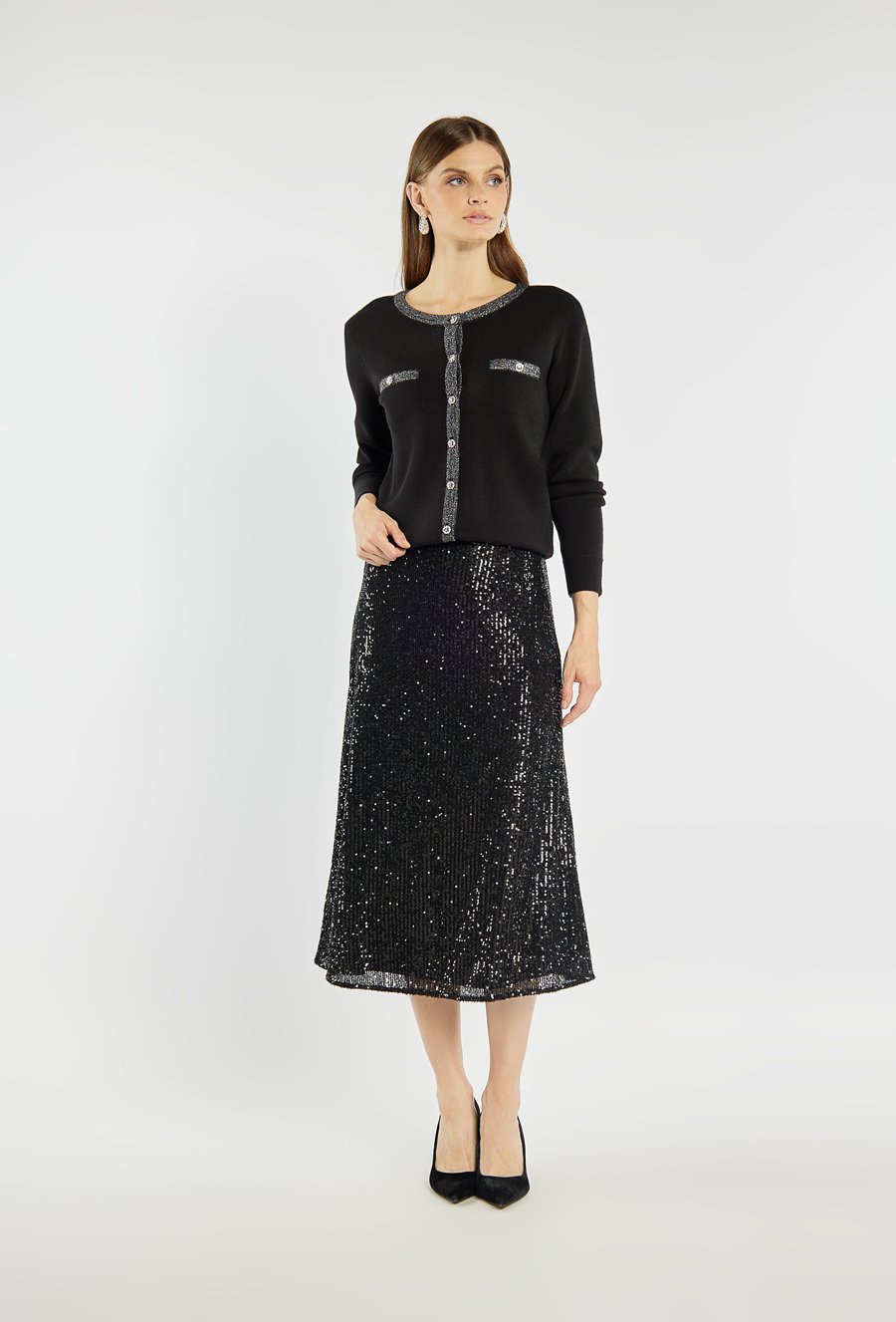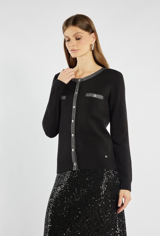 Elegancki sweter zapinany na ozdobne guziki, z delikatnie połyskującym wykończeniem przy dekolcie i wzdłuż zapięcia. Jego szykowny charakter sprawia, że świetnie sprawdzi się zarówno na wyjątkowe okazje, jak i w codziennych stylizacjach, kiedy chcesz dodać odrobinę blasku swojemu lookowi. Modelka na zdjęciu ma 177 cm wzrostu i prezentuje rozmiar S.