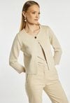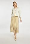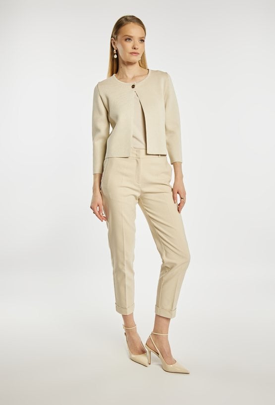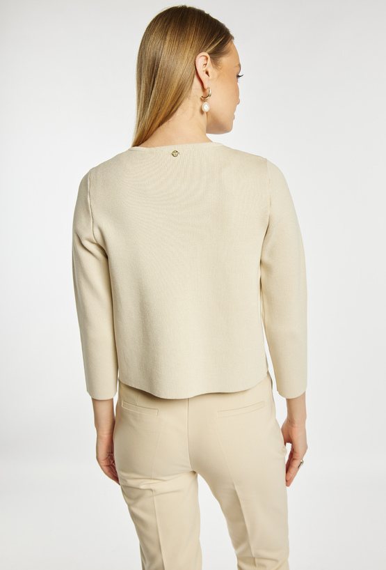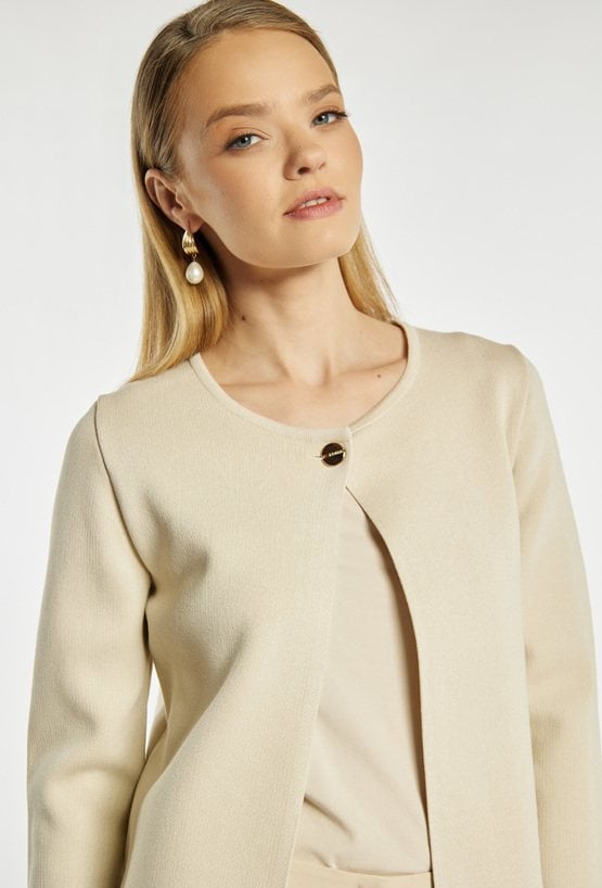 Sweter damski o eleganckim, minimalistycznym kroju. Model z długim rękawem oraz klasycznym, półokrągłym dekoltem zapinanym na subtelny guzik. Prosta forma i staranne wykończenie nadają całości ponadczasowego charakteru. Sweter idealny do sukienki, spódnicy lub spodni materiałowych, tworząc elegancki i spójny zestaw. Modelka na zdjęciu ma 177 cm wzrostu i prezentuje rozmiar S.