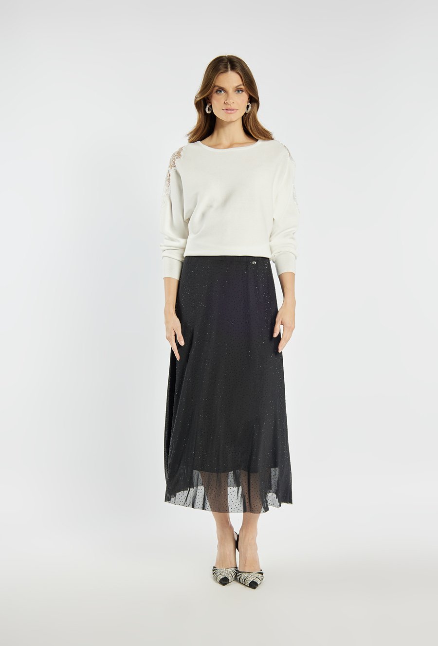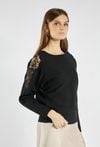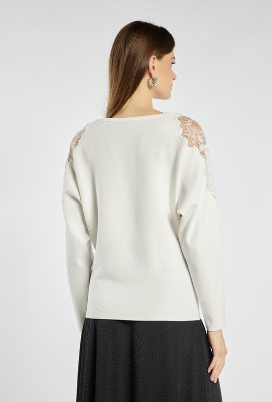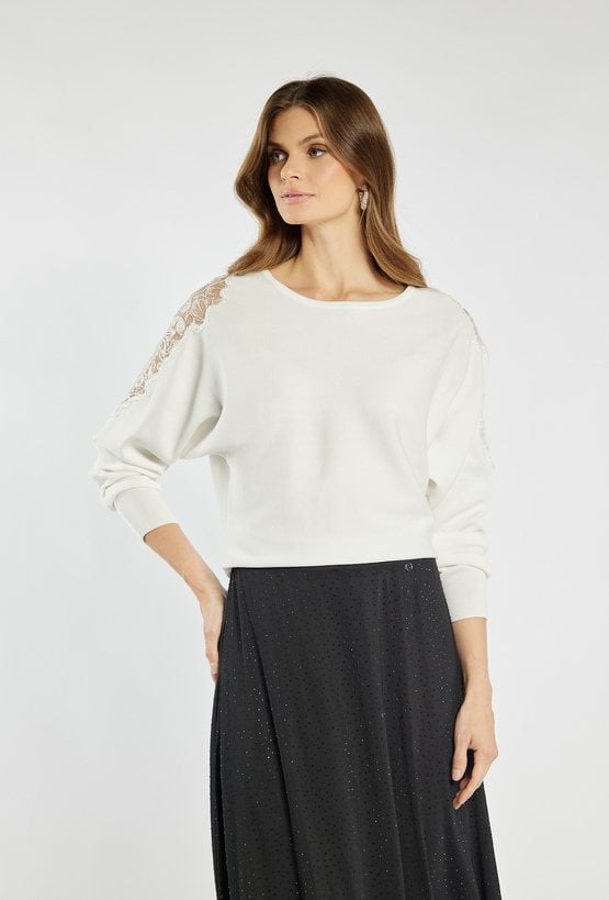 Elegancki sweter z dekoltem w łódkę, który subtelnie podkreśla linię szyi i ramion. Na ramionach znajduje się efektowna wstawka z koronki zdobionej delikatnymi perełkami, dodająca całości kobiecego i wyrafinowanego charakteru. Idealny wybór na co dzień i na wieczorne wyjścia.