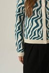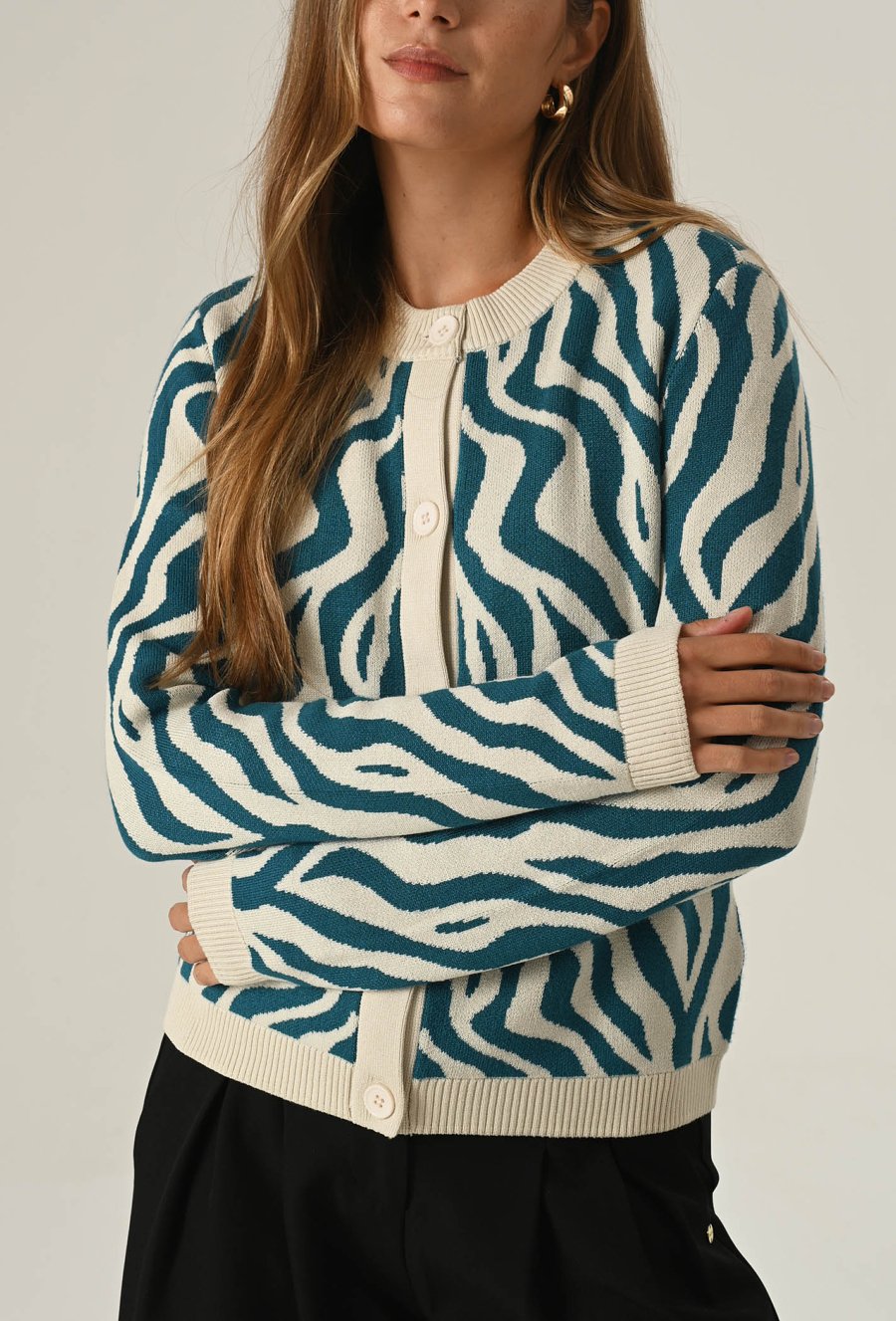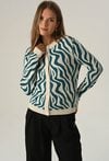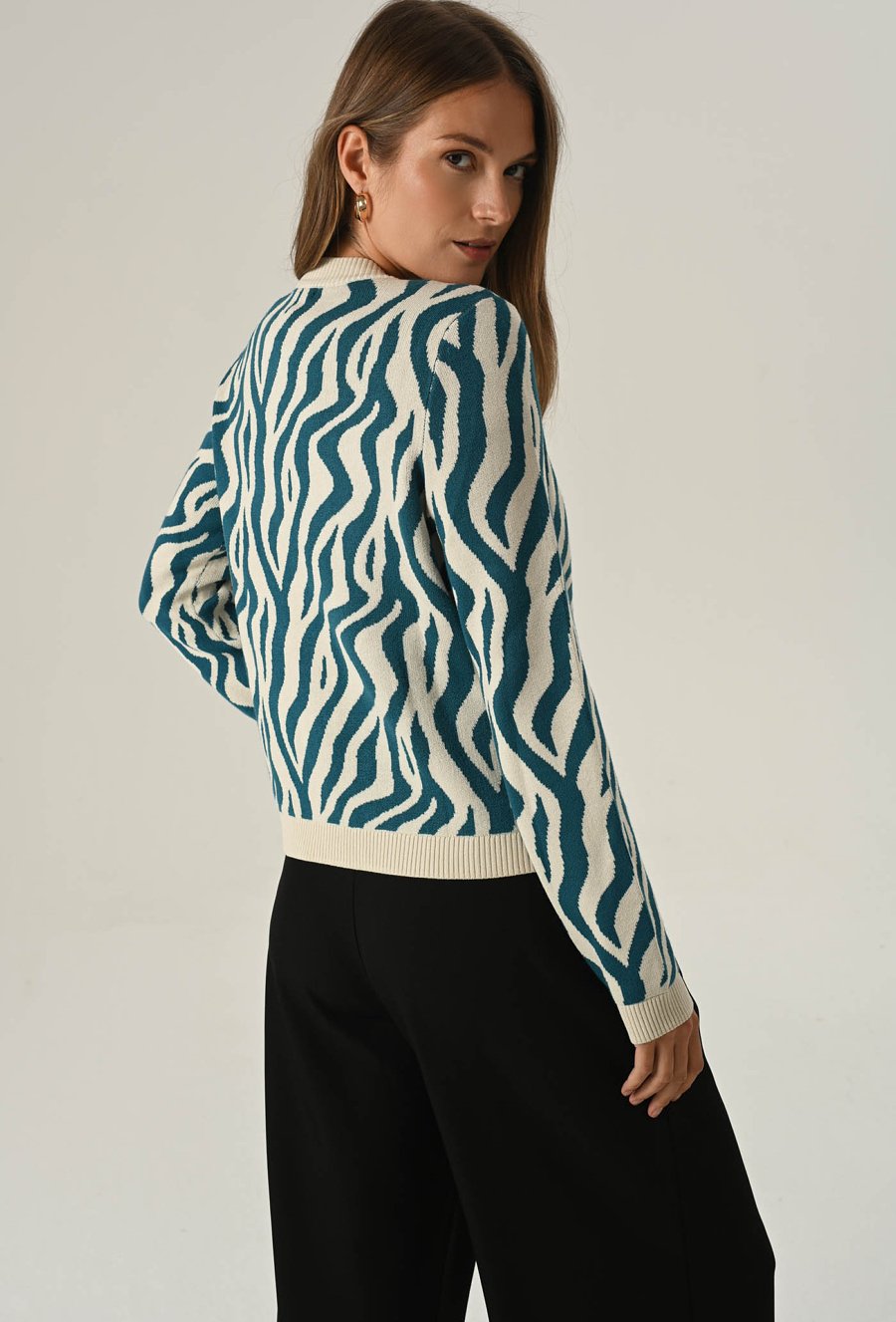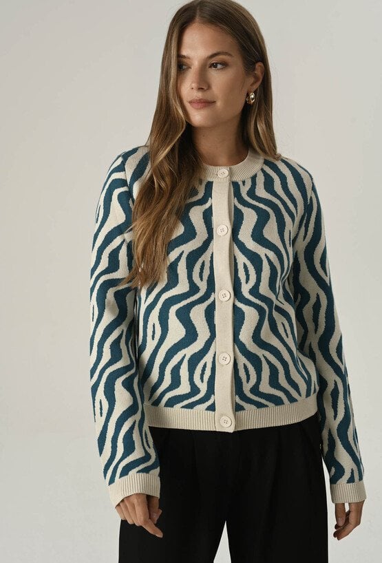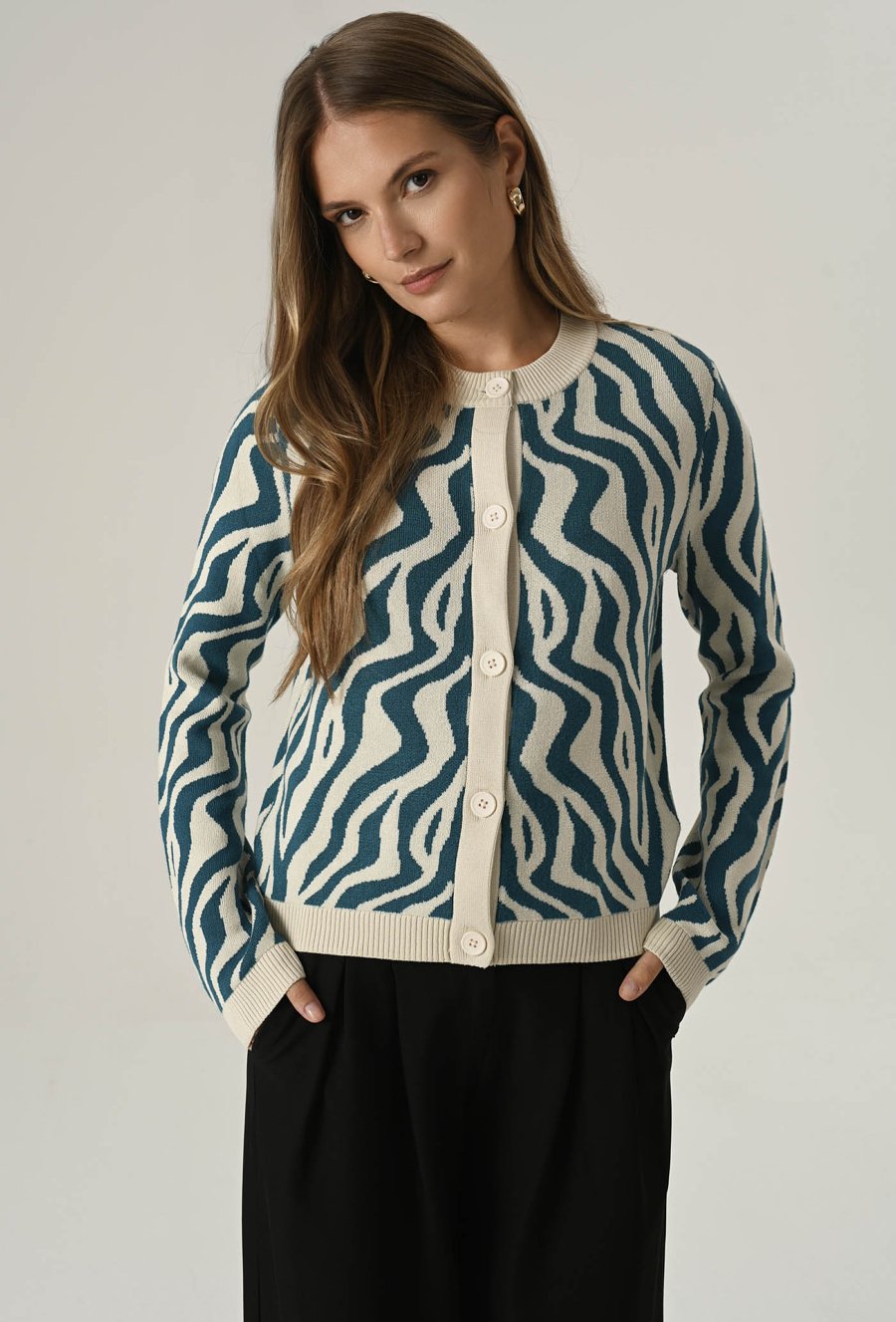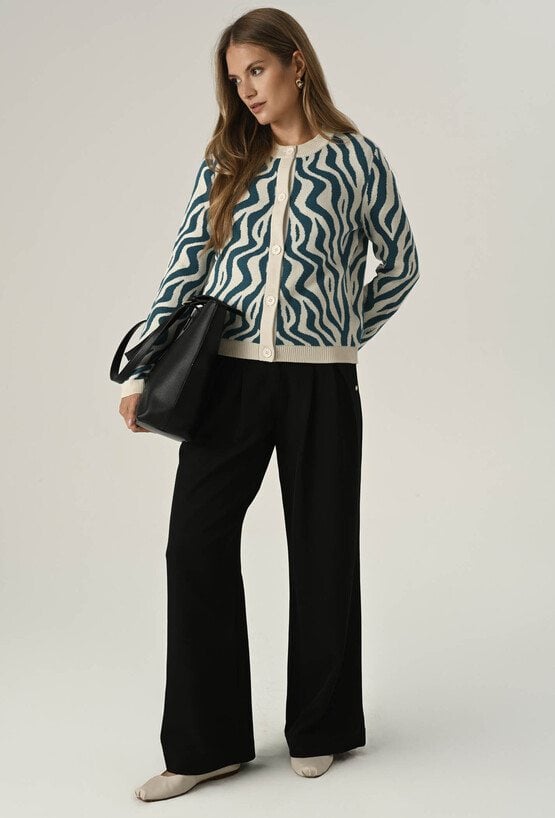 Sweter o prostym kroju, wykonany z mięsistej, puchatej dzianiny z dodatkiem wiskozy, jest niezwykle przyjemny dla skóry i pięknie się układa. Klasyczne zapięcie na guziki dodaje elegancji, a miękka faktura sprawia, że trudno się z nim rozstać. Stylowy, kontrastowy wzór ideale sprawdzi się do biura, na spacer czy weekendowe wyjście. Modelka na zdjęciu ma 175 cm wzrostu i prezentuje rozmiar 36.