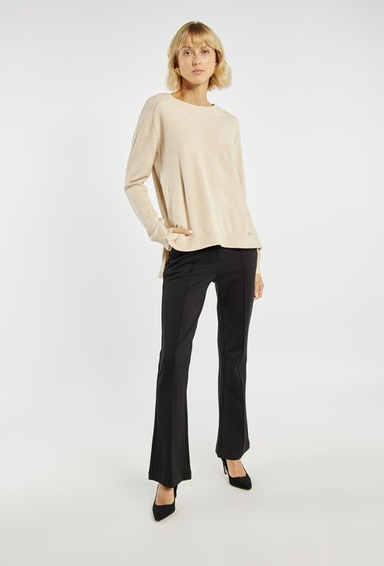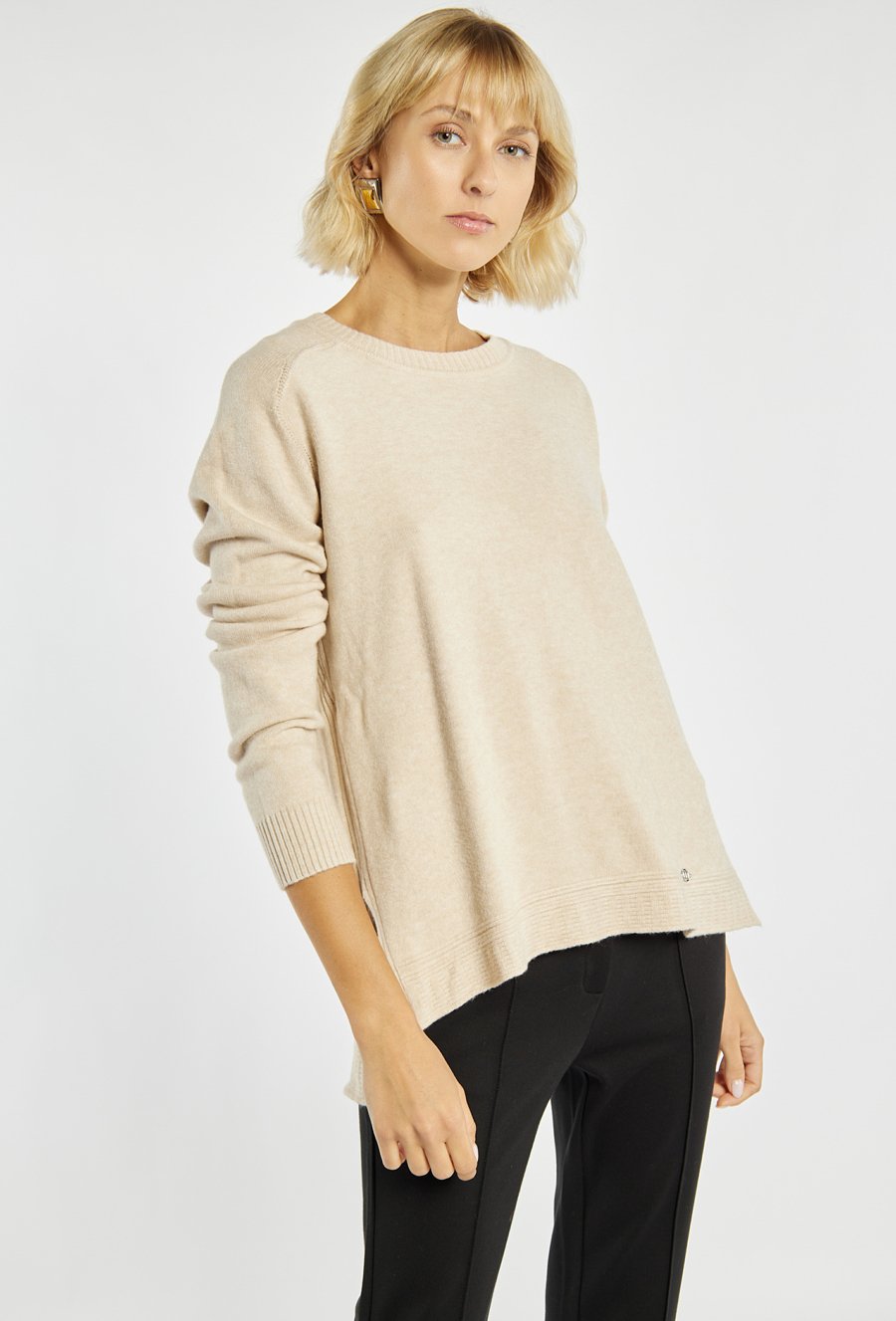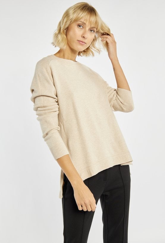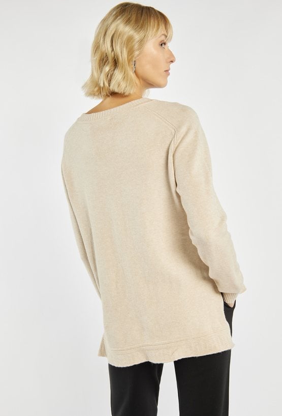 Klasyczny sweter o swobodnym kroju z okrągłym dekoltem. Model z delikatnie wydłużonym tyłem i rozcięciami po bokach. Doskonała baza do codziennych stylizacji, zapewniająca wygodę i elegancki wygląd. Modelka na zdjęciu ma 177 cm wzrostu i prezentuje rozmiar S/M.