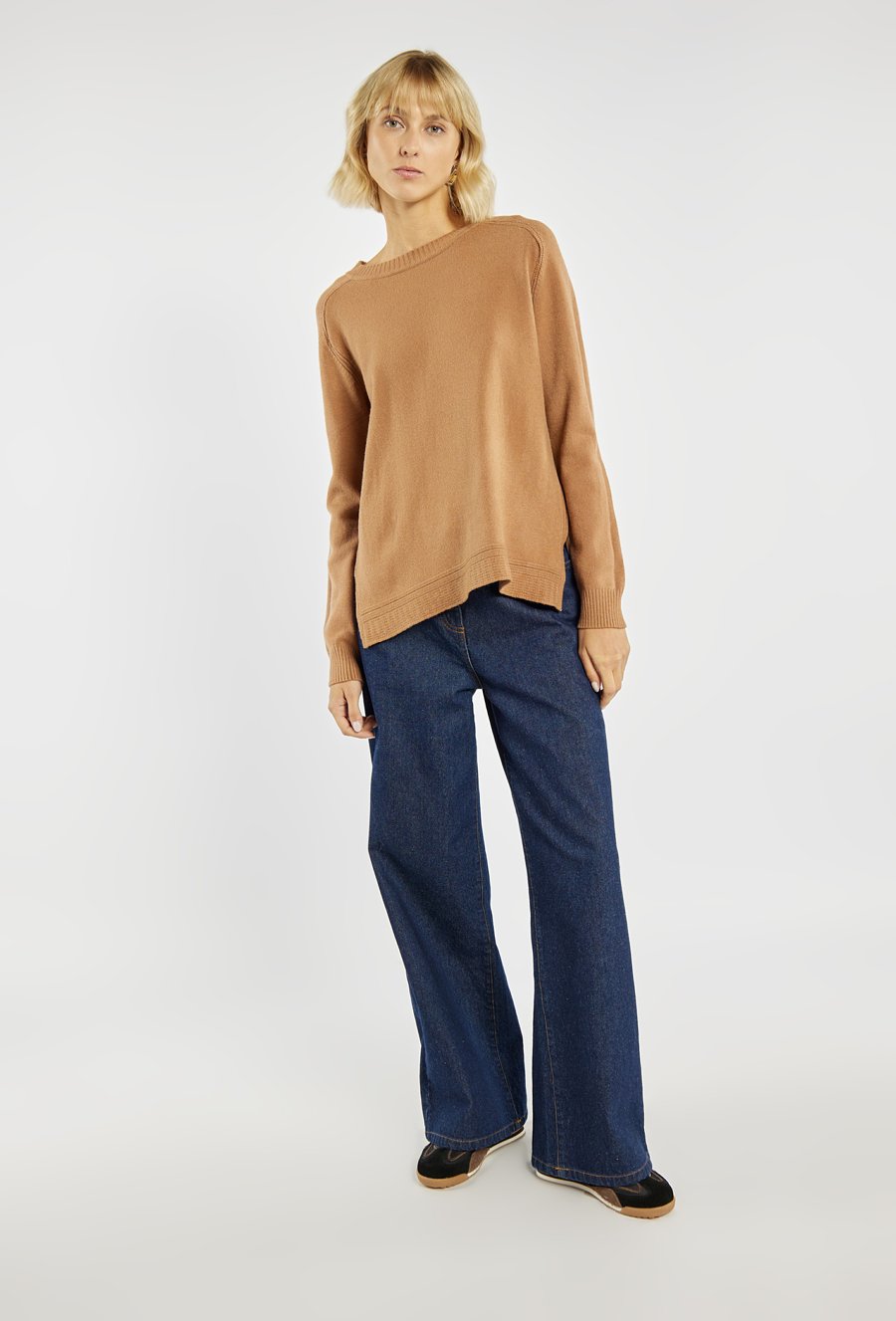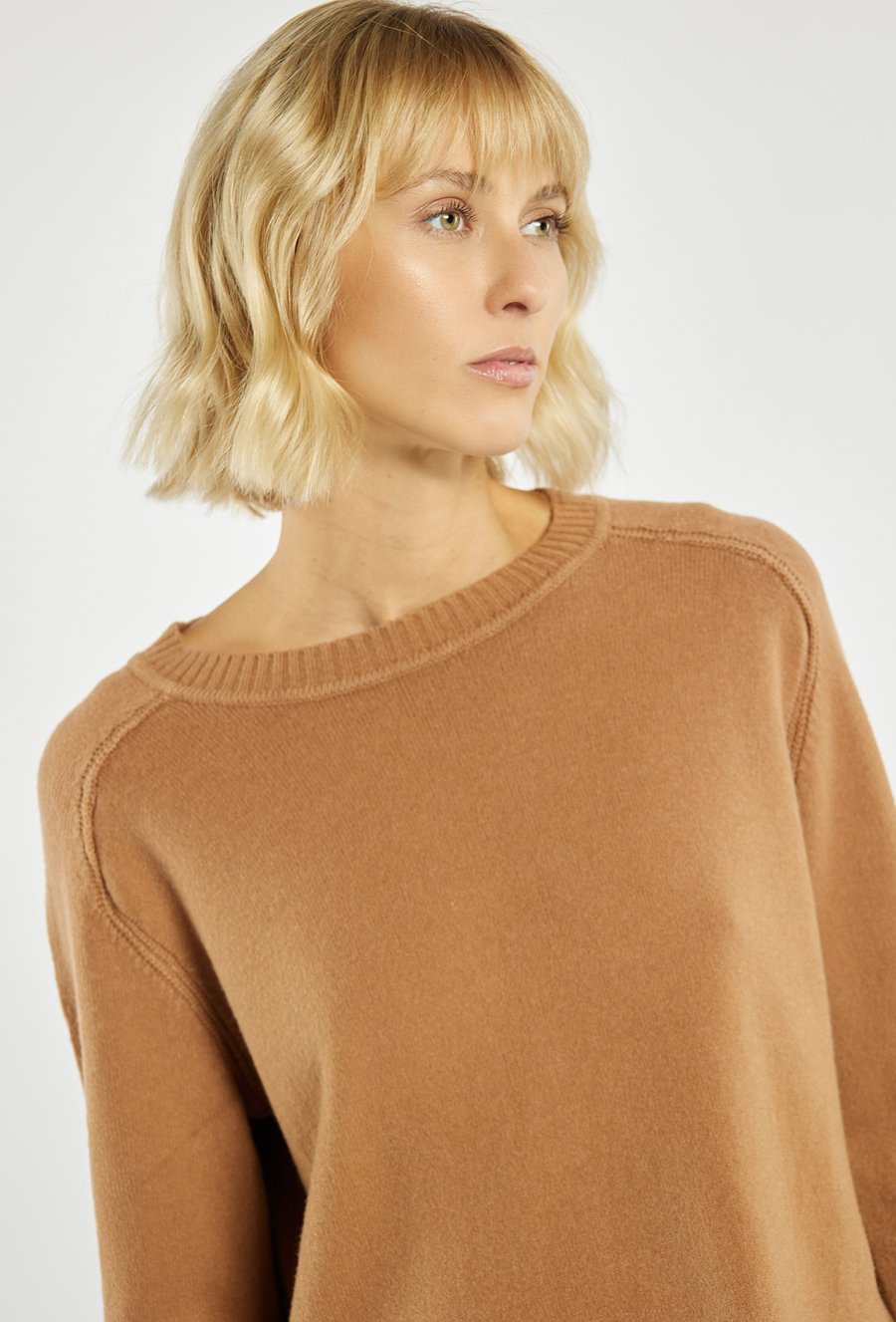 Klasyczny sweter o swobodnym kroju z okrągłym dekoltem. Model z delikatnie wydłużonym tyłem i rozcięciami po bokach. Doskonała baza do codziennych stylizacji, zapewniająca wygodę i elegancki wygląd. Modelka na zdjęciu ma 177 cm wzrostu i prezentuje rozmiar S/M.