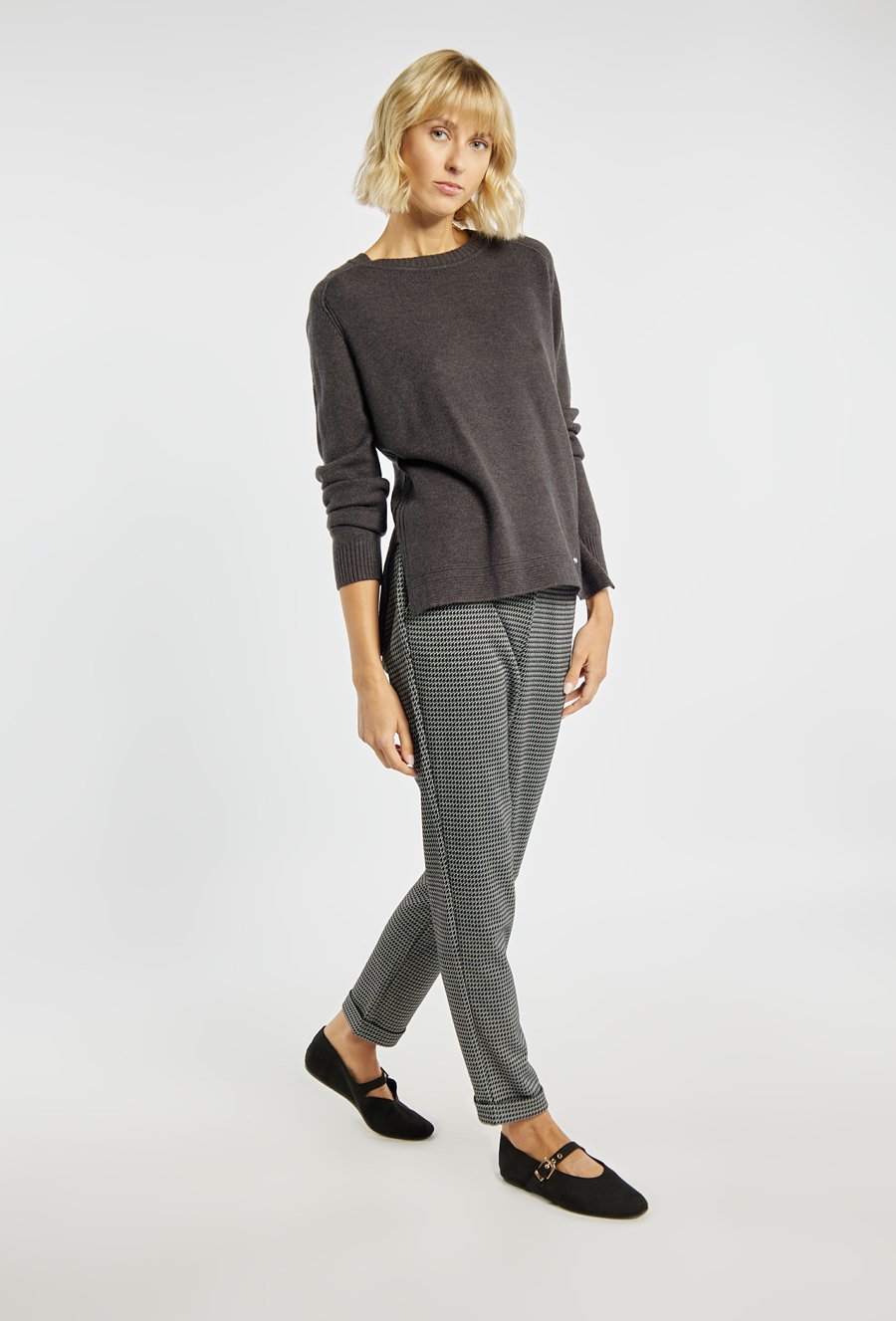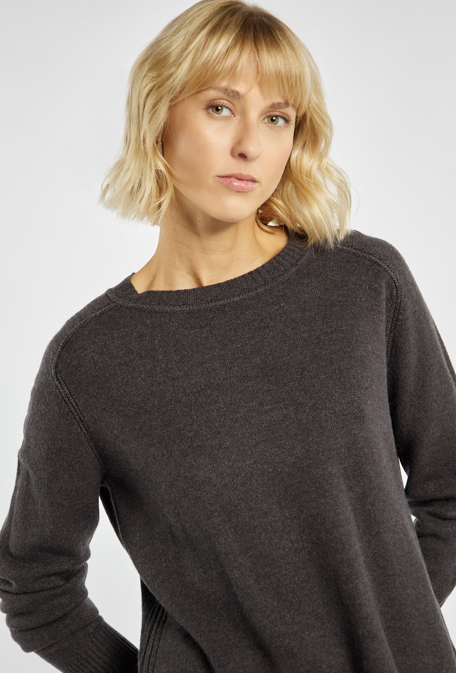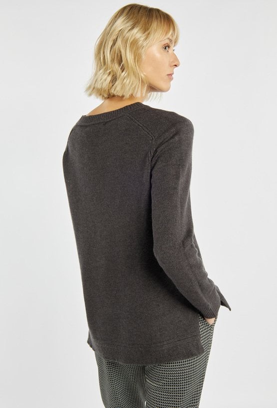 Klasyczny sweter o swobodnym kroju z okrągłym dekoltem. Model z delikatnie wydłużonym tyłem i rozcięciami po bokach. Doskonała baza do codziennych stylizacji, zapewniająca wygodę i elegancki wygląd. Modelka na zdjęciu ma 177 cm wzrostu i prezentuje rozmiar S/M.