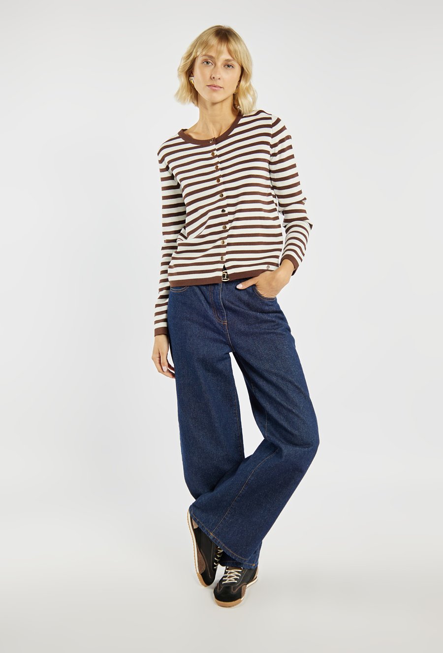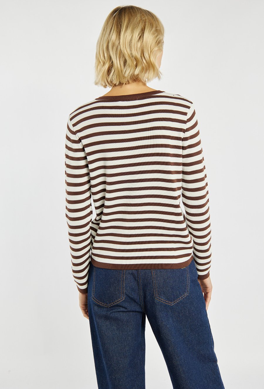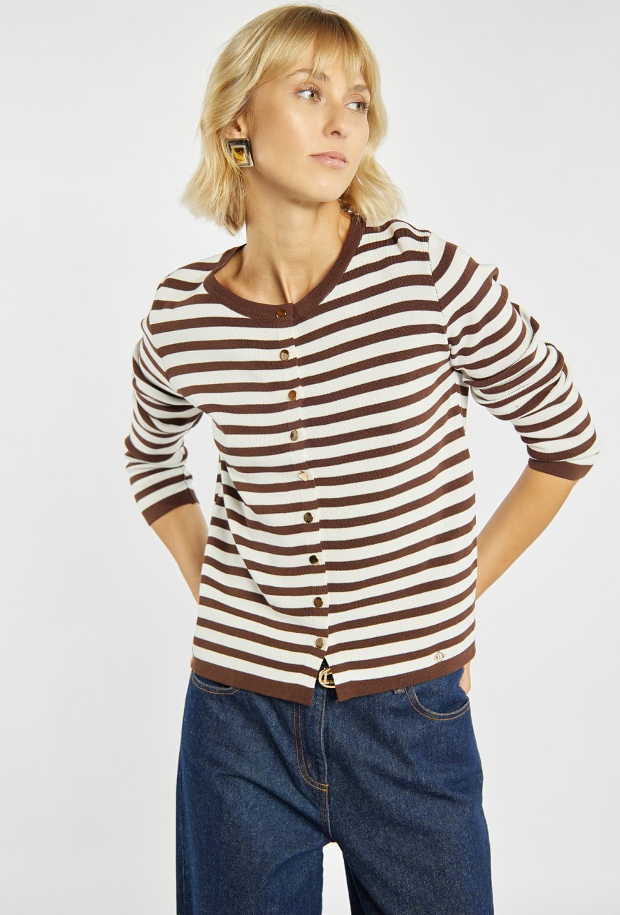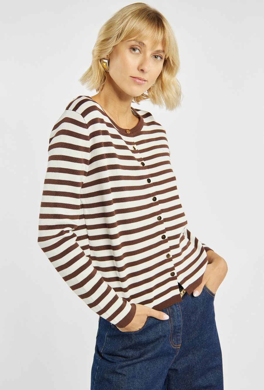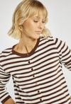 Klasyczny sweter w paski. Sweter zapinany z przodu na ozdobne guziki w złotym kolorze, które dodają mu eleganckiego charakteru. Model ten idealnie sprawdzi się zarówno w codziennych, jak i bardziej stylowych zestawieniach. Doskonały do jeansów, spódnicy lub skórzanych spodni. Modelka na zdjęciu ma 177 cm wzrostu i prezentuje rozmiar S/M.