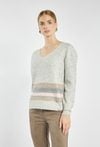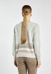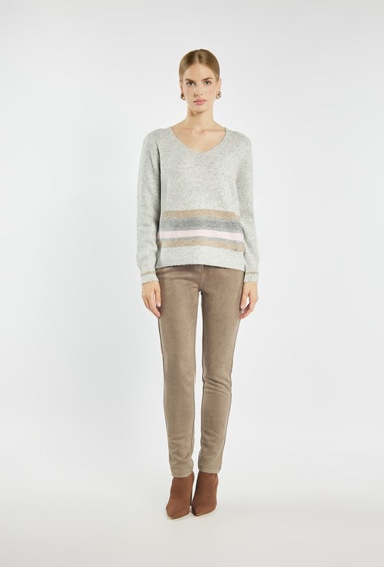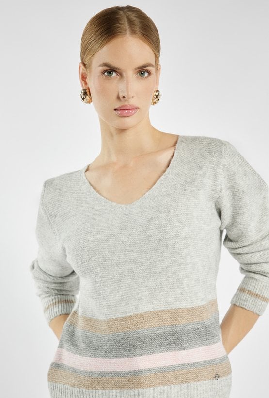 Klasyczny sweter z dekoltem w serek. Sweter ozdobiony delikatnymi, poziomymi pasami w pastelowych kolorach beżu, różu i szarości, które dodają mu subtelnego charakteru. Idealny do codziennych stylizacji. Modelka na zdjęciu ma 177 cm wzrostu i prezentuje rozmiar S/M.