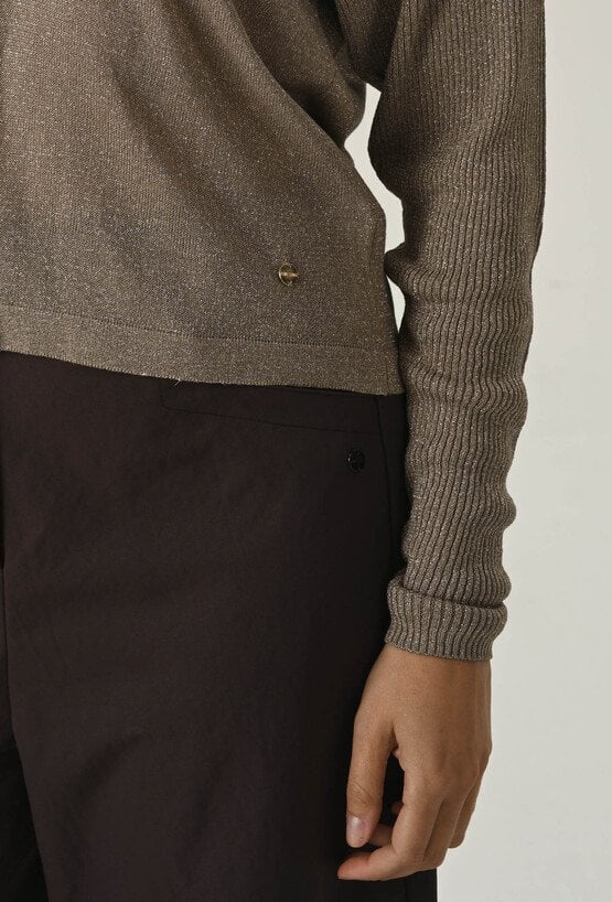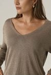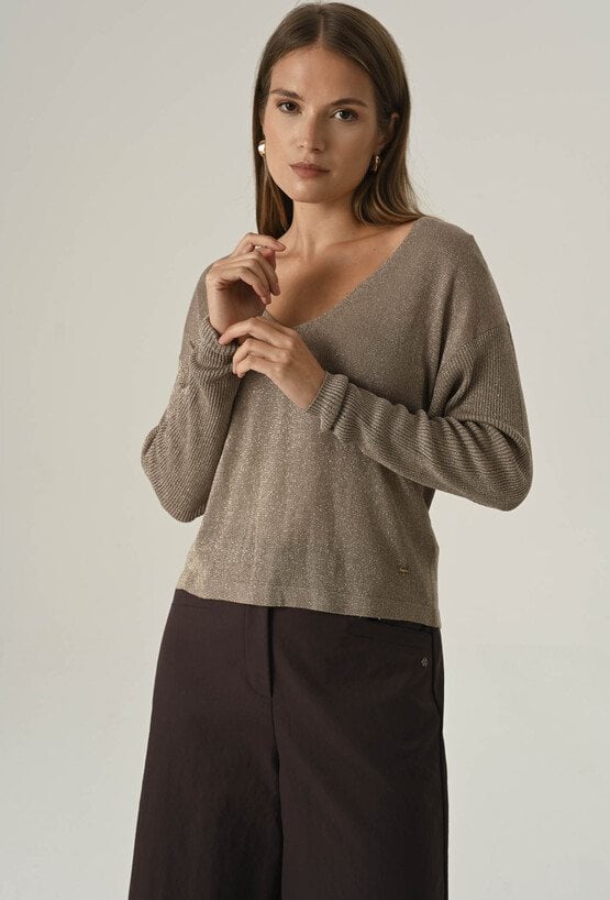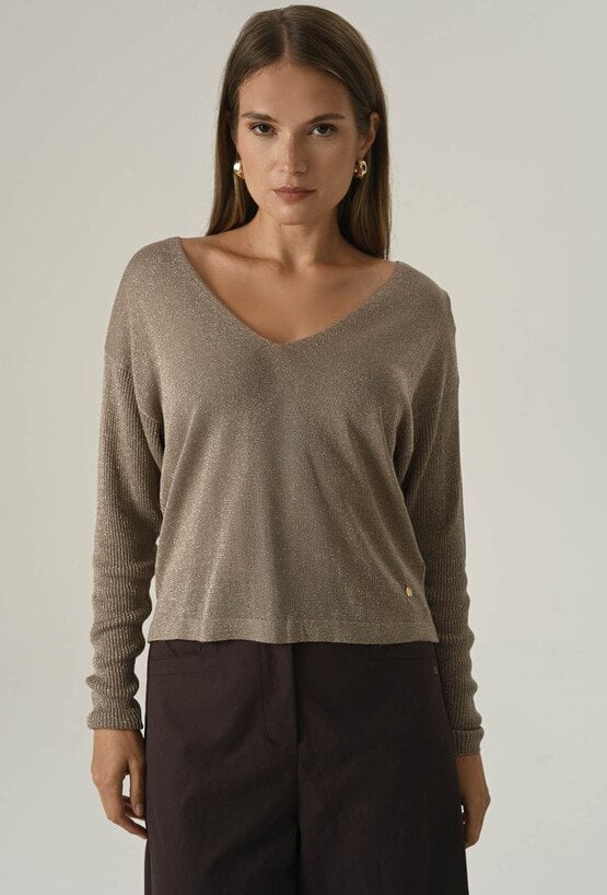 Ten sweter to doskonałe połączenie komfortu i modowego wyczucia. Wykonany z lekkiej dzianiny z przewagą wiskozy, jest przyjemny dla skóry i pięknie się układa. Dekolt w literę V subtelnie wysmukla sylwetkę, a łączone faktury dodają całości nowoczesnego charakteru. Długi rękaw sprawia, że to idealny model na sezon przejściowy. Modelka na zdjęciu ma 177 cm wzrostu i prezentuje rozmiar 36/S.