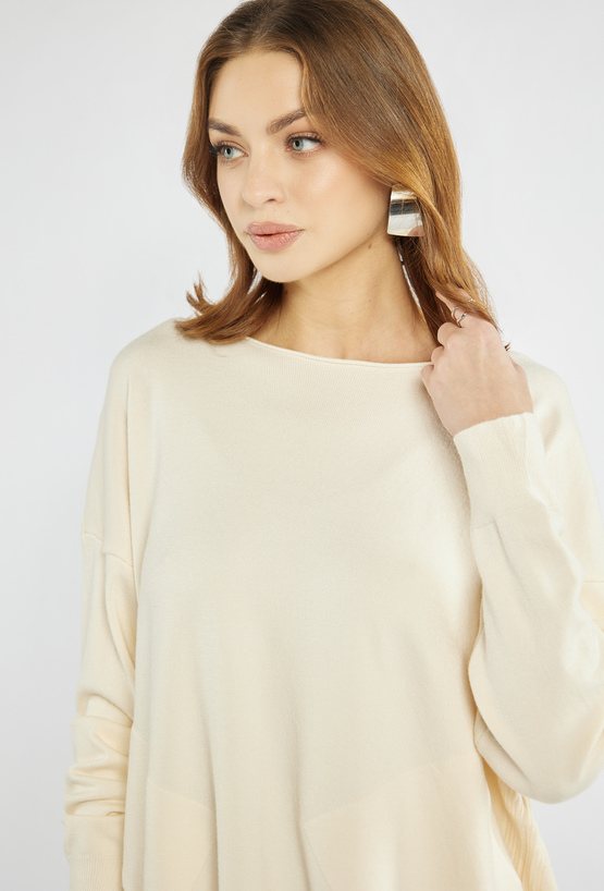 Luźny sweter damski wykonany z przyjemnej wiskozy. Sweter z długimi rękawami, półokrągłym dekoltem oraz kieszonkami. Dostępny w kilku kolorach, co pozwala dopasować go do różnych stylizacji – idealny wybór na wiosenne dni. Modelka na zdjęciu ma 177 cm wzrostu i prezentuje rozmiar S/M.