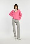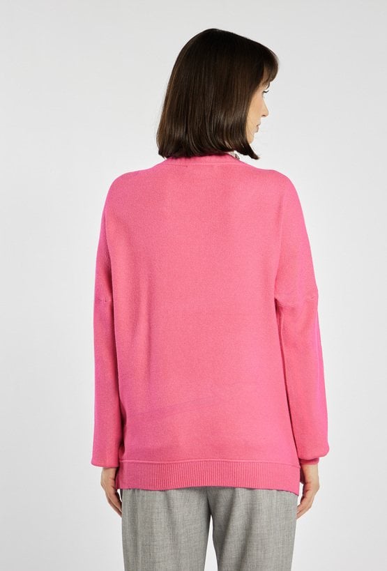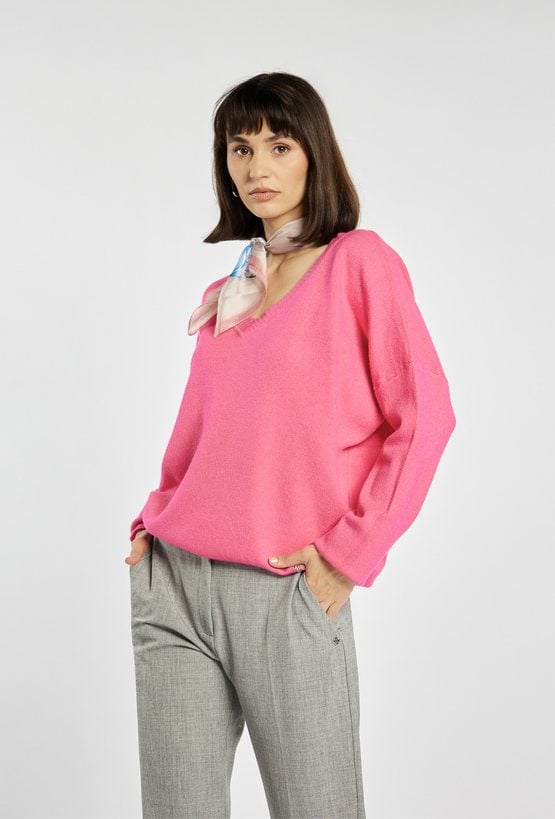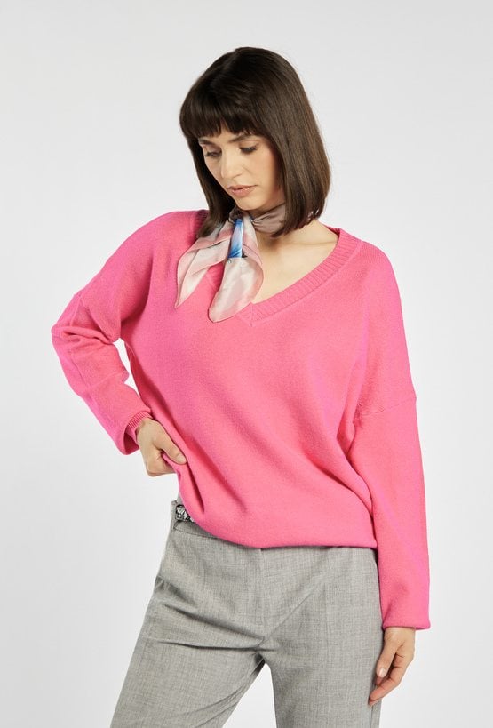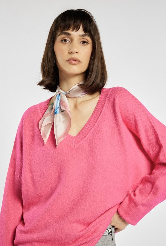 Sweter o klasycznym kroju z dekoltem w serek to ponadczasowy element garderoby. Obniżona linia ramion dodaje mu swobodnego charakteru, a prążkowane wykończenia przy dekolcie, rękawach i u dołu nadają całości wyrazistości. Idealny do codziennych stylizacji. Model ten występuje w wielu wariantach kolorystycznych. Modelka na zdjęciu ma 177 cm wzrostu i prezentuje rozmiar S/M.