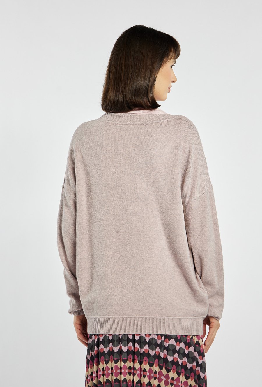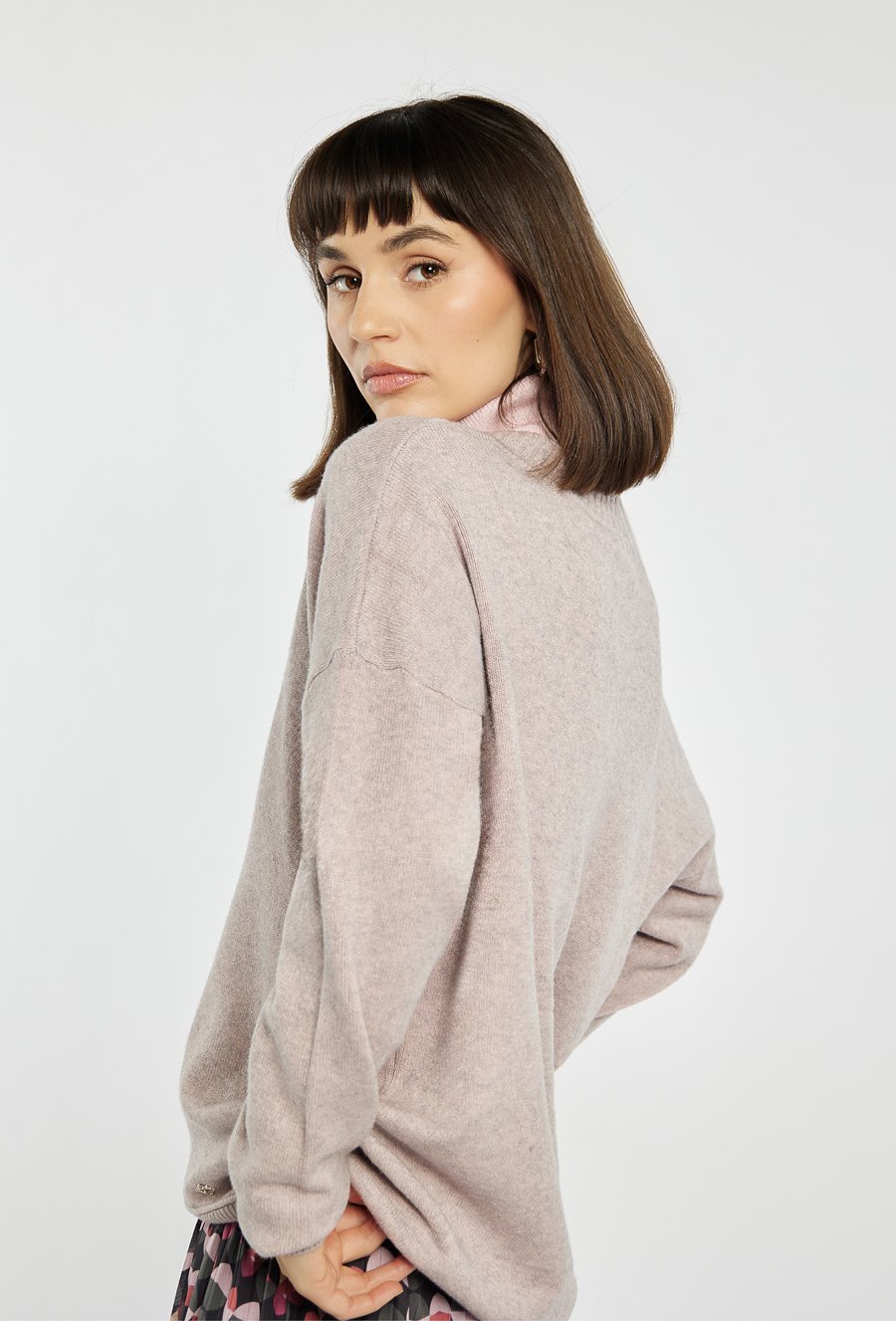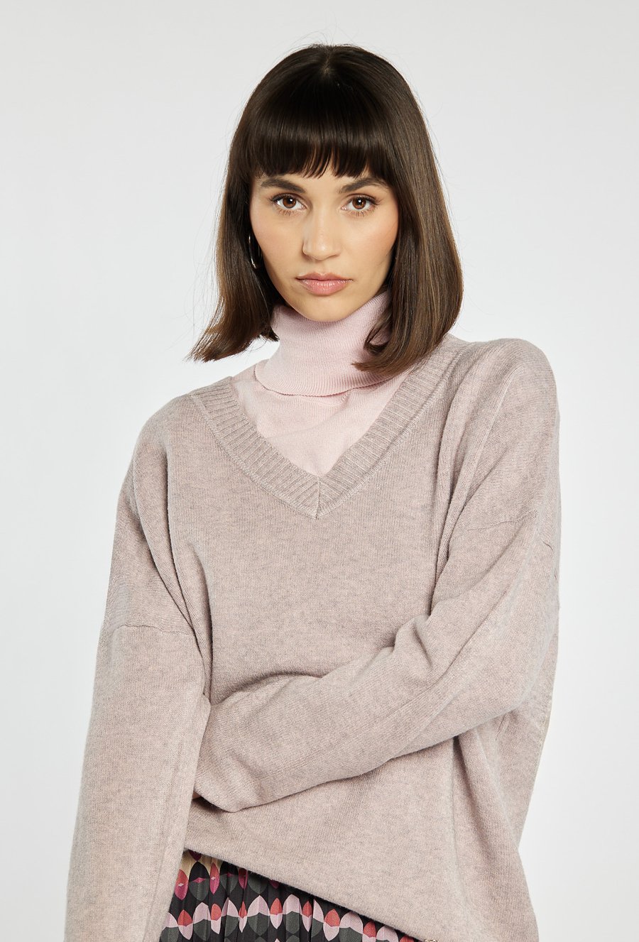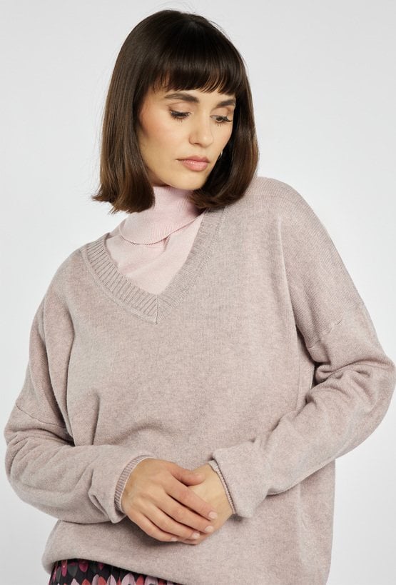 Sweter o klasycznym kroju z dekoltem w serek to ponadczasowy element garderoby. Obniżona linia ramion dodaje mu swobodnego charakteru, a prążkowane wykończenia przy dekolcie, rękawach i u dołu nadają całości wyrazistości. Idealny do codziennych stylizacji. Model ten występuje w wielu wariantach kolorystycznych. Modelka na zdjęciu ma 177 cm wzrostu i prezentuje rozmiar S/M.