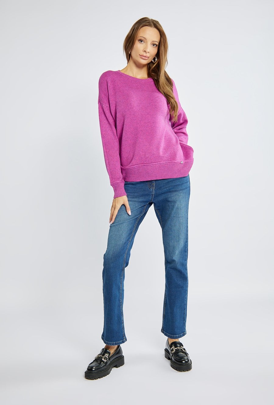 Lekko połyskujący sweter damski wykonany z miękkiej i przyjemnej w dotyku wiskozy. Sweter z długimi rękawami oraz półokrągłym dekoltem. Na dole swetra znajduje się mała, elegancka zawieszka z logo marki Monnari, dodająca całości szyku i oryginalnego charakteru. Ten uniwersalny sweter sprawdzi się zarówno w codziennych, jak i bardziej eleganckich stylizacjach. Modelka na zdjęciu ma 177 cm wzrostu i prezentuje rozmiar S/M.