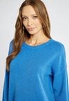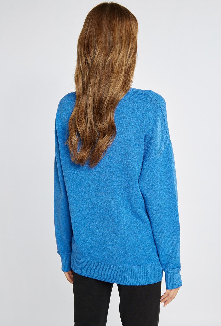Lekko połyskujący sweter damski wykonany z miękkiej i przyjemnej w dotyku wiskozy. Sweter z długimi rękawami oraz półokrągłym dekoltem. Na dole swetra znajduje się mała, elegancka zawieszka z logo marki Monnari, dodająca całości szyku i oryginalnego charakteru. Ten uniwersalny sweter sprawdzi się zarówno w codziennych, jak i bardziej eleganckich stylizacjach. Modelka na zdjęciu ma 177 cm wzrostu i prezentuje rozmiar S/M.