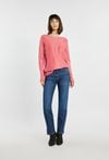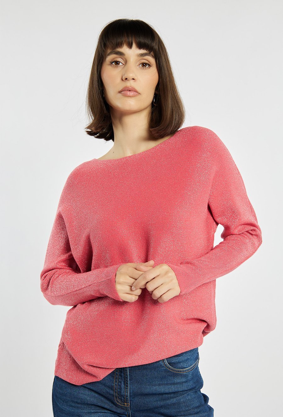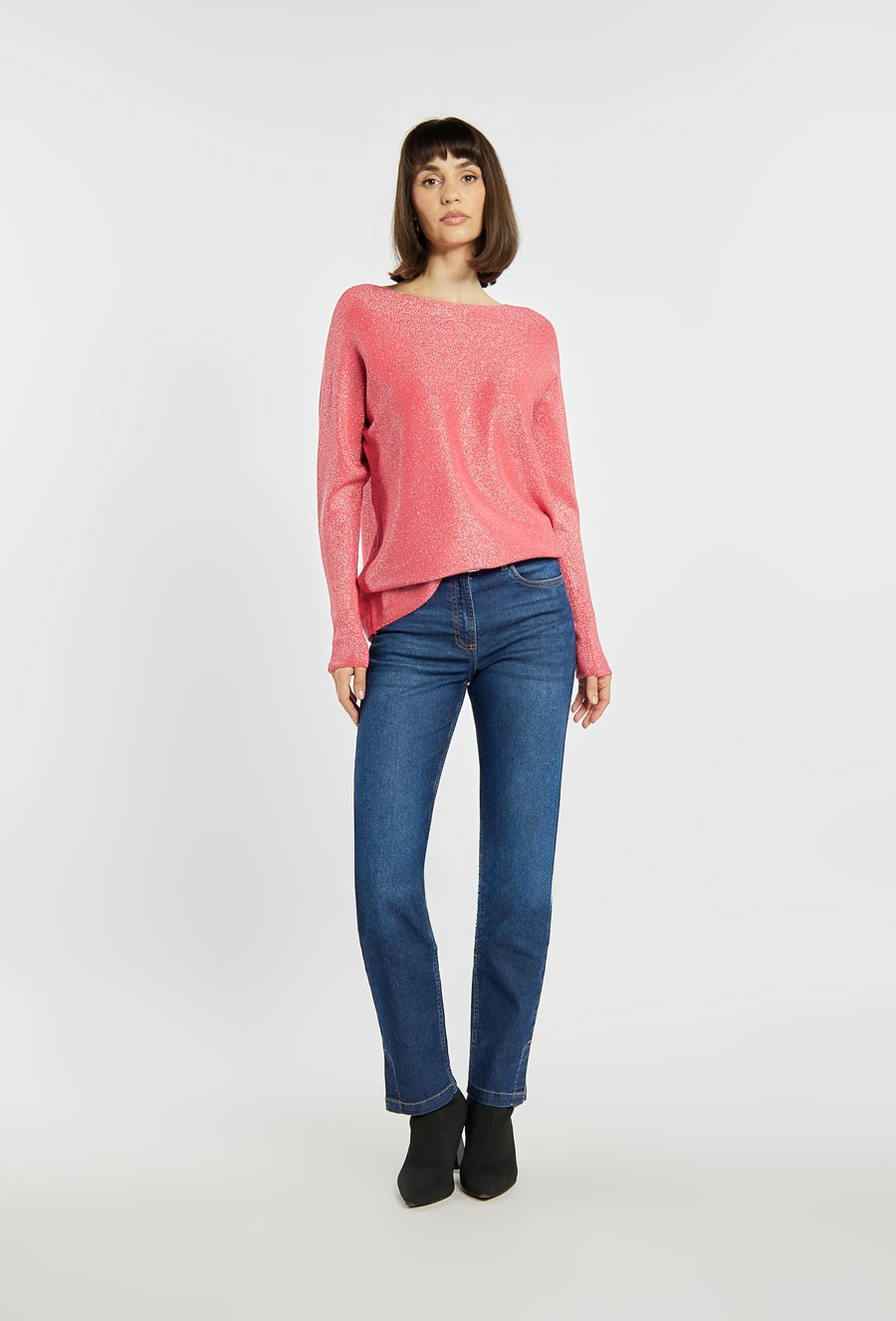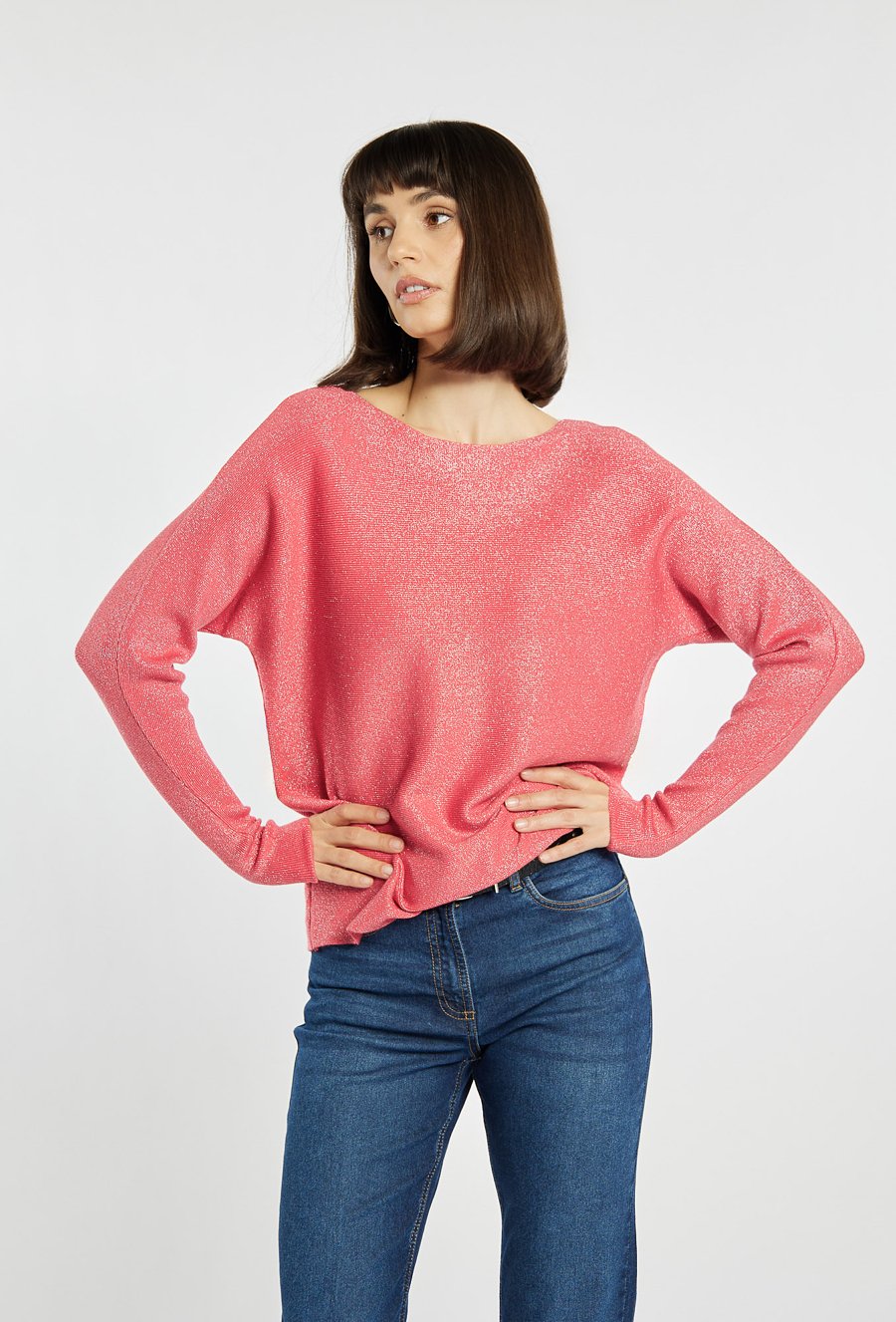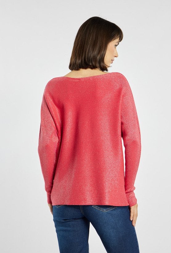 Sweter z połyskującej dzianiny to idealna propozycja na wieczorne wyjścia lub świąteczne okazje. Sweter wyróżnia się delikatnym brokatowym efektem, który nadaje stylizacji elegancki i kobiecy charakter. Luźniejszy krój z obniżoną linią ramion zapewnia swobodę ruchów. Model ten występuje w kilku wariantach kolorystycznych. Modelka na zdjęciu ma 177 cm wzrostu i prezentuje rozmiar S/M.