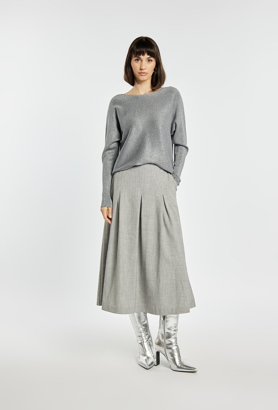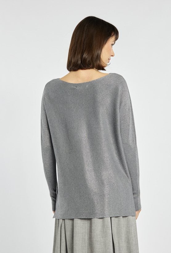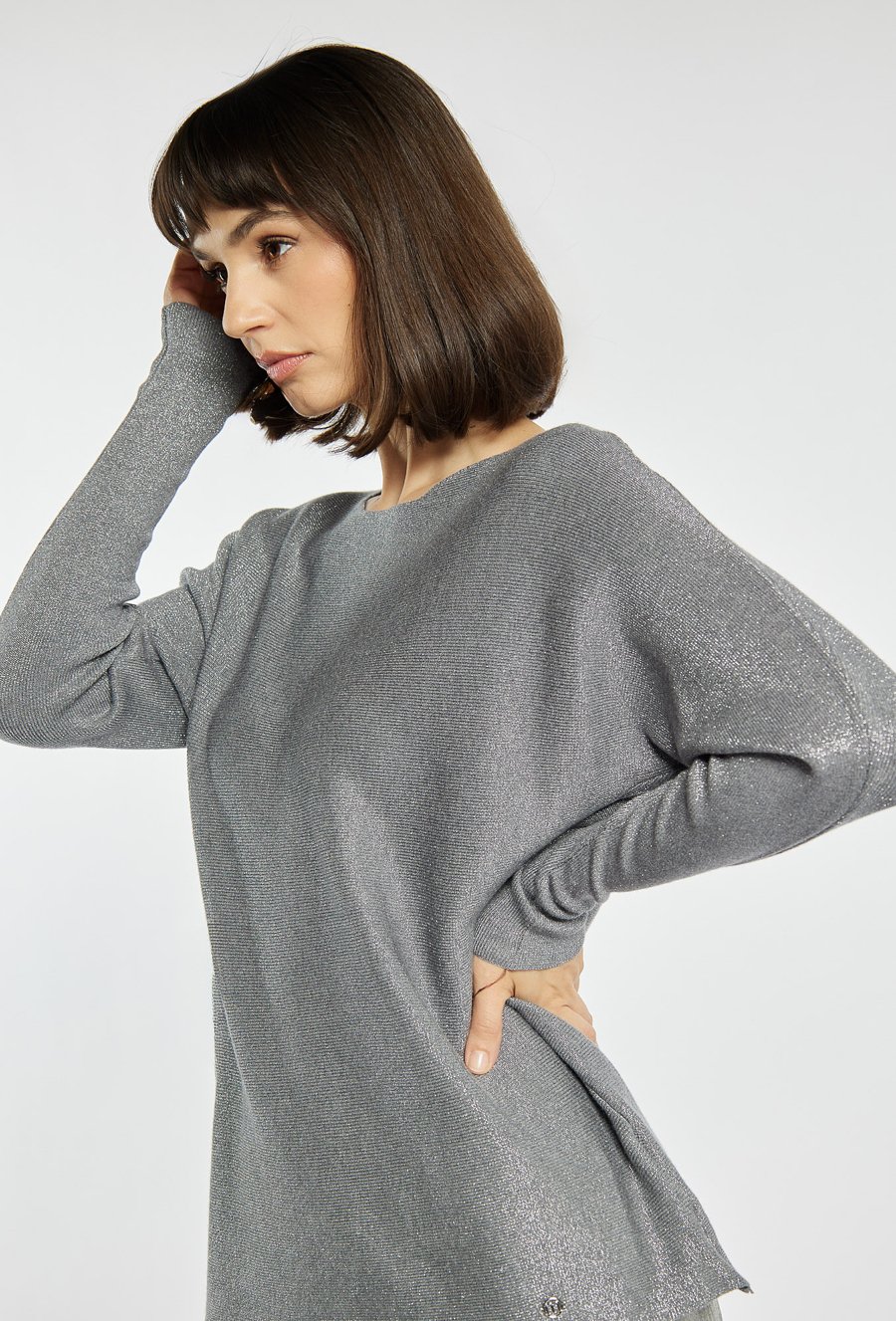 Sweter z połyskującej dzianiny to idealna propozycja na wieczorne wyjścia lub świąteczne okazje. Sweter wyróżnia się delikatnym brokatowym efektem, który nadaje stylizacji elegancki i kobiecy charakter. Luźniejszy krój z obniżoną linią ramion zapewnia swobodę ruchów. Model ten występuje w kilku wariantach kolorystycznych. Modelka na zdjęciu ma 177 cm wzrostu i prezentuje rozmiar S/M.