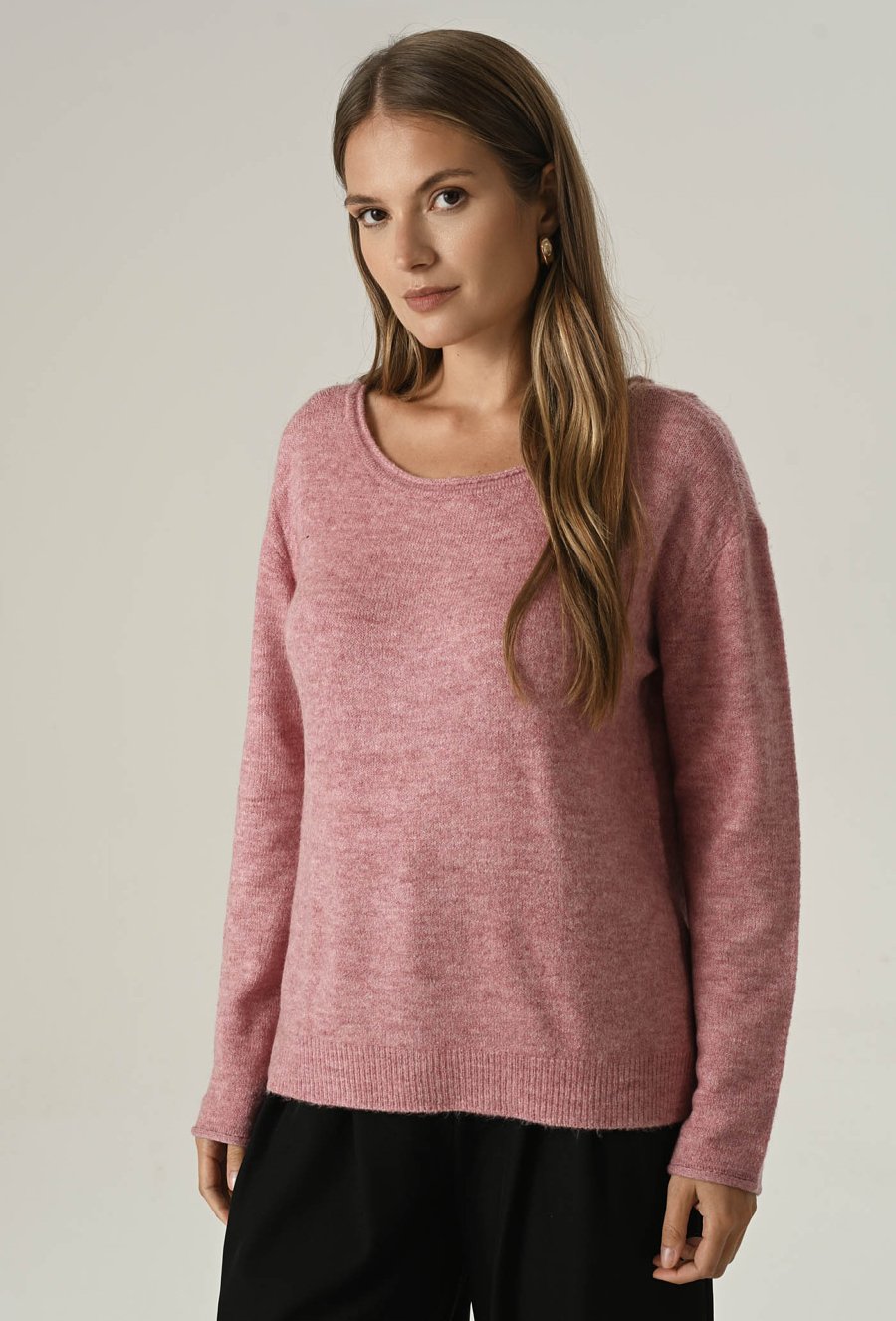 Klasyczny sweter damski o prostym, ponadczasowym kroju. Wykonany z miękkiej, przyjemnej w dotyku przędzy, zapewnia komfort noszenia przez cały dzień. Model z okrągłym dekoltem i subtelnym pęknięciem po bokach dodaje lekkości i swobody ruchu. Idealny jako baza codziennych stylizacji – świetnie komponuje się z jeansami, spódnicą czy pod marynarkę. Modelka na zdjęciu ma 177 cm wzrostu i prezentuje rozmiar 36/S.