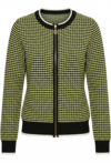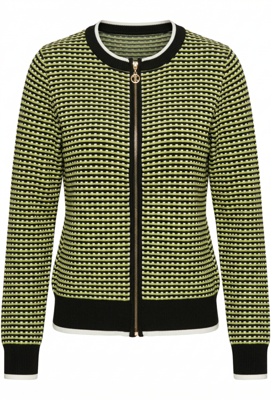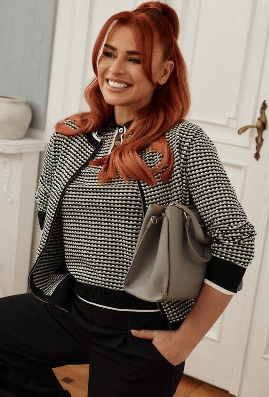 Sweter damski o klasycznym kroju z efektownym, geometrycznym wzorem. Sweter ma okrągły dekolt, długie rękawy oraz kontrastowe ściągacze przy mankietach i u dołu. Sweter zapinany jest na zamek, dzięki czemu świetnie sprawdzi się jako lekkie okrycie na co dzień. Modelka na zdjęciu ma 177 cm wzrostu i prezentuje rozmiar S.