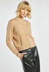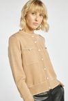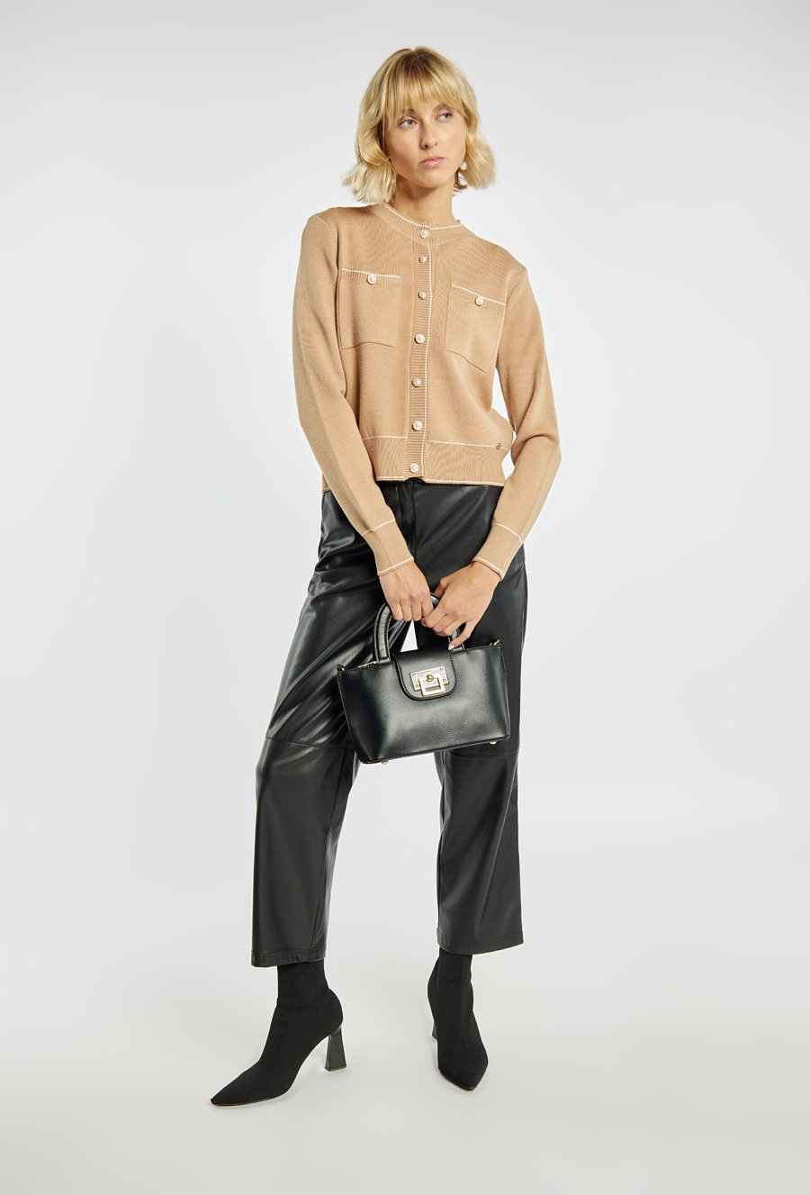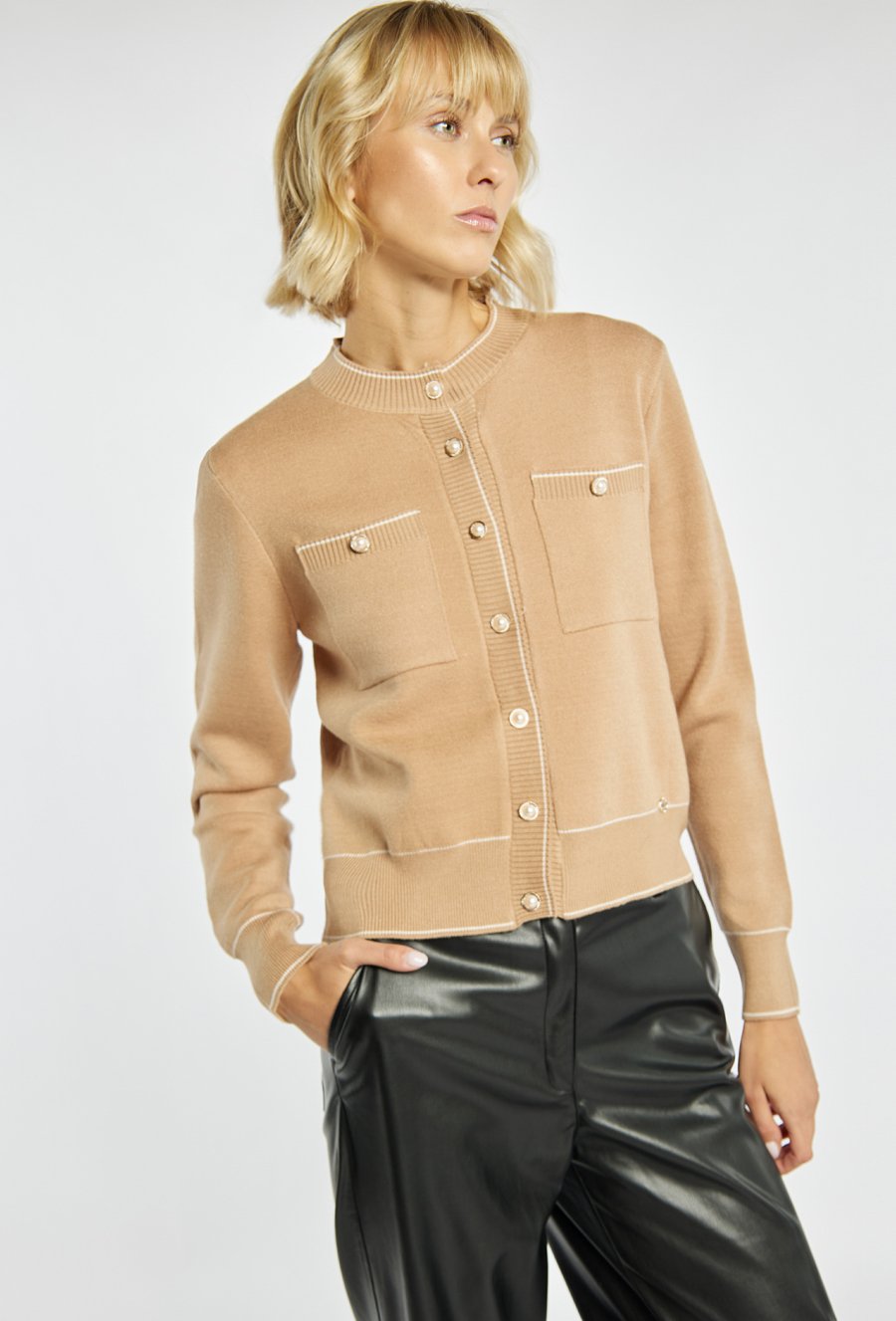 Stylowy sweter zapinany na guziki, o klasycznym kroju z ozdobnymi przeszyciami i kieszonkami. Sweter z okrągłym dekoltem i długimi rękawami. Idealny wybór do eleganckich i codziennych stylizacji. Modelka na zdjęciu ma 177 cm wzrostu i prezentuje rozmiar S/M.