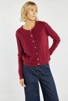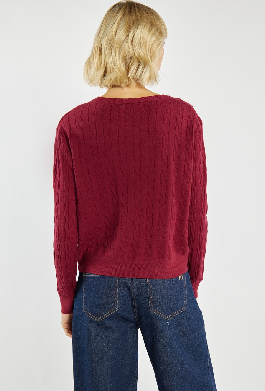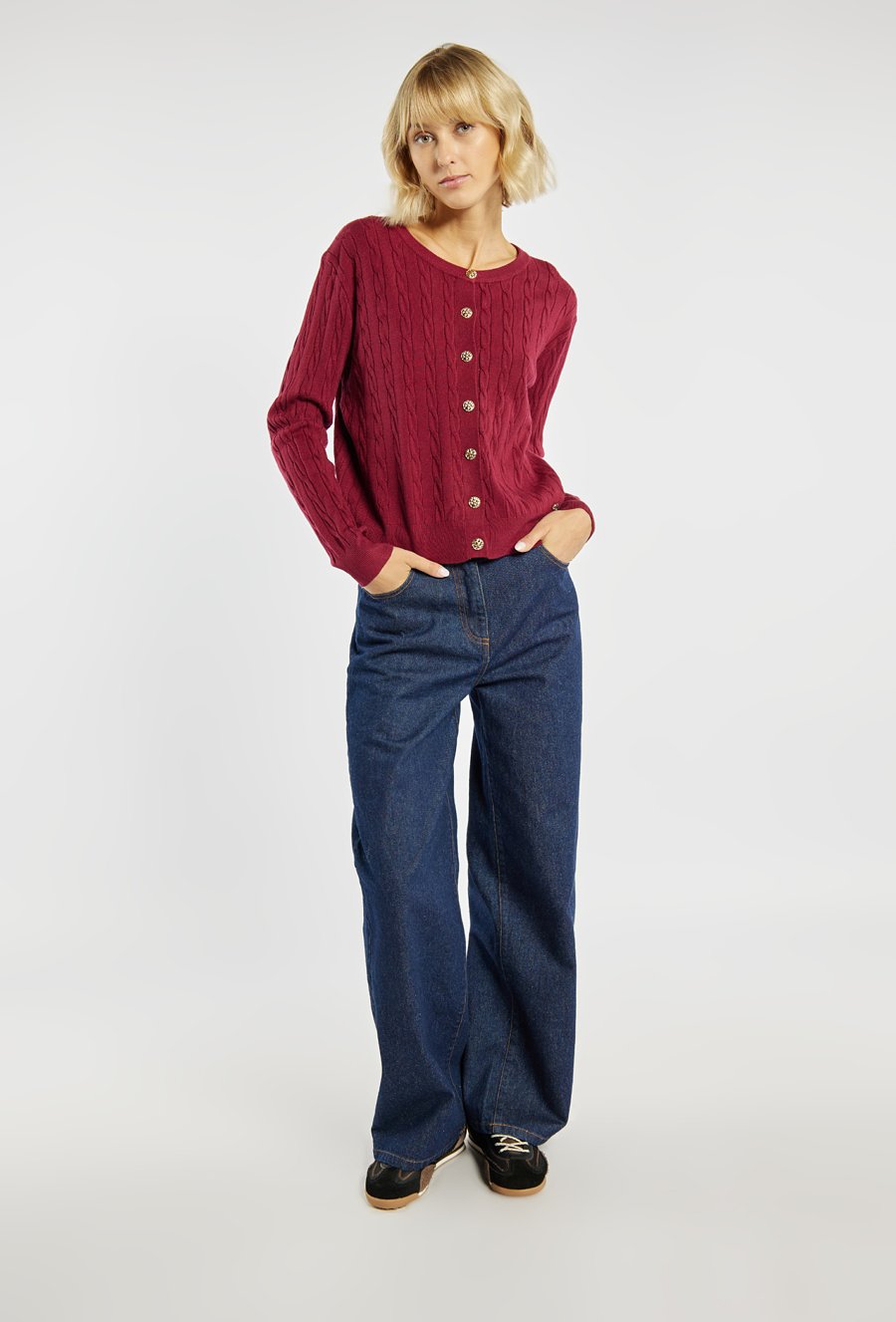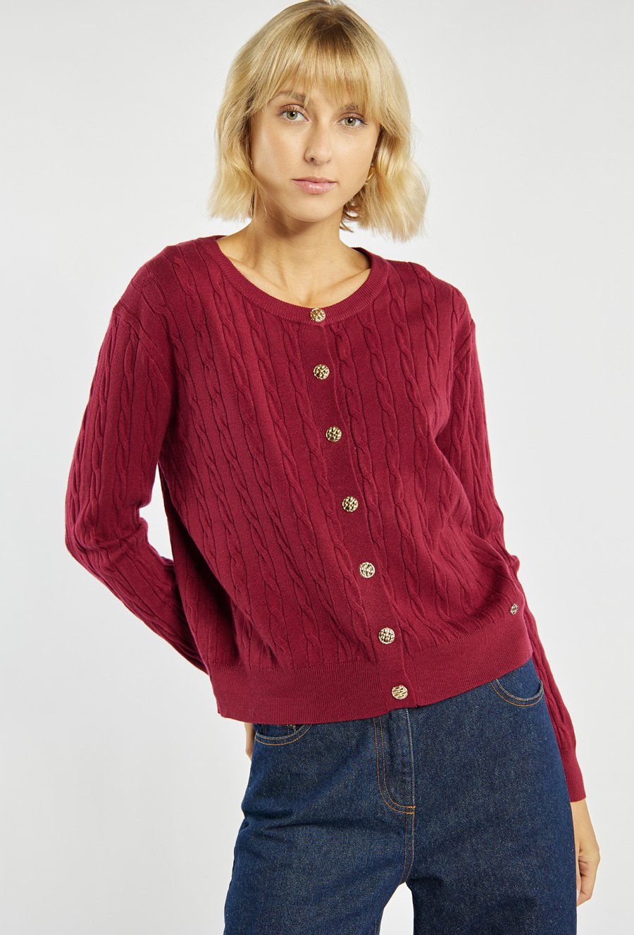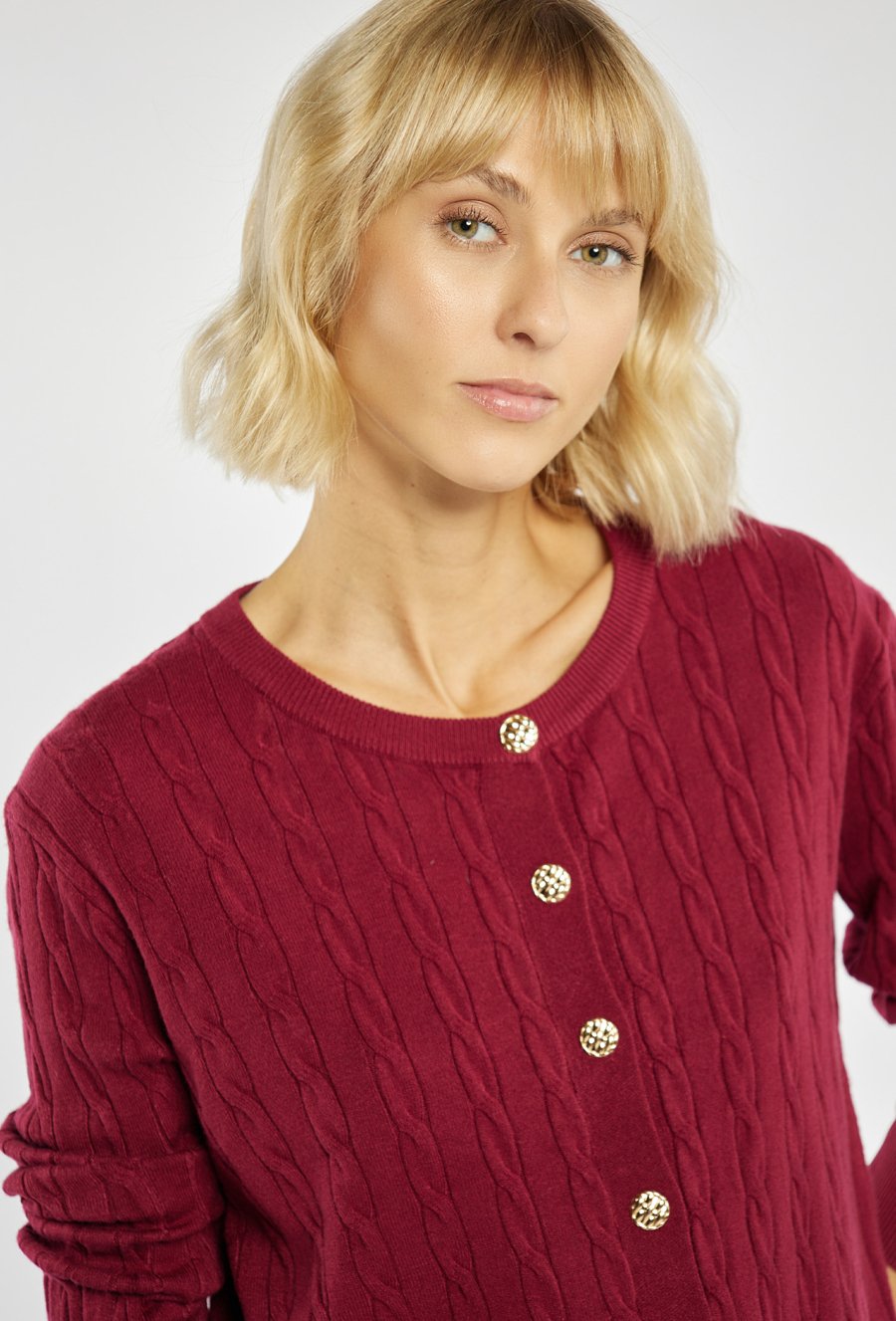 Sweter o klasycznym kroju z delikatnym, warkoczowym splotem. Zapinany na ozdobne guziki, które dodają mu elegancji. Model z okrągłym dekoltem i długimi rękawami, idealny na co dzień. Modelka na zdjęciu ma 177 cm wzrostu i prezentuje rozmiar S/M.