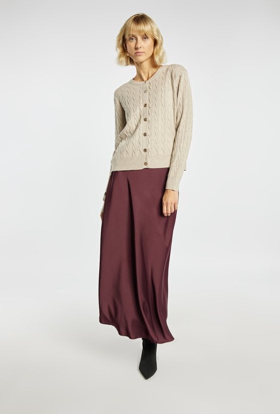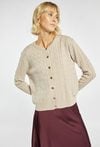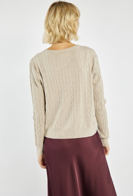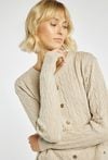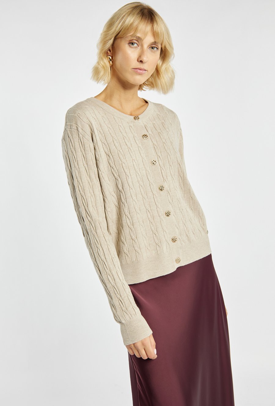 Sweter o klasycznym kroju z delikatnym, warkoczowym splotem. Zapinany na ozdobne guziki, które dodają mu elegancji. Model z okrągłym dekoltem i długimi rękawami, idealny na co dzień. Modelka na zdjęciu ma 177 cm wzrostu i prezentuje rozmiar S/M.