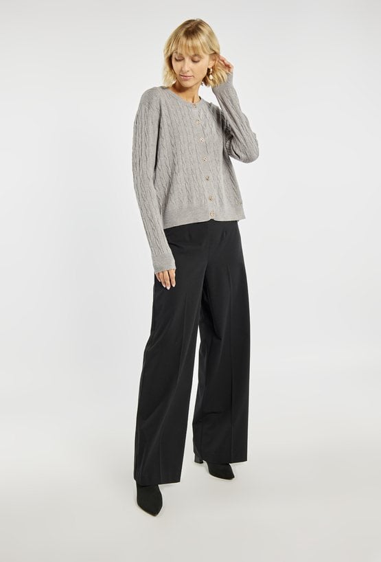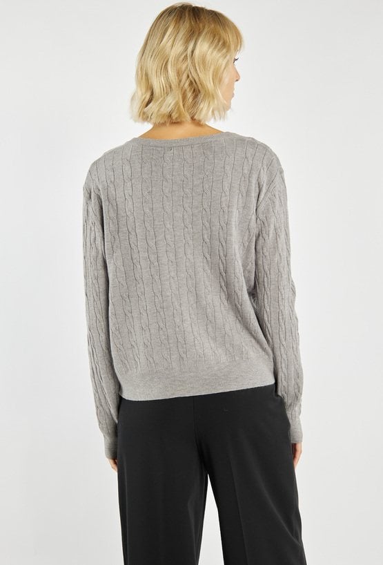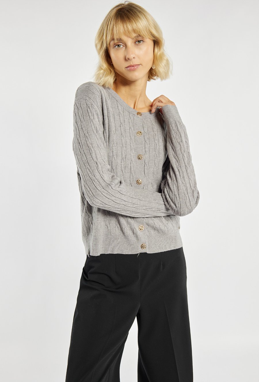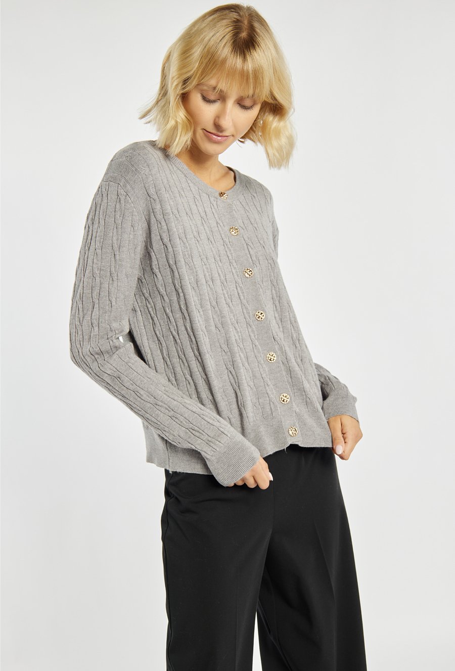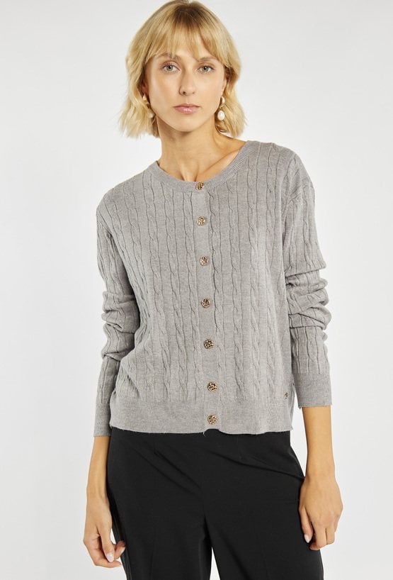 Sweter o klasycznym kroju z delikatnym, warkoczowym splotem. Zapinany na ozdobne guziki, które dodają mu elegancji. Model z okrągłym dekoltem i długimi rękawami, idealny na co dzień. Modelka na zdjęciu ma 177 cm wzrostu i prezentuje rozmiar S/M.