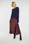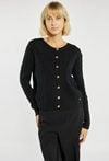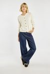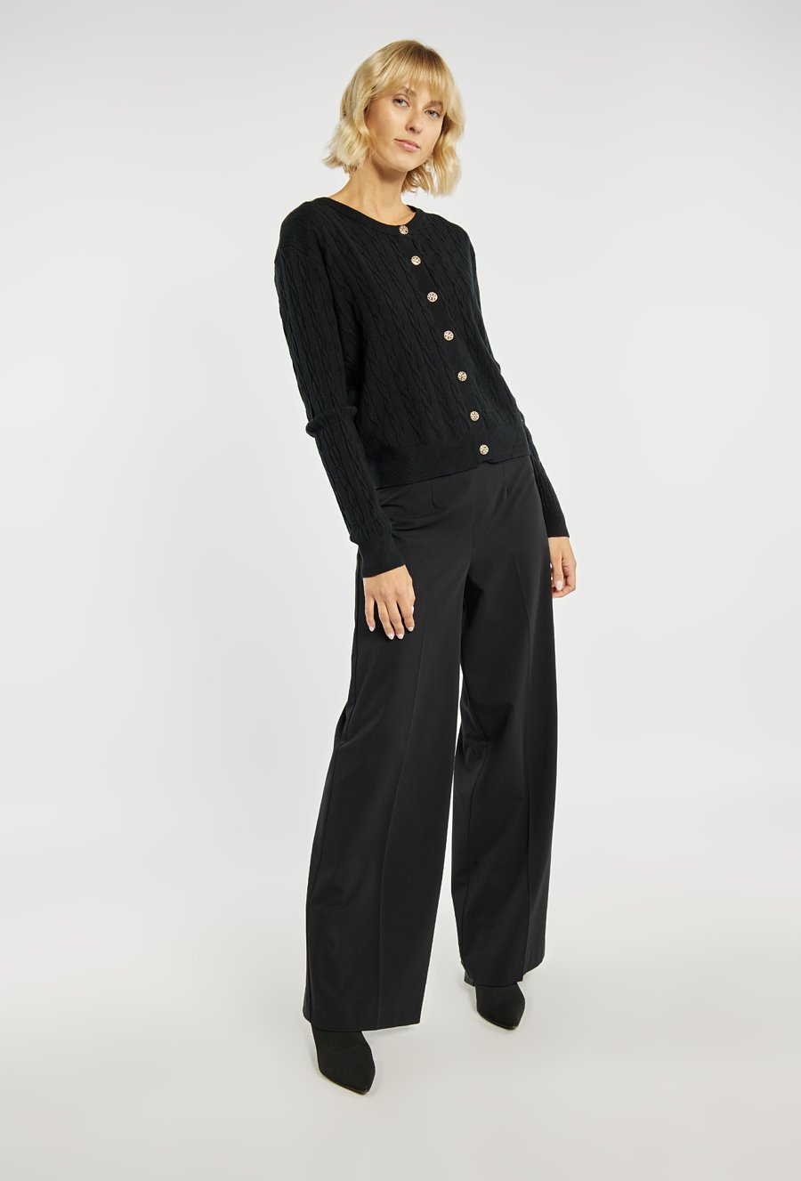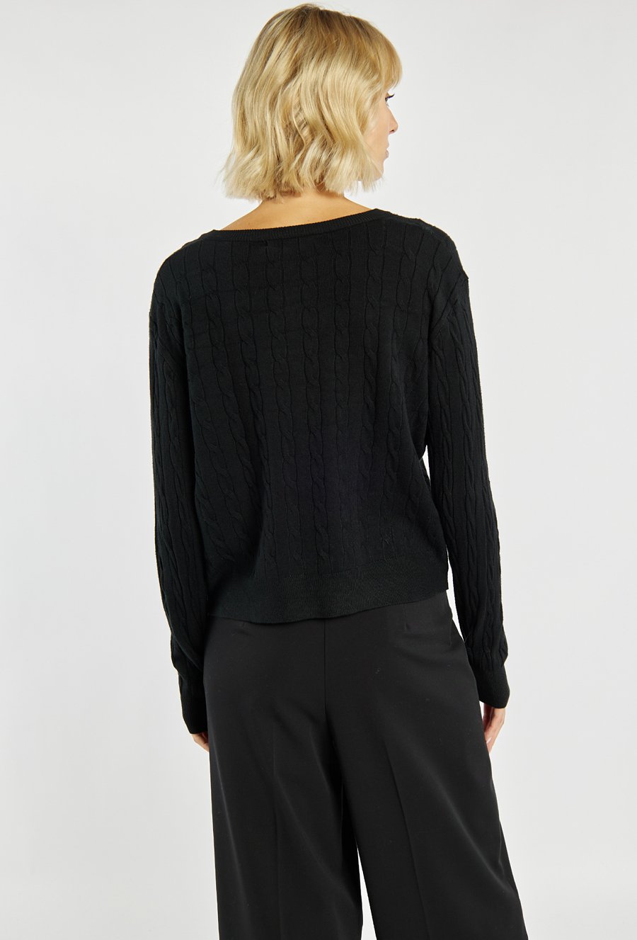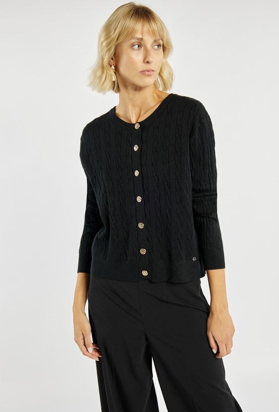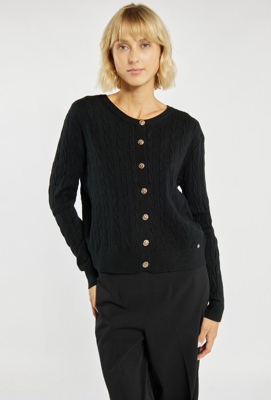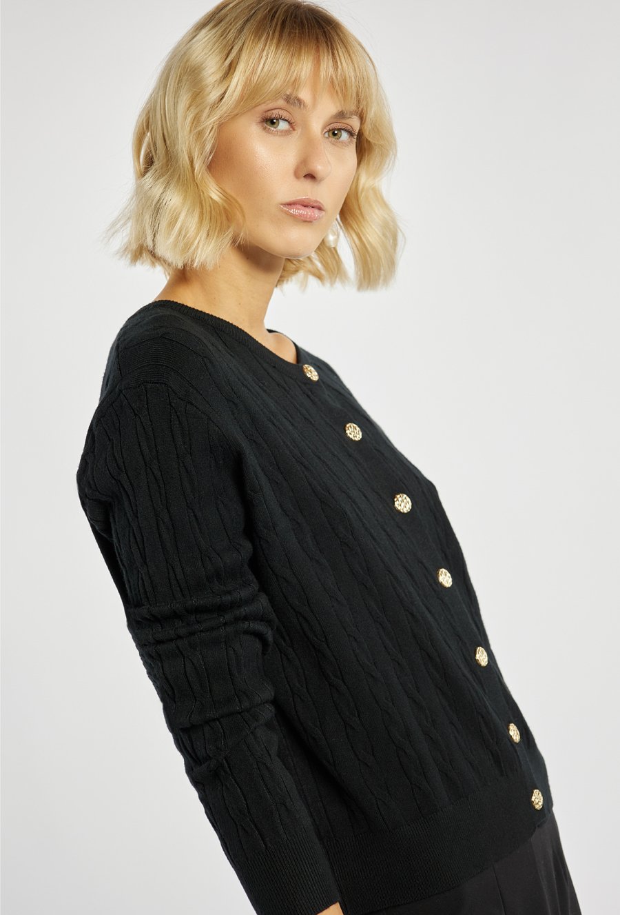Sweter o klasycznym kroju z delikatnym, warkoczowym splotem. Zapinany na ozdobne guziki, które dodają mu elegancji. Model z okrągłym dekoltem i długimi rękawami, idealny na co dzień. Modelka na zdjęciu ma 177 cm wzrostu i prezentuje rozmiar S/M.