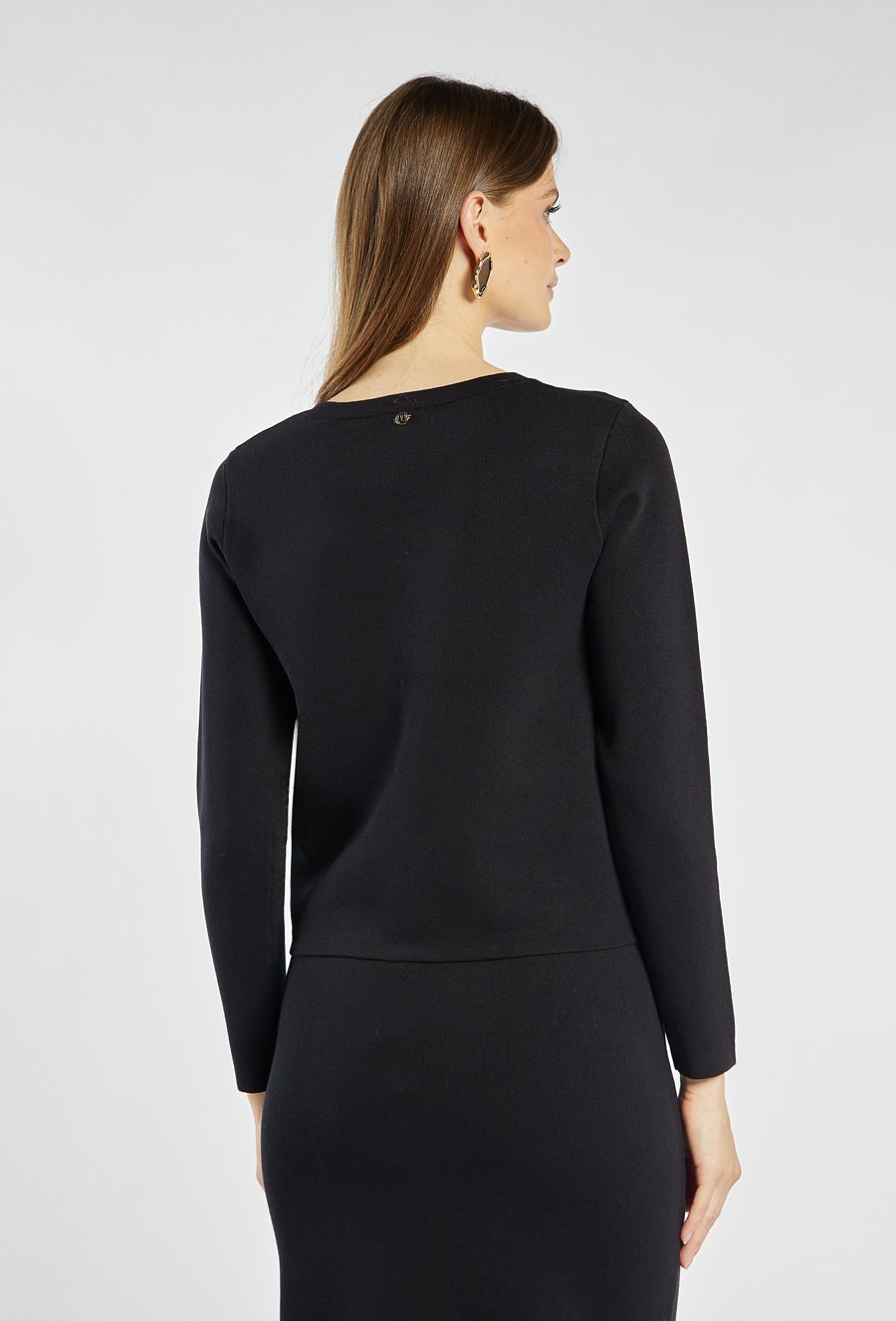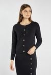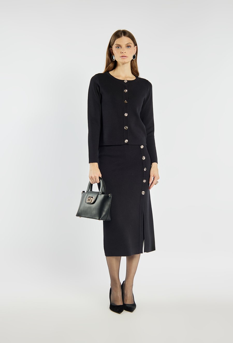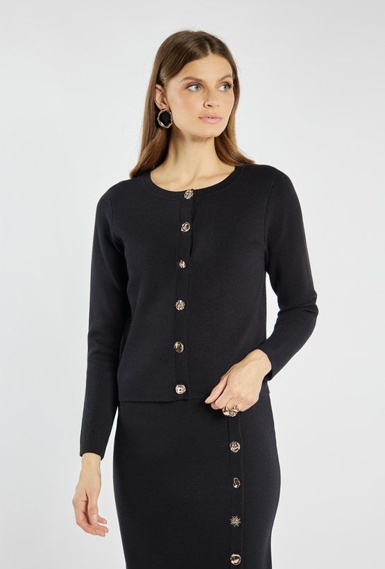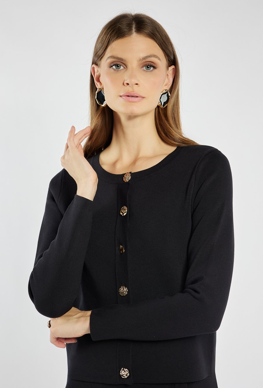 Stylowy sweter o klasycznym kroju, zapinany na efektowne guziki, z których każdy ma unikalny design, dodając całości niepowtarzalnego charakteru. Doskonale prezentuje się zarówno samodzielnie, jak i w komplecie ze spódnicą utrzymaną w tym samym stylu, tworząc elegancki, spójny zestaw. Kod do spódnicy: 25Z-SKR1070. Modelka na zdjęciu ma 177 cm wzrostu i prezentuje rozmiar S.