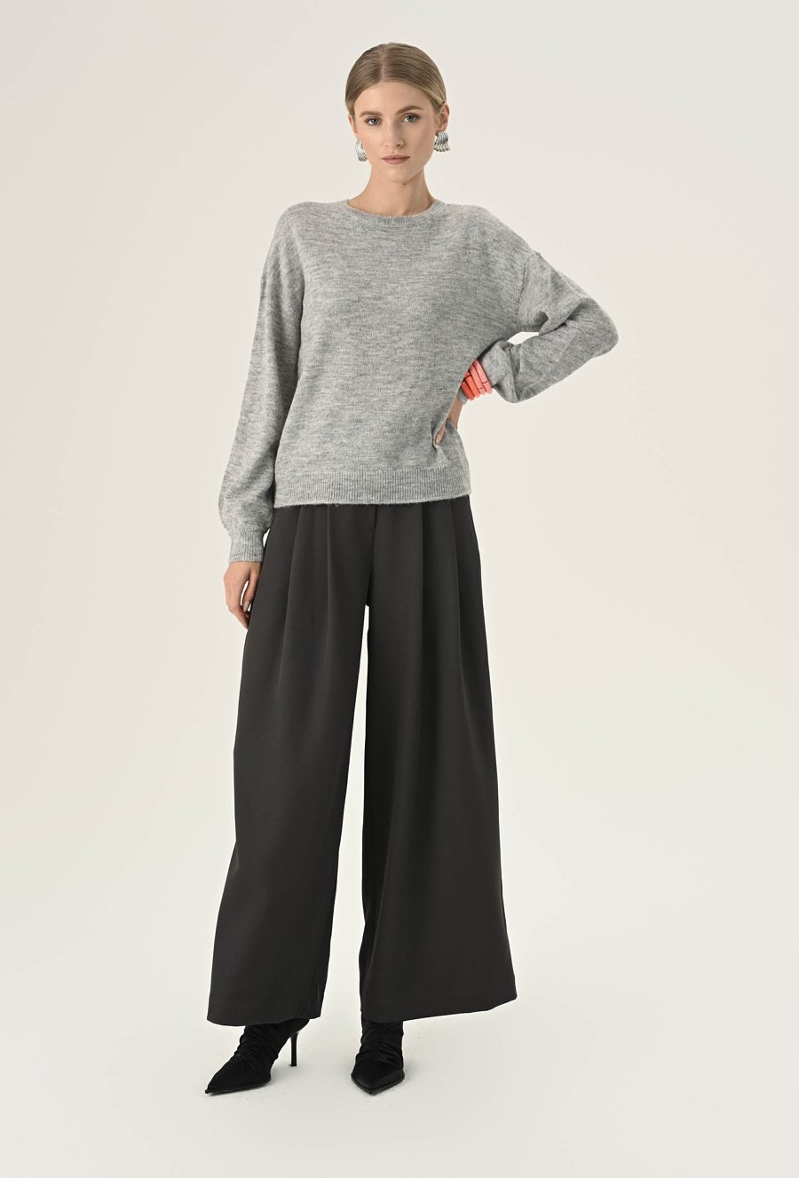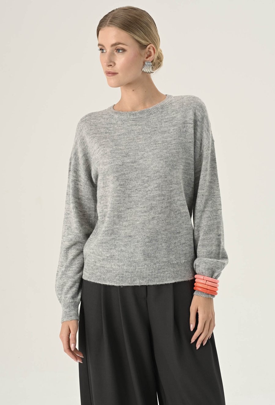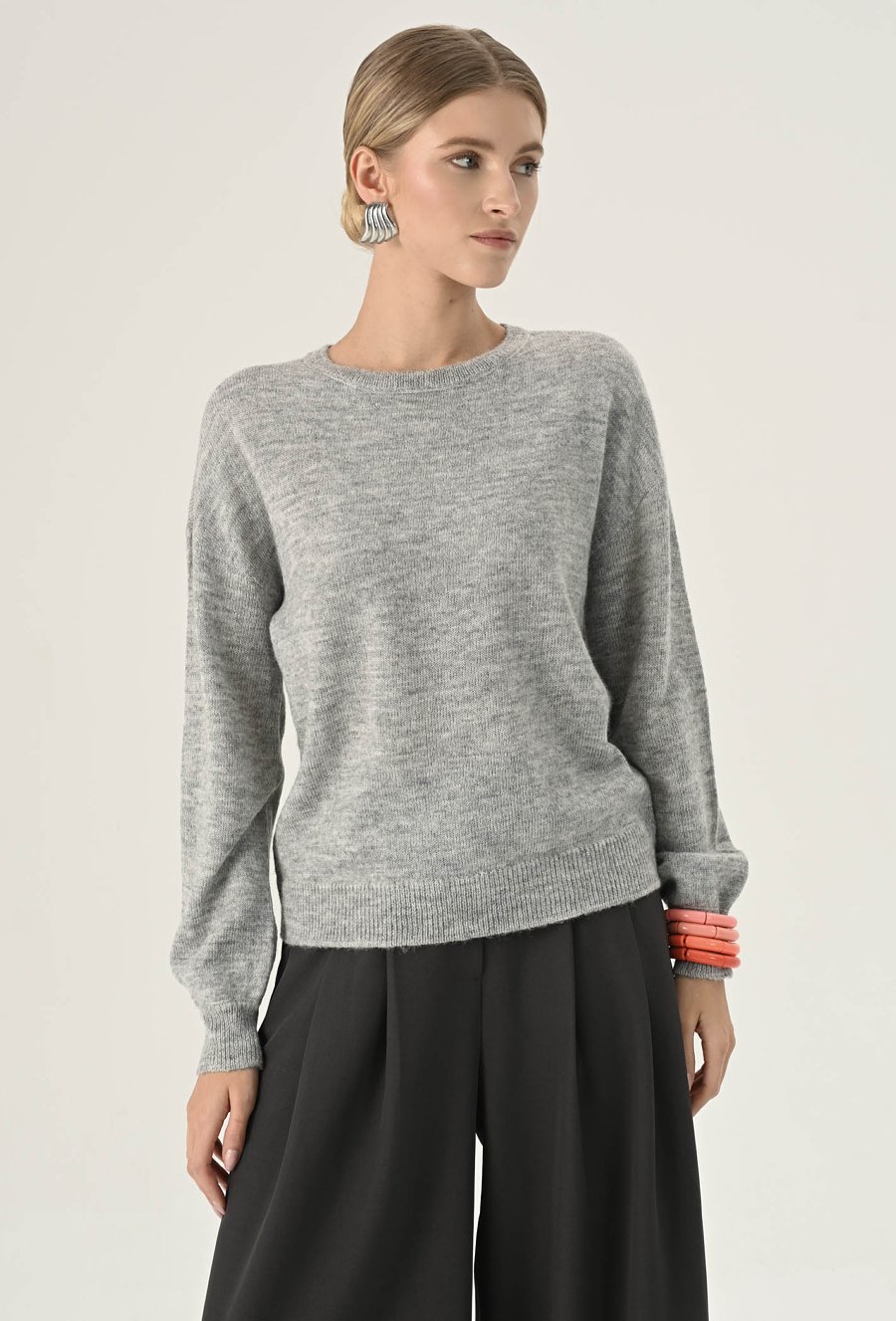 Ponadczasowy sweter o prostym, wygodnym kroju z delikatnie szerszymi rękawami, które dodają mu lekkości i nowoczesnego charakteru. Klasyczny okrągły dekolt pięknie układa się przy szyi, a miękka dzianina z domieszką wełny zapewnia ciepło i komfort noszenia. Idealny na co dzień – świetnie komponuje się zarówno z jeansami, jak i bardziej eleganckimi elementami garderoby. Modelka na zdjęciu ma 177 cm wzrostu i prezentuje rozmiar 36/S.