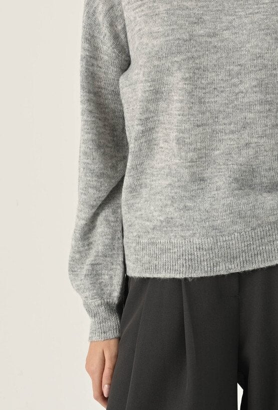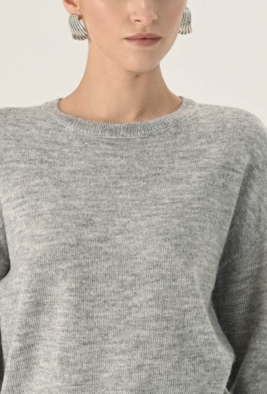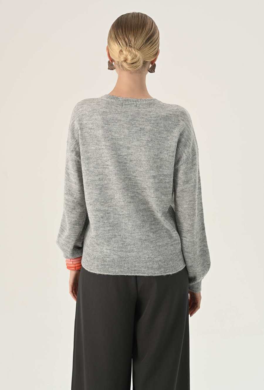 Ponadczasowy sweter o prostym, wygodnym kroju z delikatnie szerszymi rękawami, które dodają mu lekkości i nowoczesnego charakteru. Klasyczny okrągły dekolt pięknie układa się przy szyi, a miękka dzianina z domieszką wełny zapewnia ciepło i komfort noszenia. Idealny na co dzień – świetnie komponuje się zarówno z jeansami, jak i bardziej eleganckimi elementami garderoby. Modelka na zdjęciu ma 177 cm wzrostu i prezentuje rozmiar 36/S.
