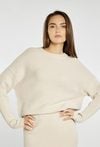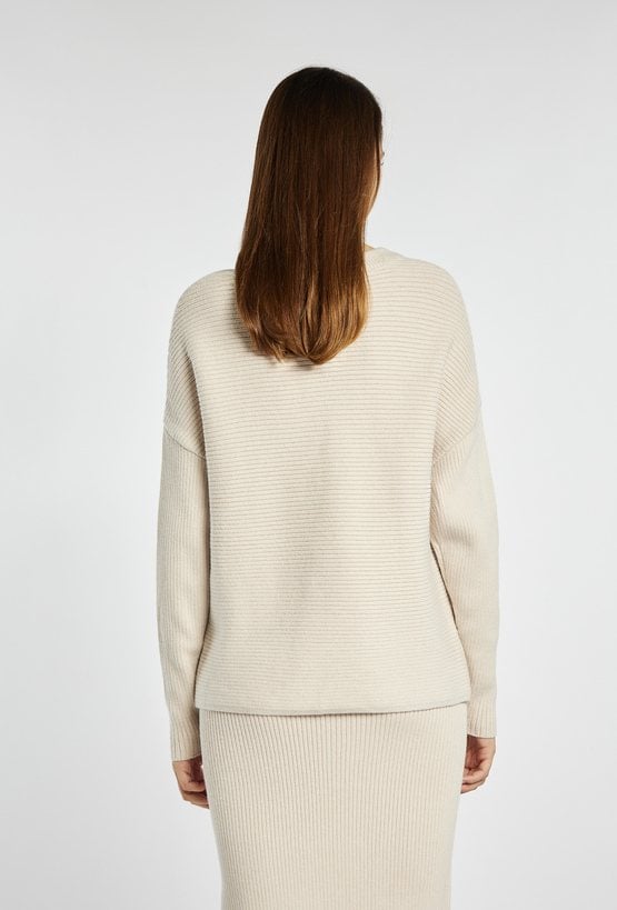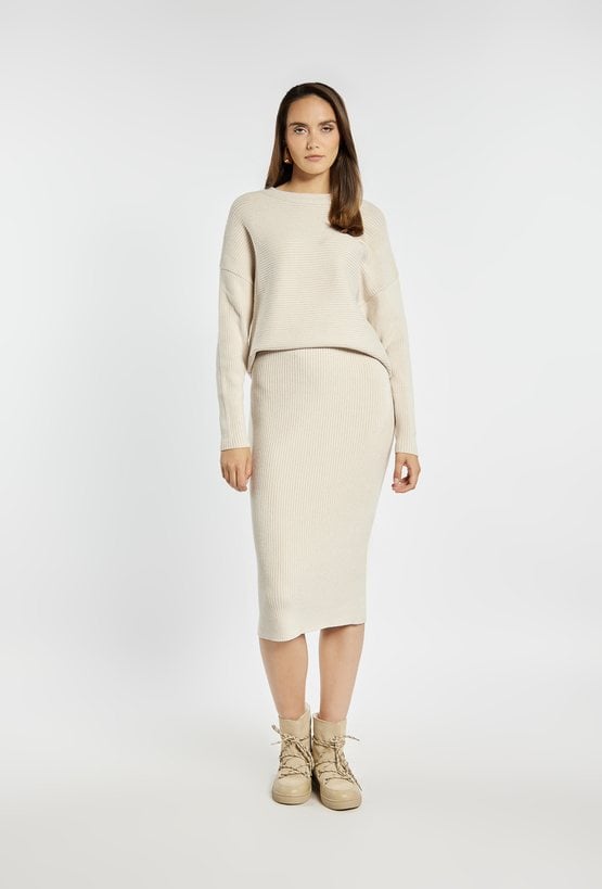 Sweter damski o swobodnym kroju. Sweter z obniżoną linią ramion i prostym wykończeniem dekoltu, który nadaje całości nowoczesnego charakteru. Komfortowy i uniwersalny, świetnie komponuje się zarówno ze spódnicą z kompletu, jak i klasycznymi spodniami. Idealny wybór na co dzień oraz do casualowych stylizacji. Modelka na zdjęciu ma 177 cm wzrostu i prezentuje rozmiar S.