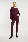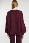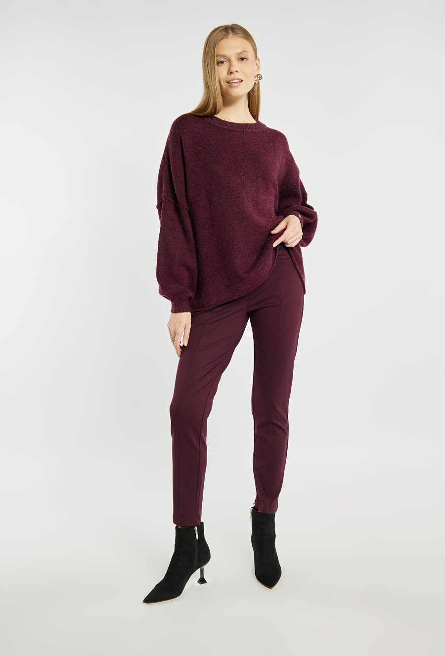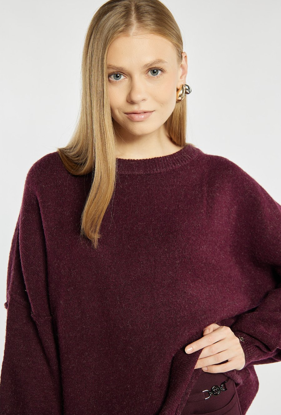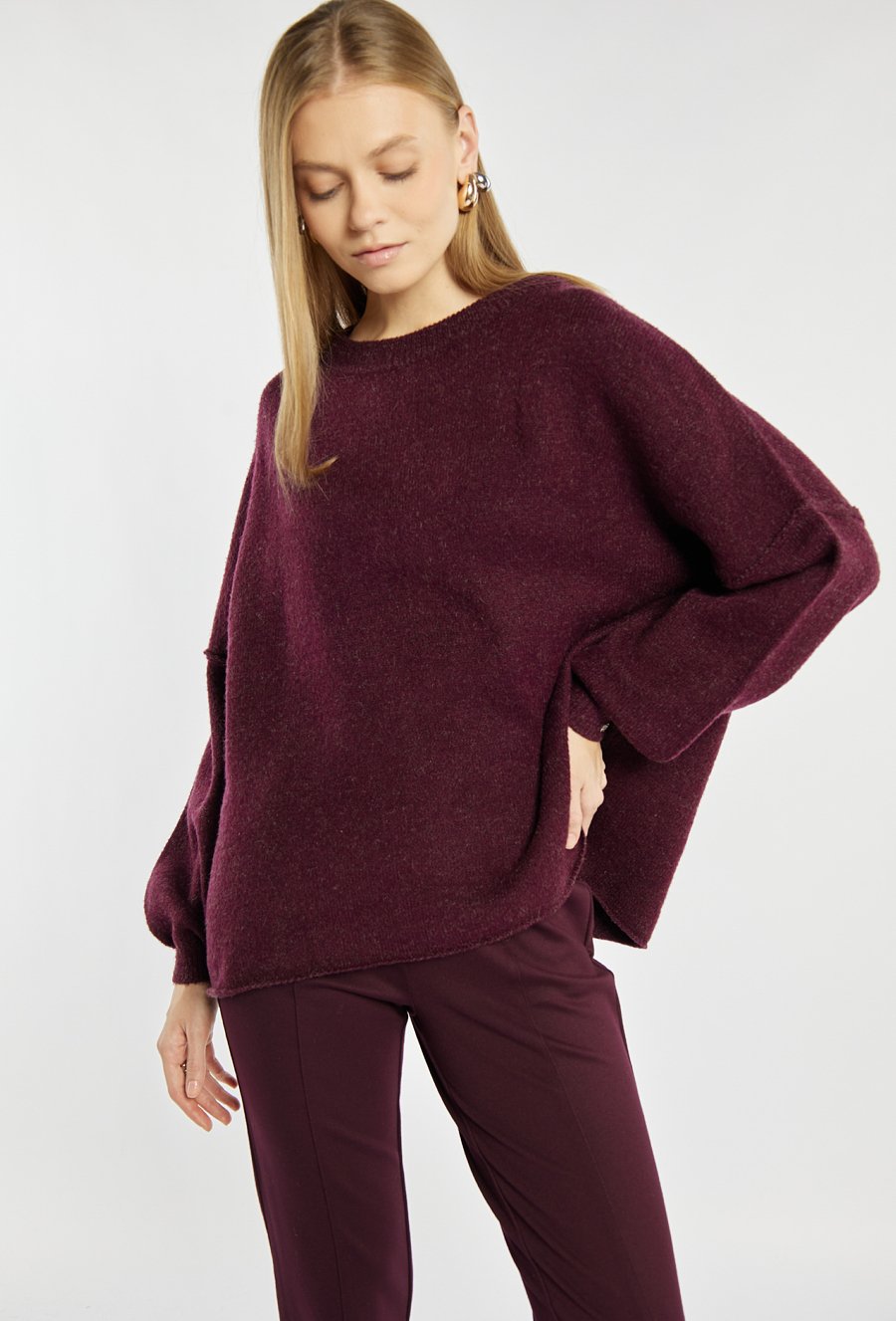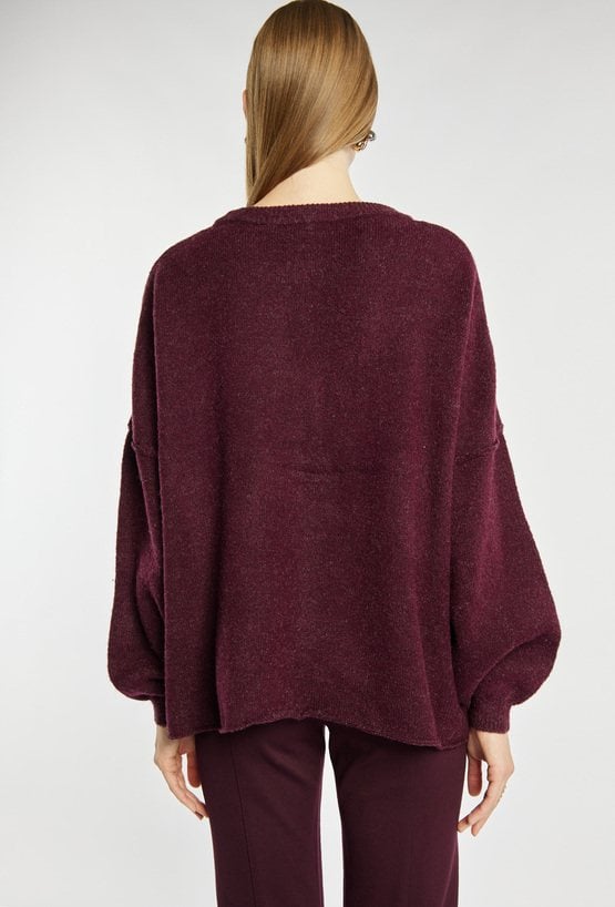 Damski sweter w odcieniu burgunda. Luźny, oversizowy fason z obniżoną linią ramion i szerokimi rękawami zakończonymi ściągaczem. Sweter idealnie wpisuje się w casualowe, codzienne stylizacje. Modelka na zdjęciu ma 177 cm wzrostu i prezentuje rozmiar S/M.