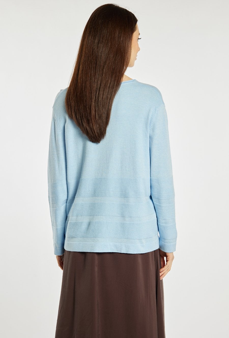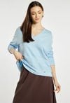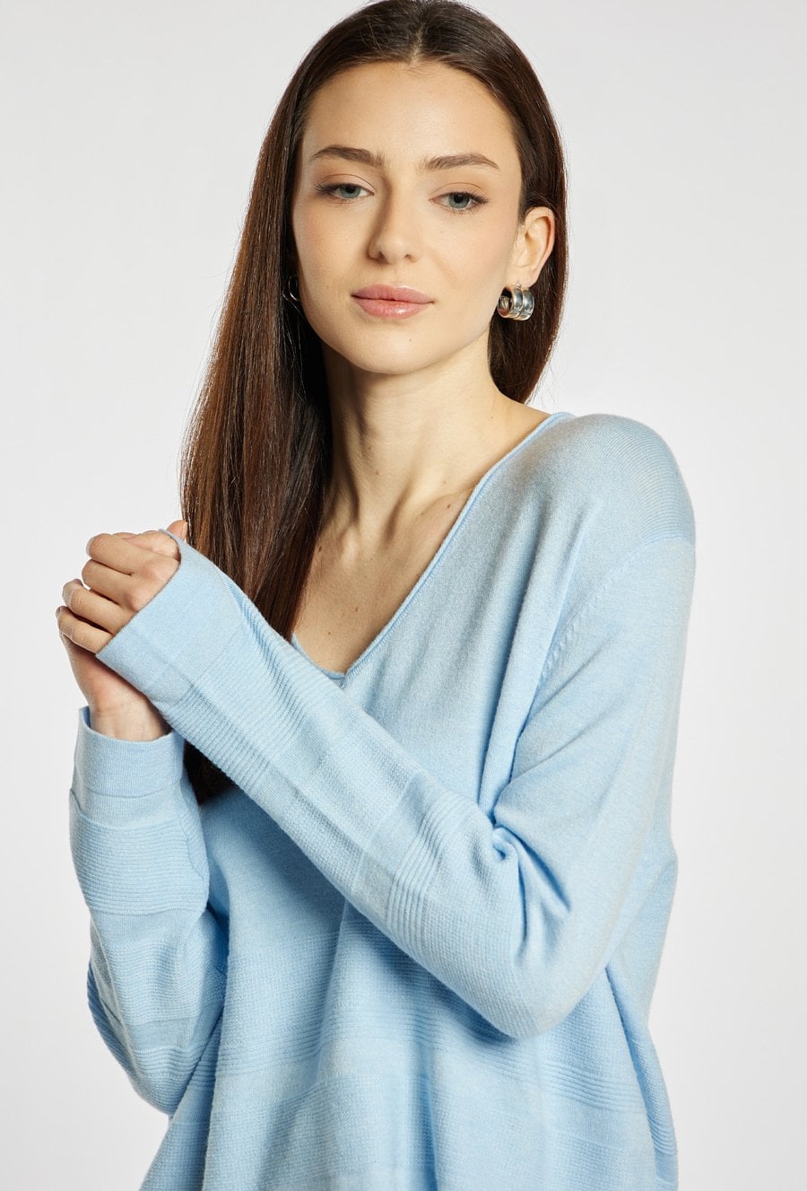 Sweter damski o luźnym, komfortowym kroju. Model z długim rękawem oraz dekoltem w kształcie litery V, który subtelnie podkreśla linię szyi. Sweter damski o luźnym, komfortowym kroju. Model z długim rękawem oraz dekoltem w kształcie litery V, który subtelnie podkreśla linię szyi. Przód zdobią delikatne, poziome przeszycia. Sweter doskonale sprawdzi się w codziennych stylizacjach. Modelka na zdjęciu ma 177 cm wzrostu i prezentuje rozmiar S/M.