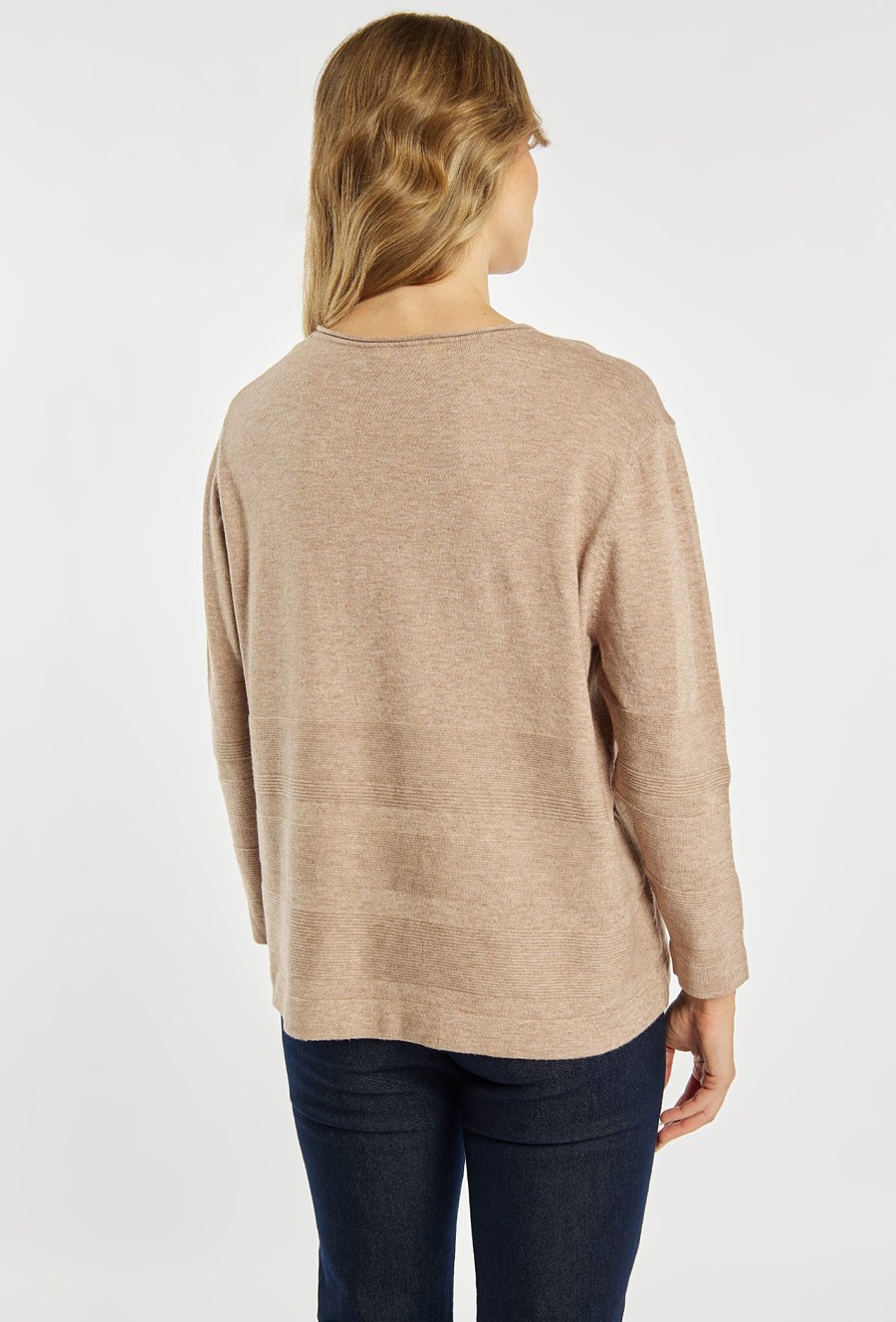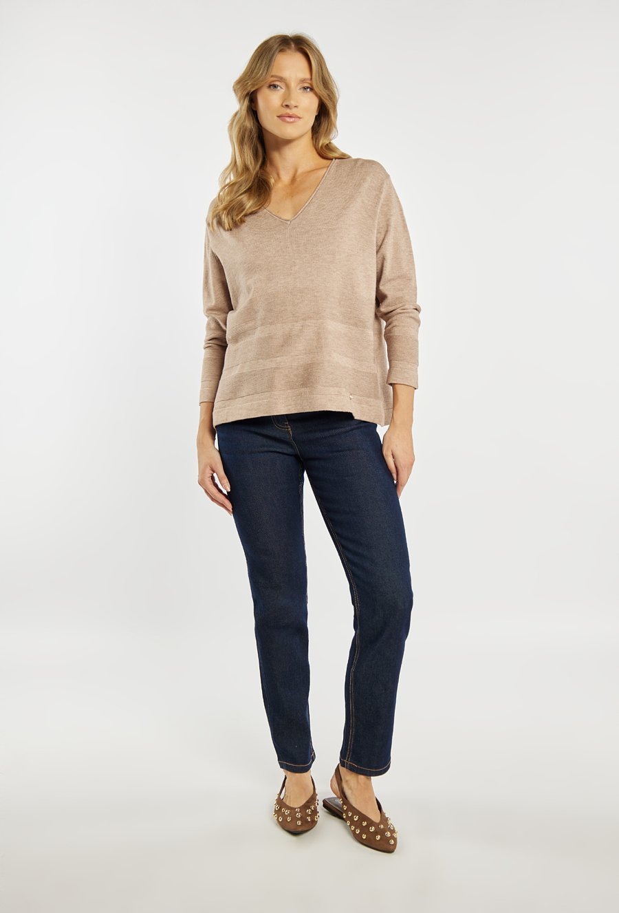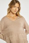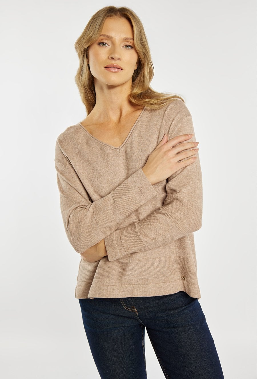 Sweter damski o luźnym, komfortowym kroju. Model z długim rękawem oraz dekoltem w kształcie litery V, który subtelnie podkreśla linię szyi. Sweter damski o luźnym, komfortowym kroju. Model z długim rękawem oraz dekoltem w kształcie litery V, który subtelnie podkreśla linię szyi. Przód zdobią delikatne, poziome przeszycia. Sweter doskonale sprawdzi się w codziennych stylizacjach. Modelka na zdjęciu ma 177 cm wzrostu i prezentuje rozmiar S/M.