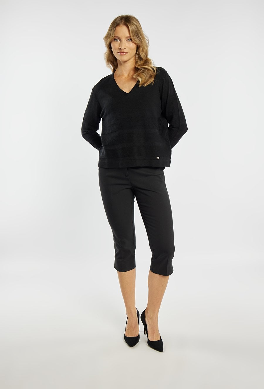 Sweter damski o luźnym, komfortowym kroju. Model z długim rękawem oraz dekoltem w kształcie litery V, który subtelnie podkreśla linię szyi. Sweter damski o luźnym, komfortowym kroju. Model z długim rękawem oraz dekoltem w kształcie litery V, który subtelnie podkreśla linię szyi. Przód zdobią delikatne, poziome przeszycia. Sweter doskonale sprawdzi się w codziennych stylizacjach. Modelka na zdjęciu ma 177 cm wzrostu i prezentuje rozmiar S/M.